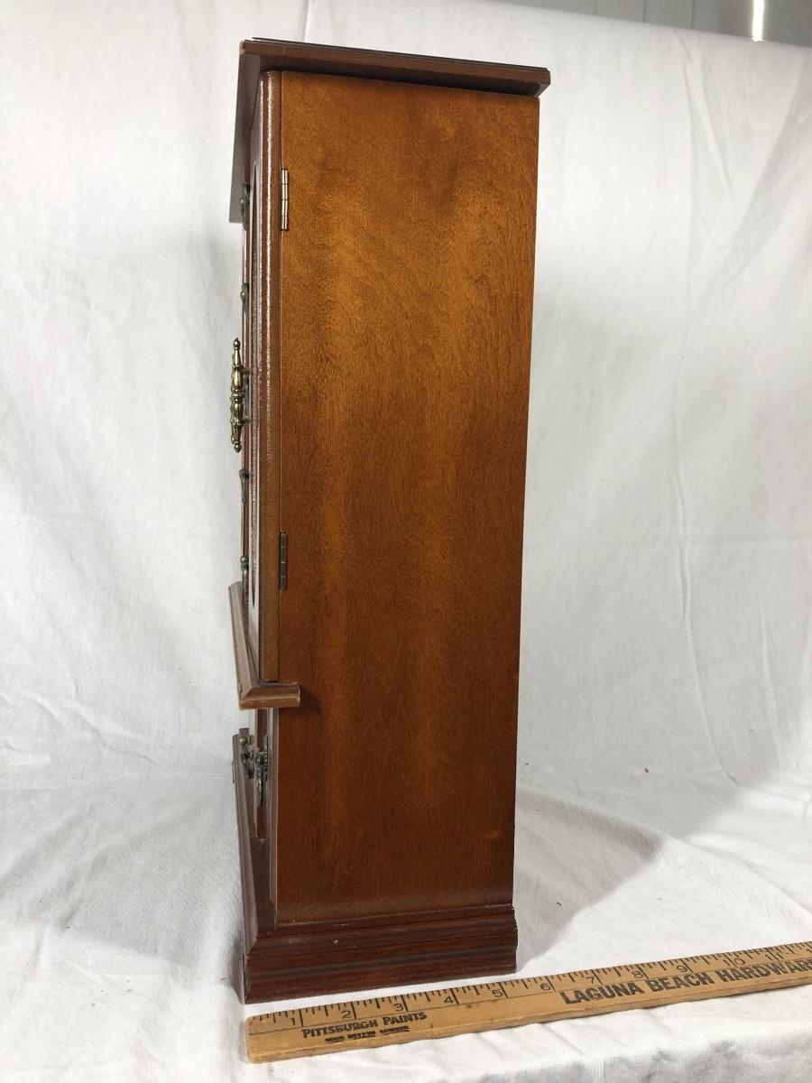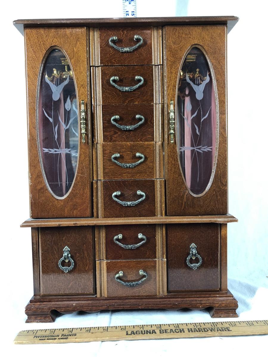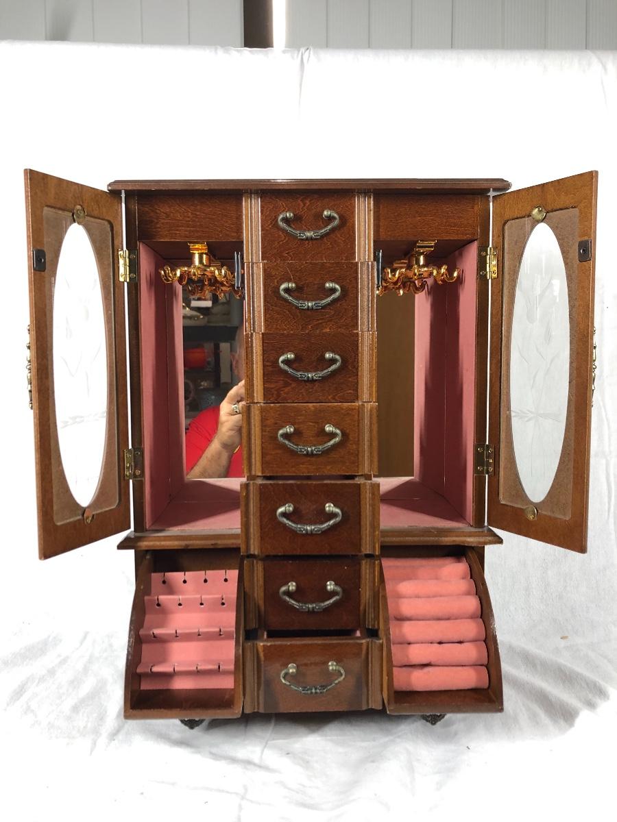 Vintage wood jewelry box. Two necklace hanging areas, drawers and ring spots. Vintage condition. About 18" tall.