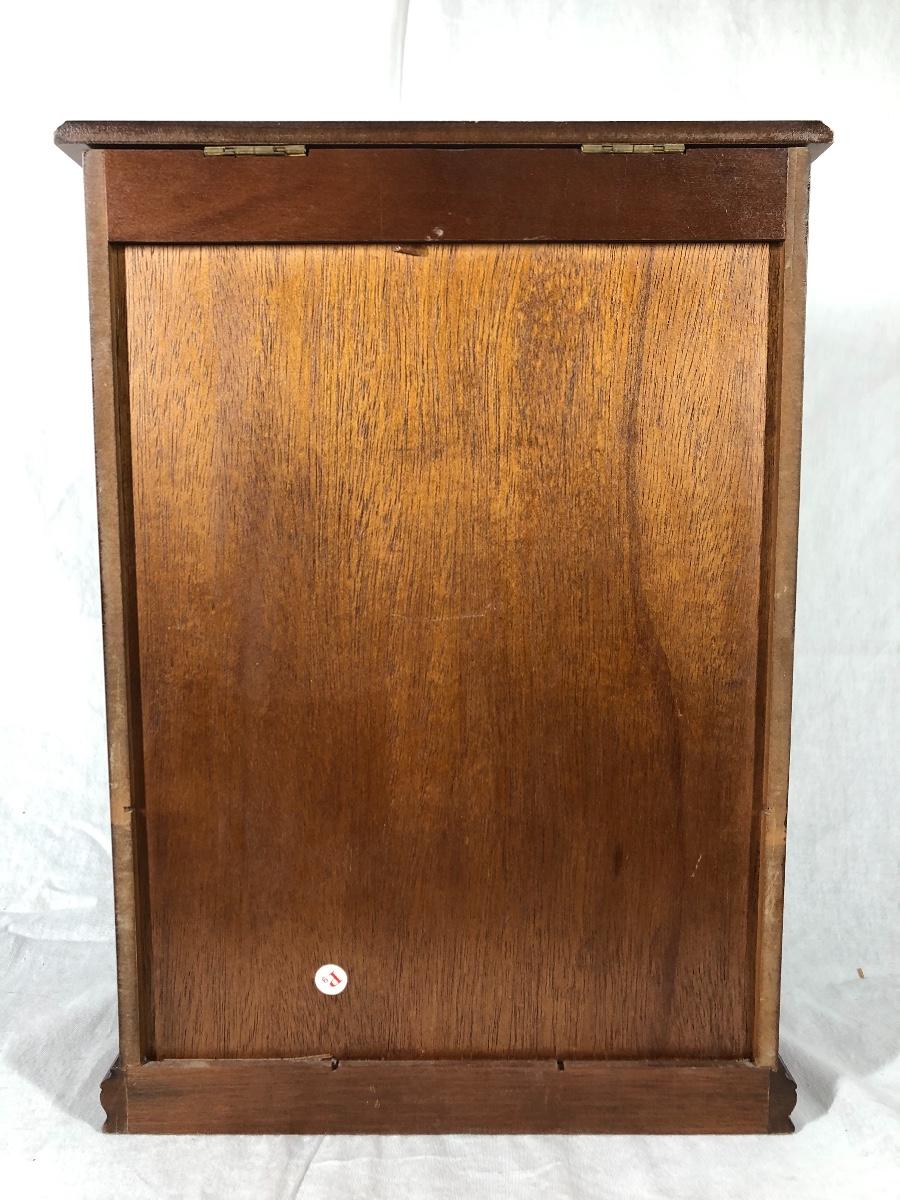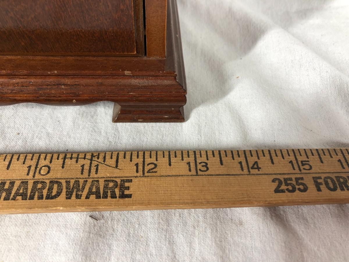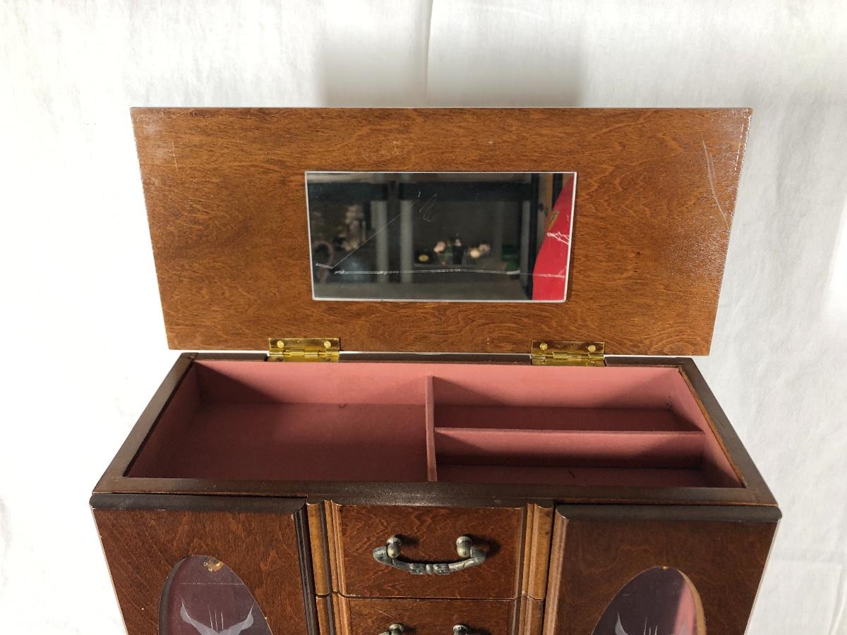 Vintage wood jewelry box. Two necklace hanging areas, drawers and ring spots. Vintage condition. About 18" tall.