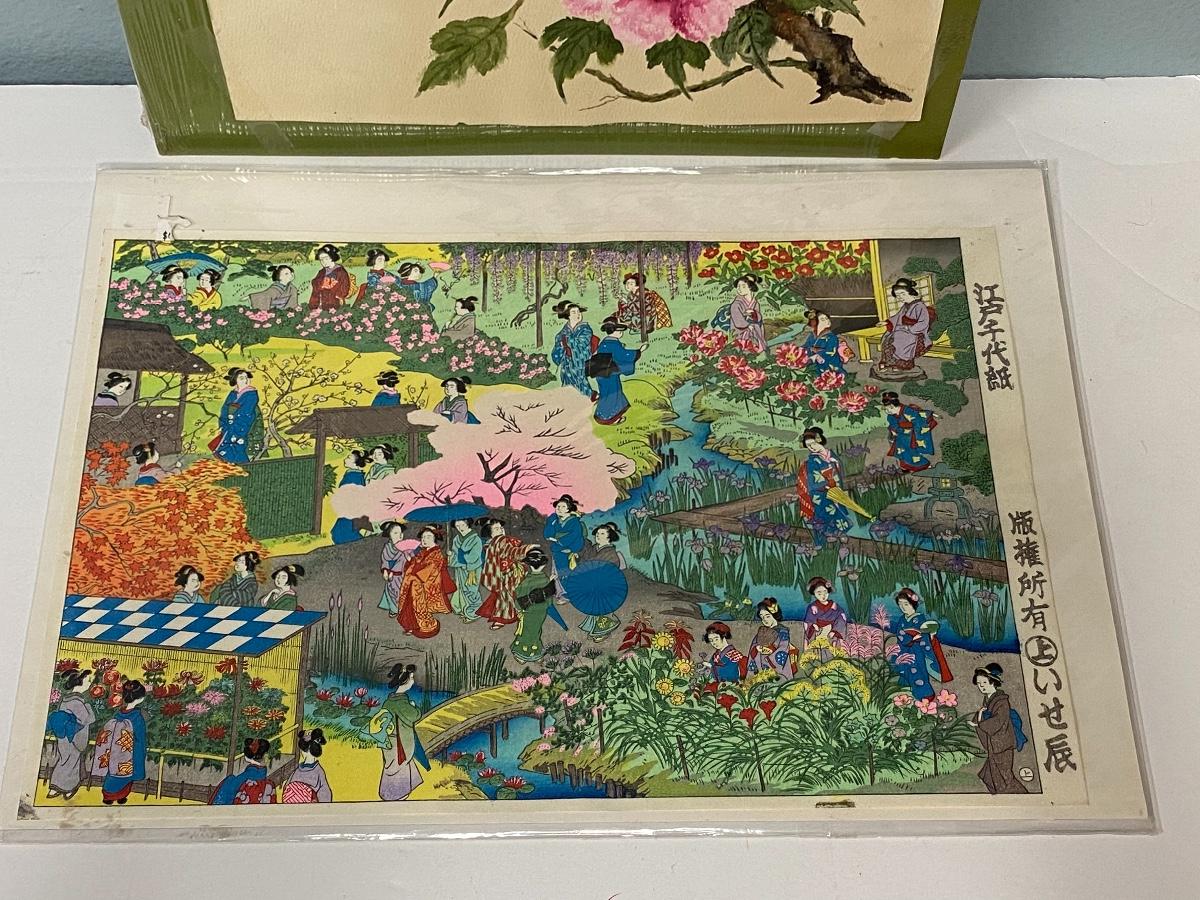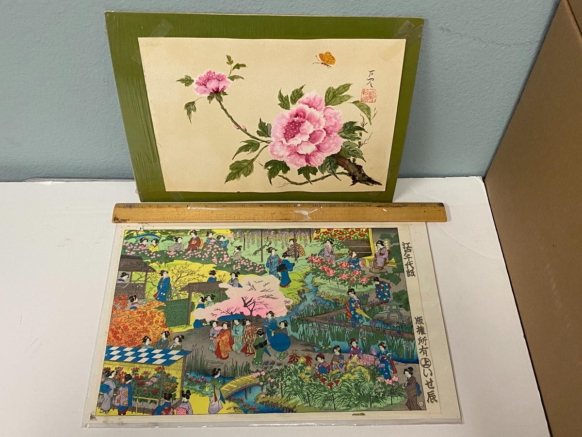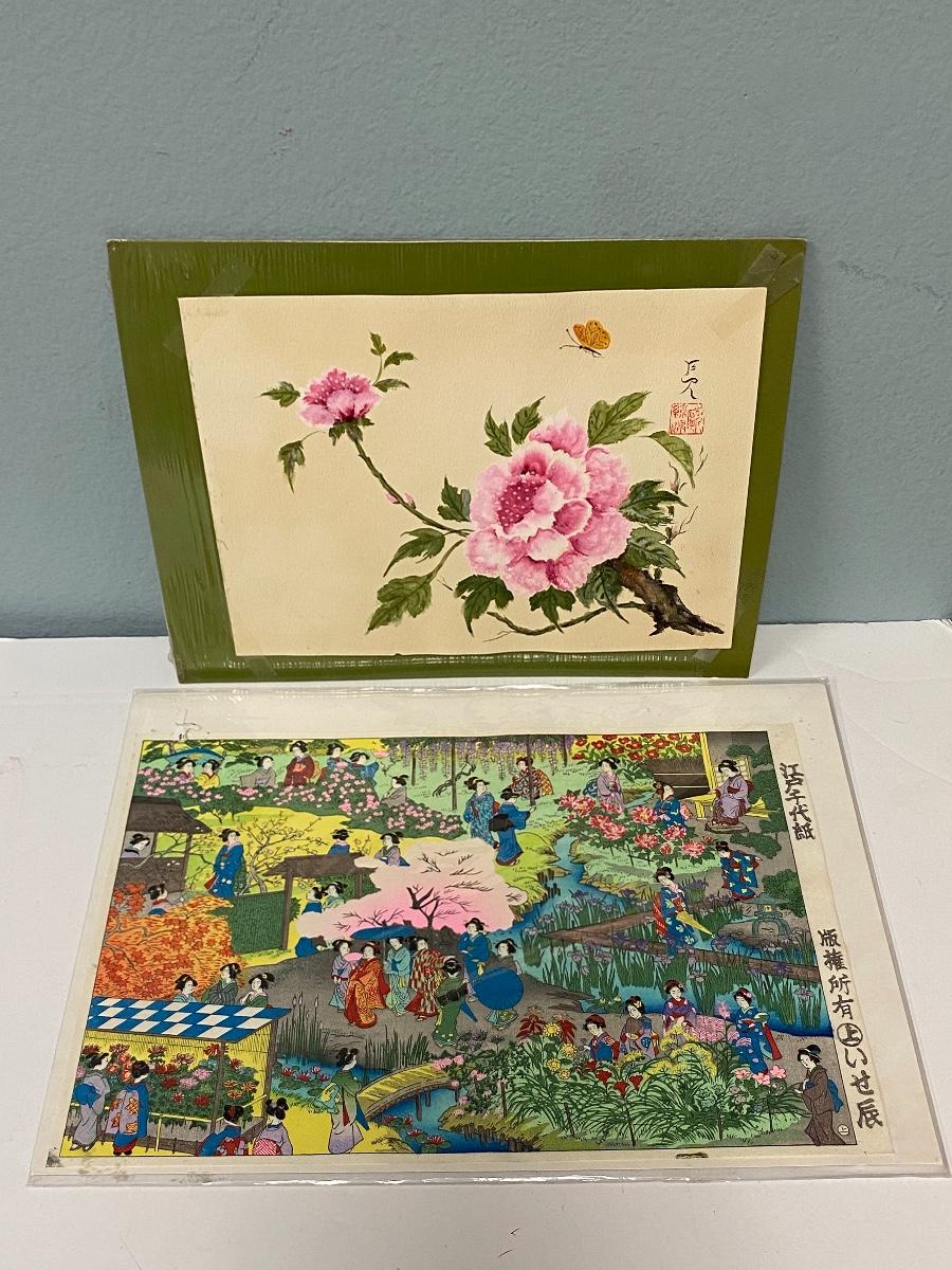 Pair of Asian unframed painting prints. Colorful, nicely done. Under 17" size.