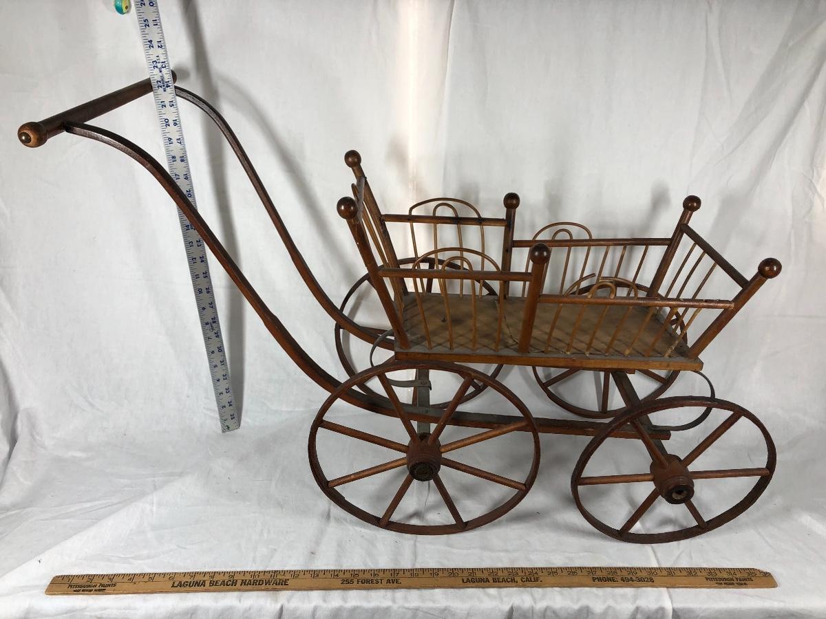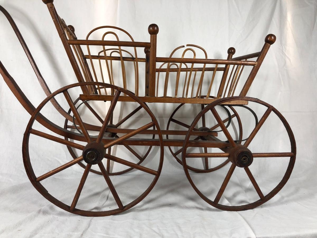Vintage baby doll stroller. Wicker baby buggy, has some signs of age, displays nice. About 3' length.