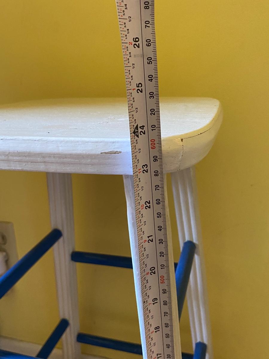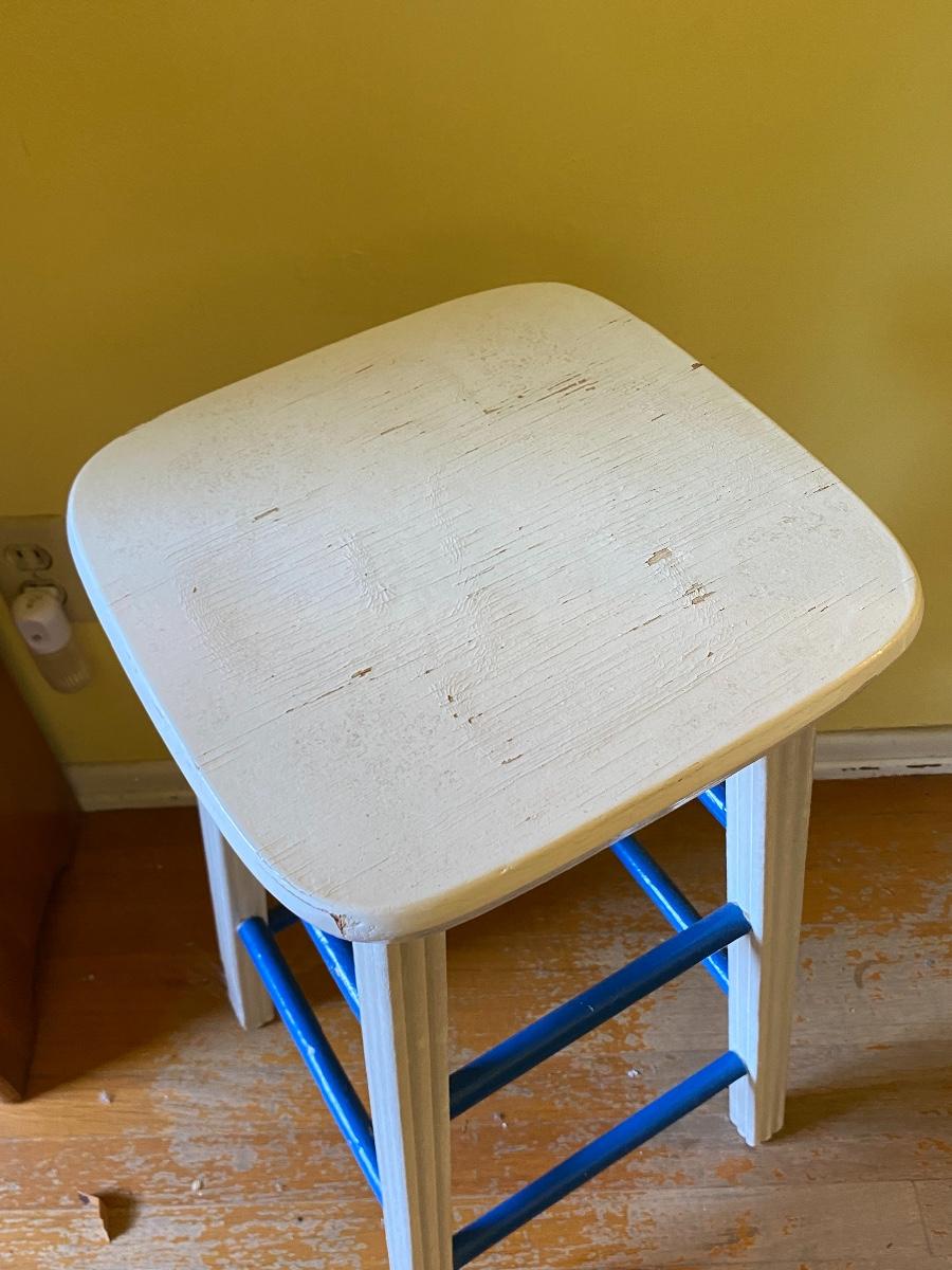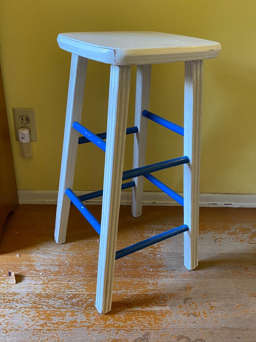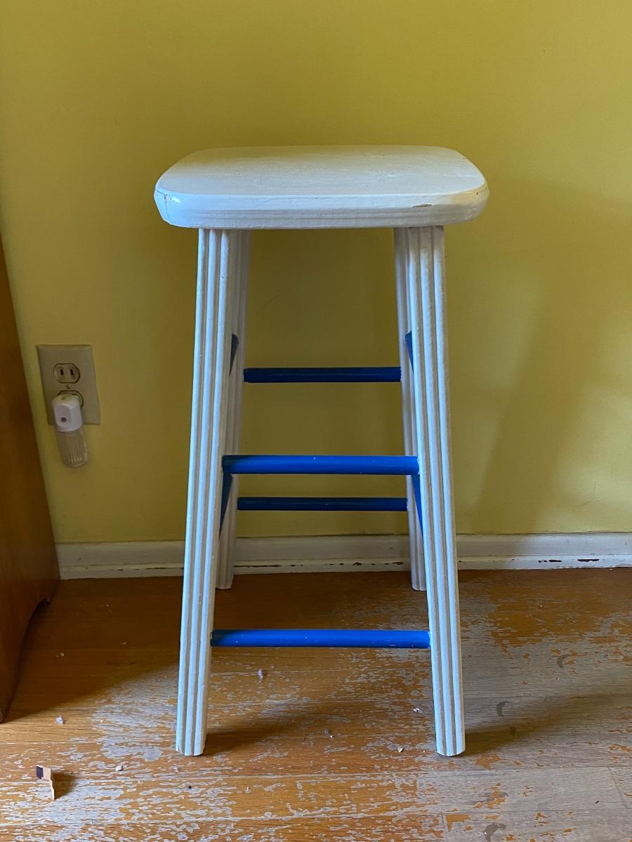 White and blue painted wood stool. Sturdy. Can easily be repainted. Stands at 24".