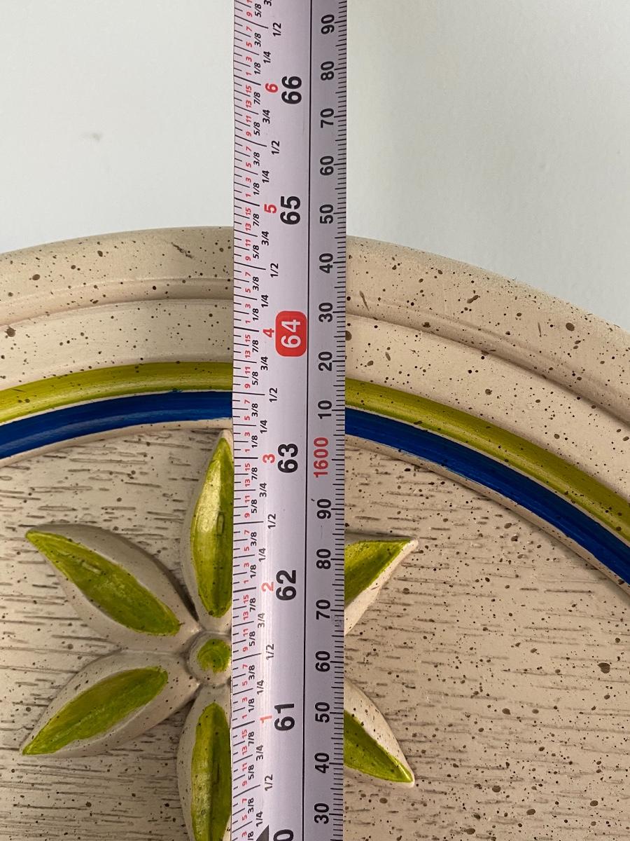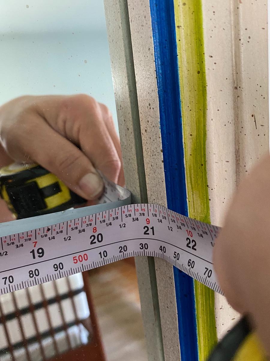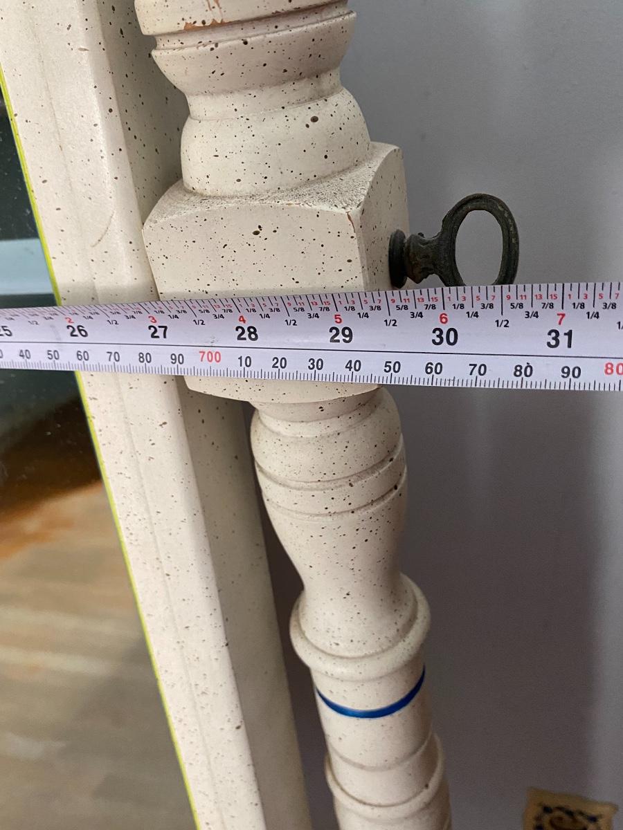 Vintage standing mirror. Turned wood posts, carved details. Mirror seems wider then normal, measures 21" full width is about 31". Stands at 65". White speckled finish with blue and green accent.