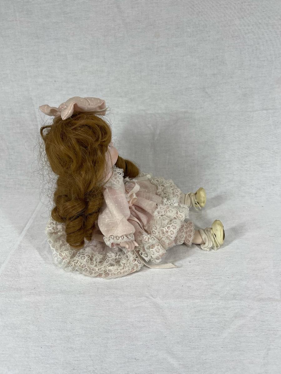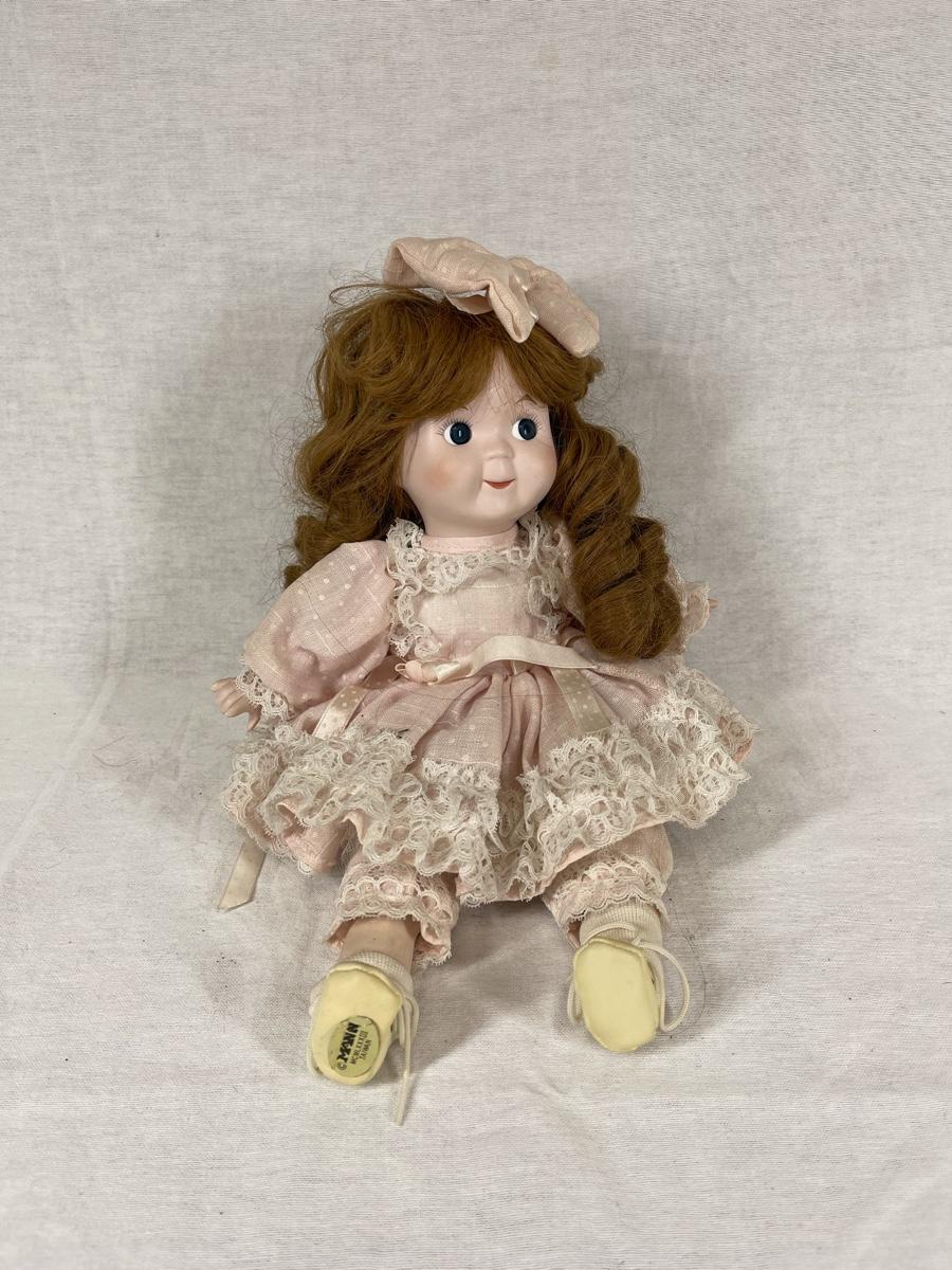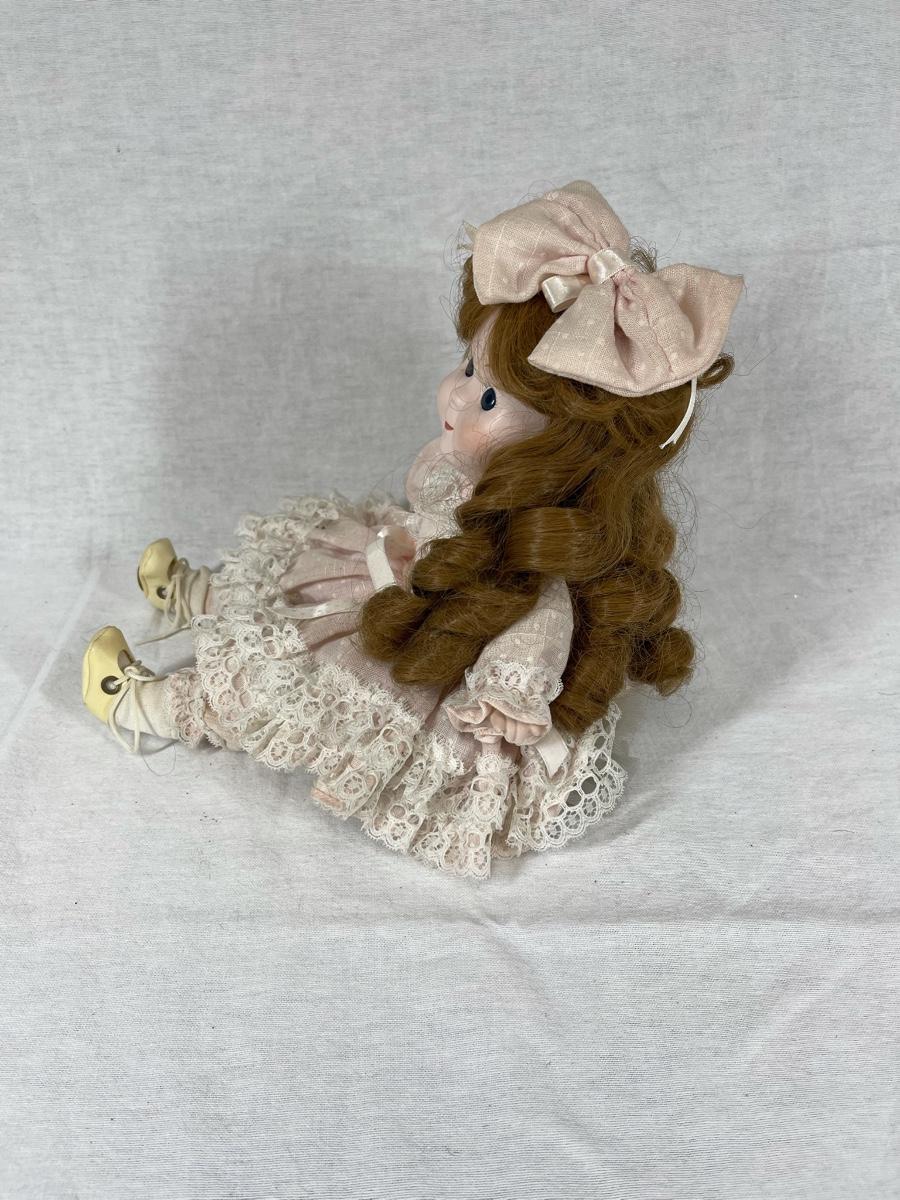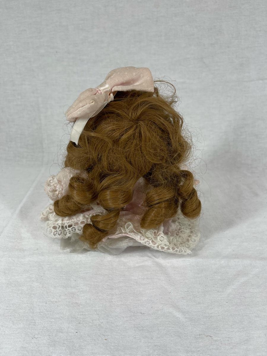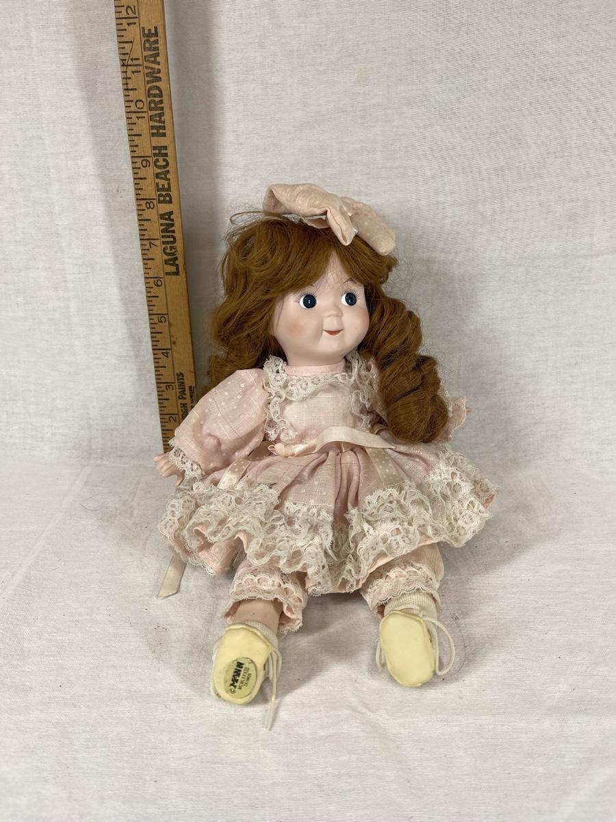 Cute flirty eye, watermelon smile bisque doll. Newer. Pale pink outfit. In good condition. Under 12" size.