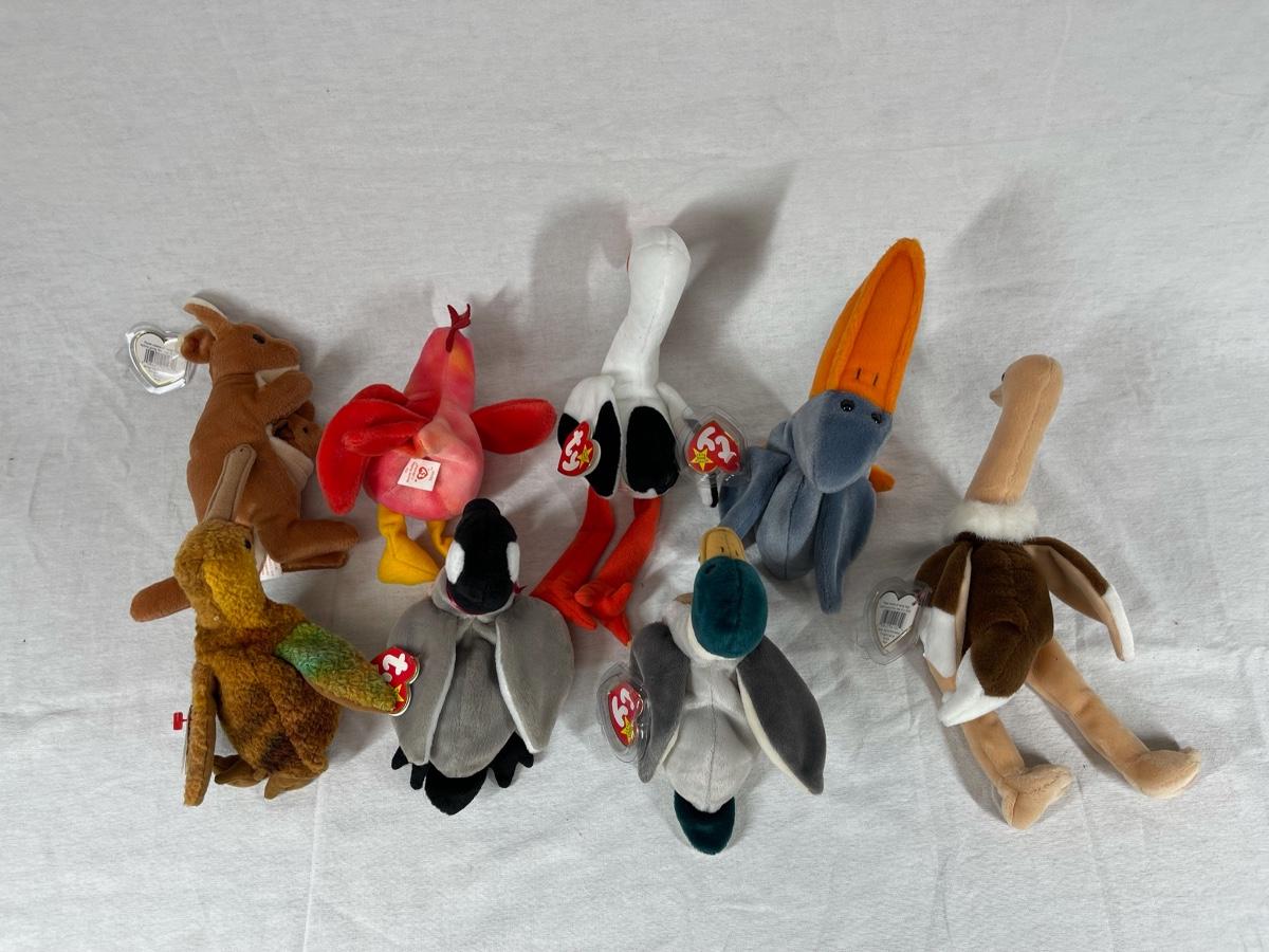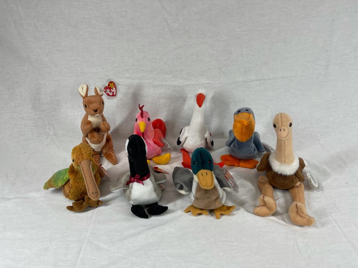Lot of 8 TY Beanie Baby plush animals. 7 are different birds, and the 8th is a kangaroo. Good condition. All have hang tags attached.