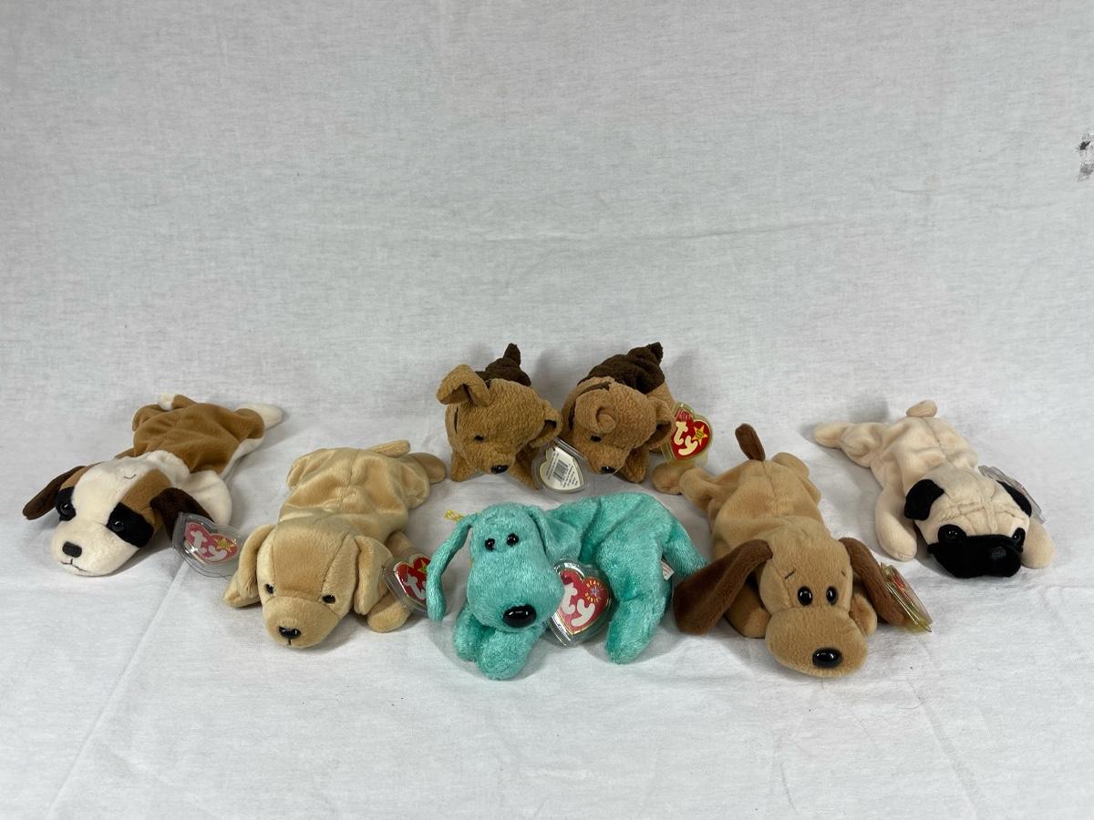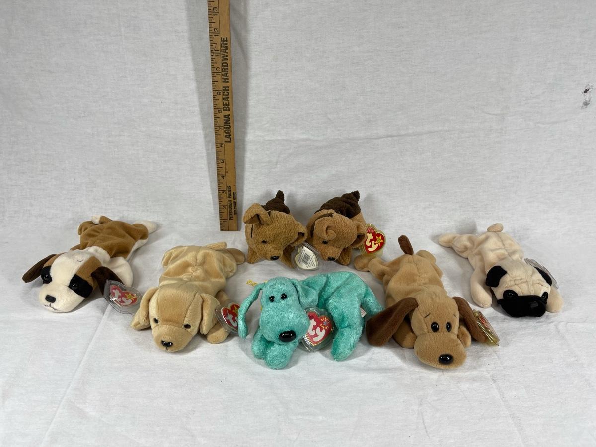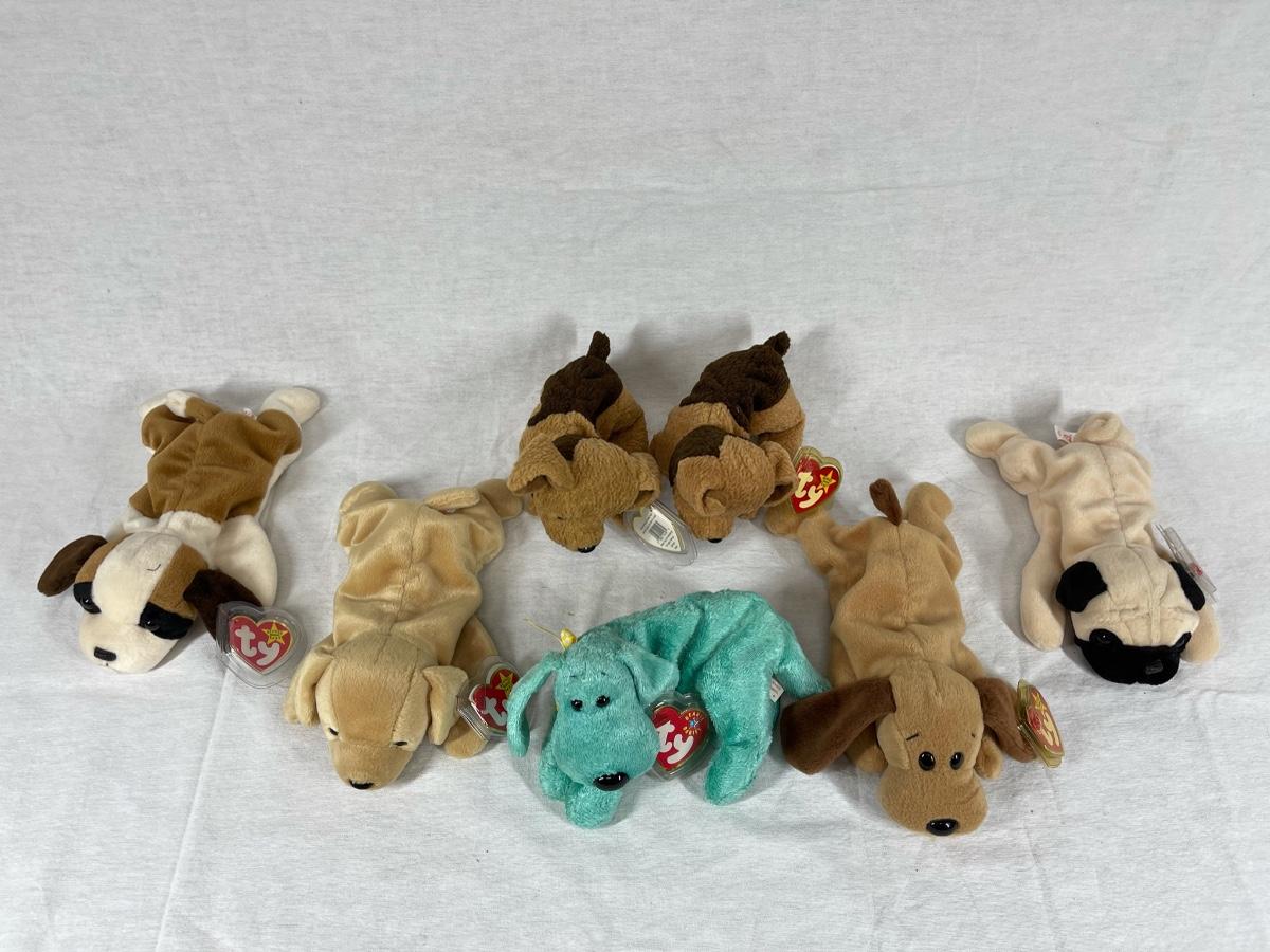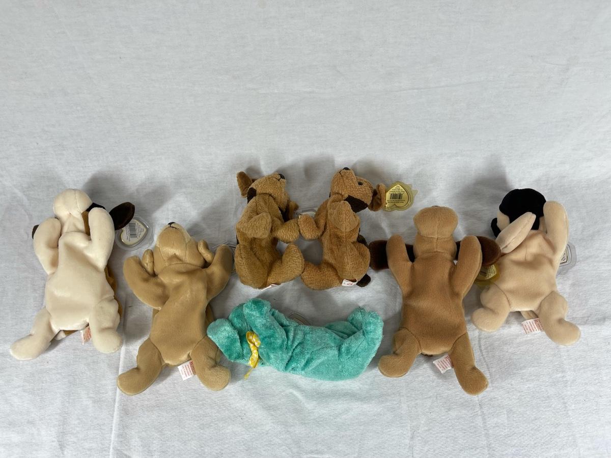 Set of 7 TY Beanie Baby puppy dog plush animals. Original hang tags are still attached.