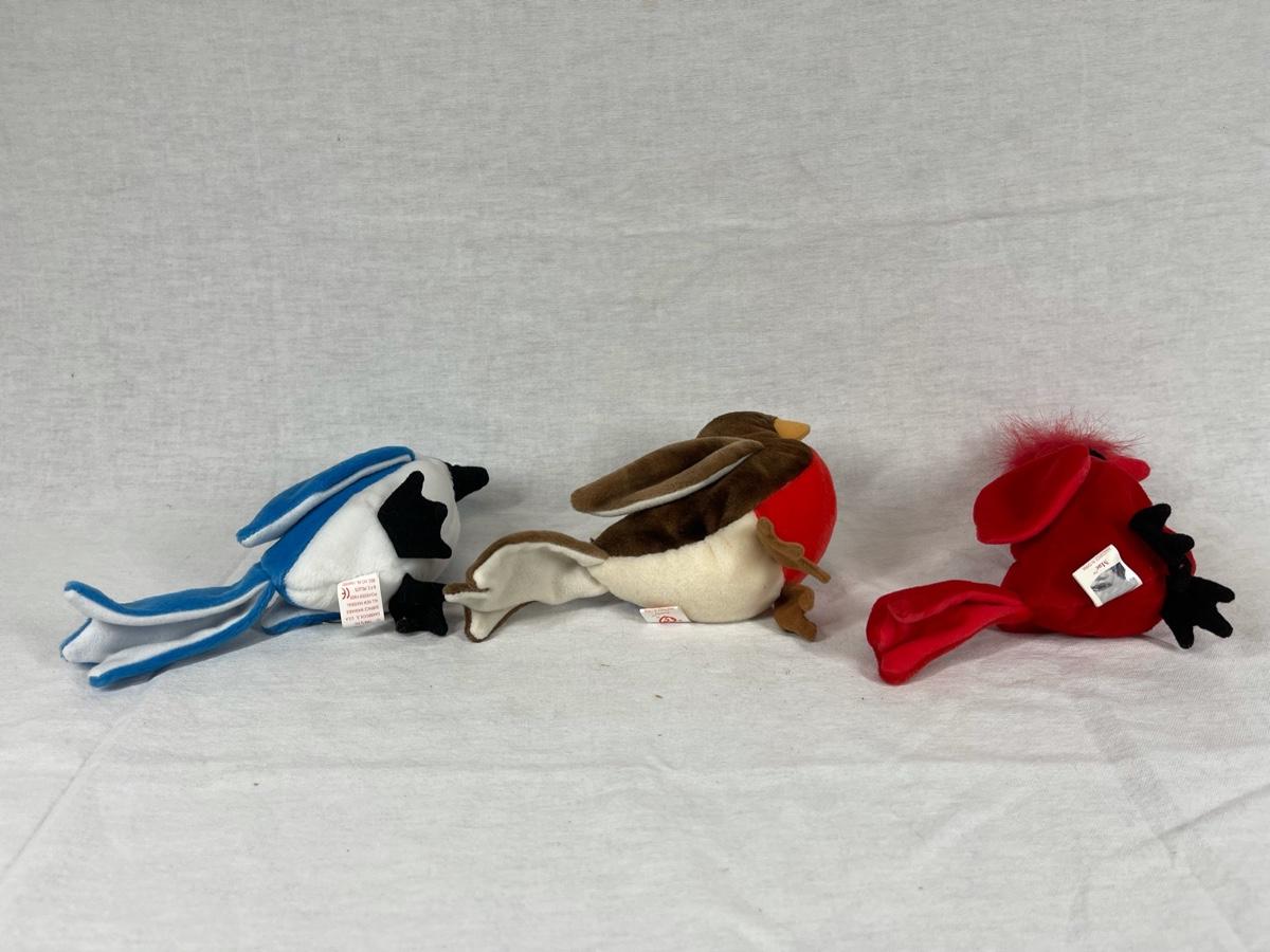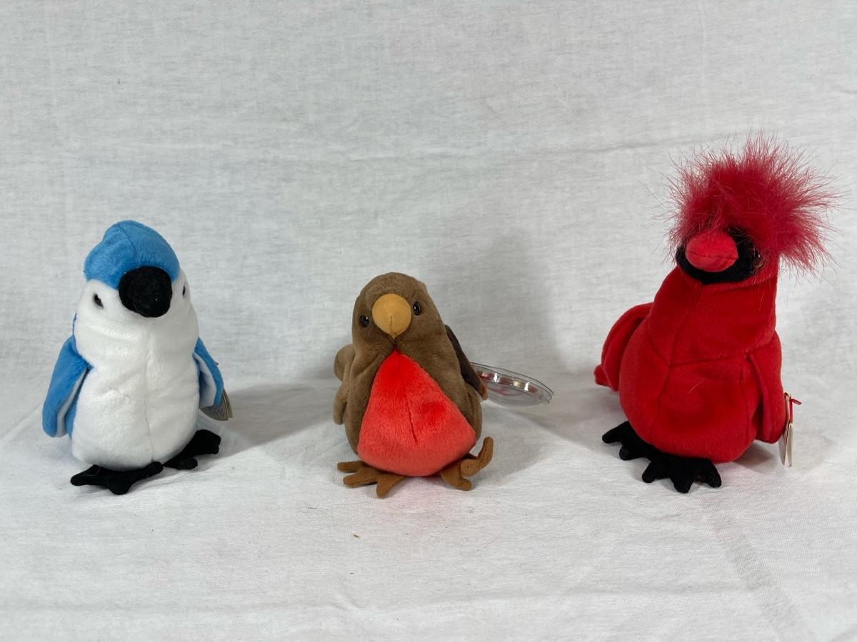 Set of 3 TY Beanie Baby plush birds. A blue jay, a robin, and a cardinal. Good condition, with tags.
