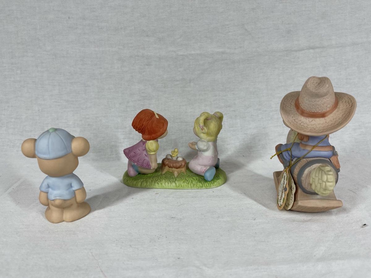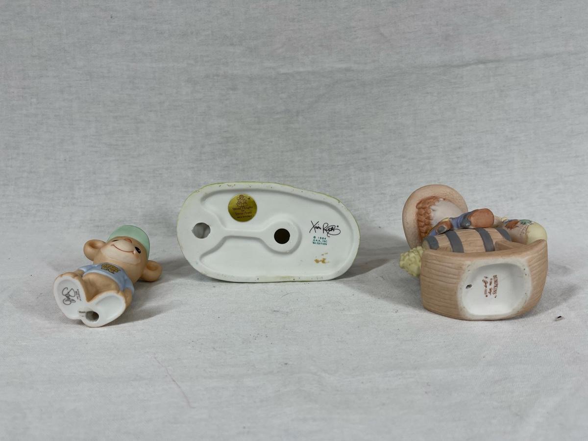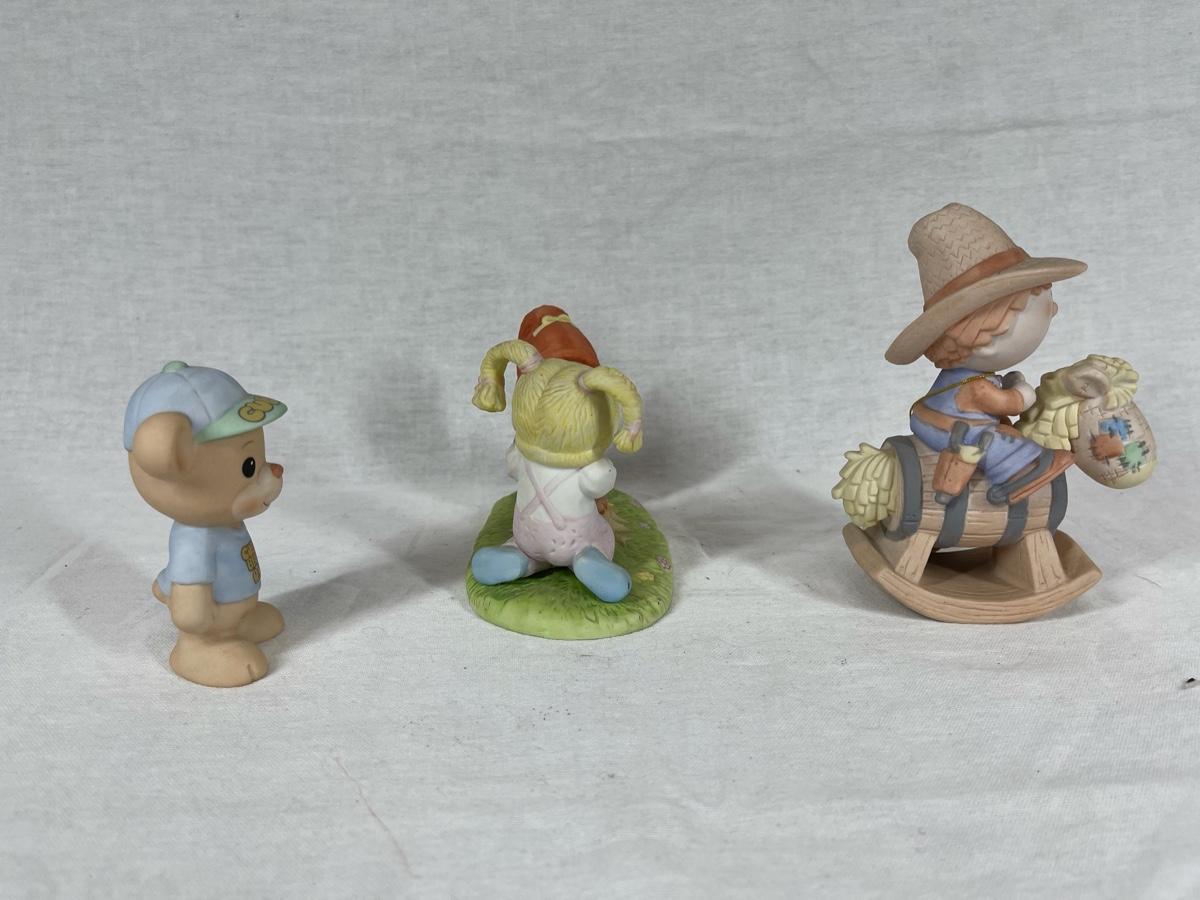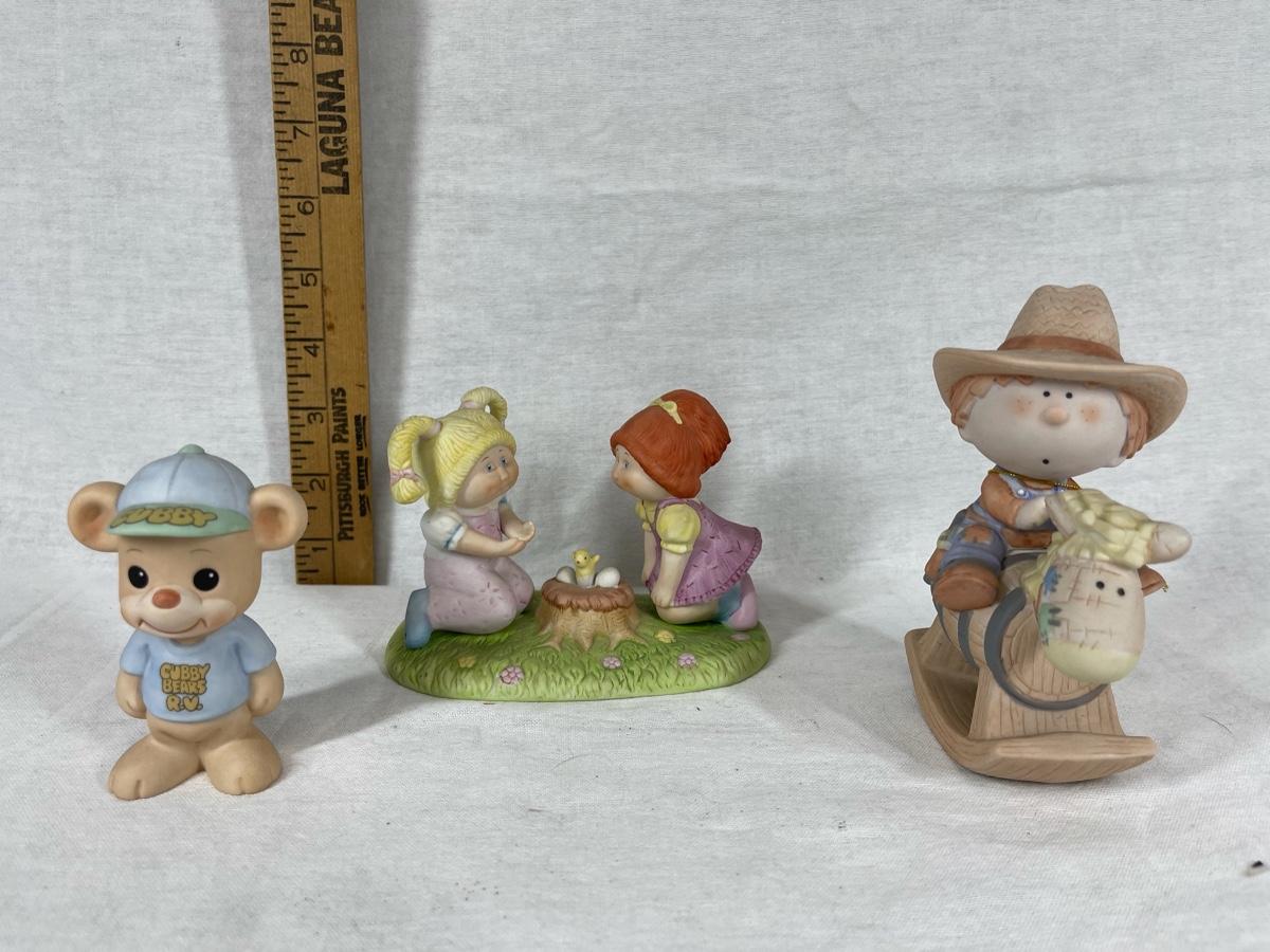 Collectible figurine lot. 3 figurines including a teddy bear, Cabbage Patch Kids, and a cowboy on Rocking Horse. Good conditions. Under 6" size.