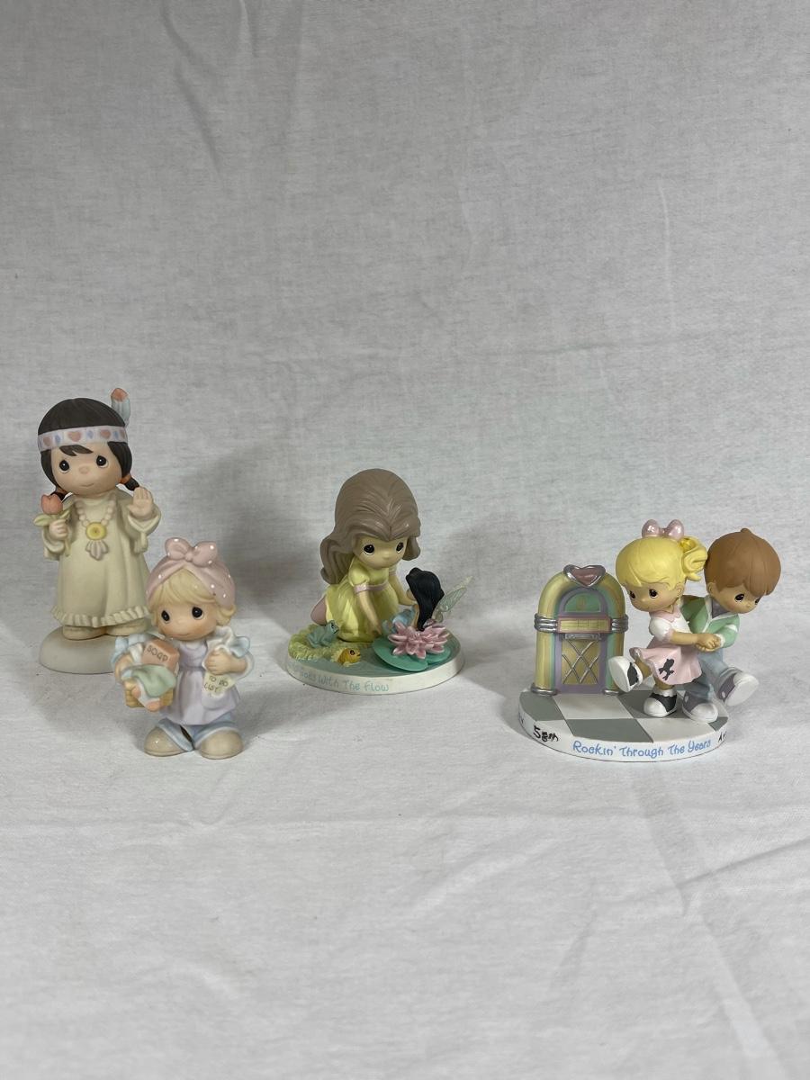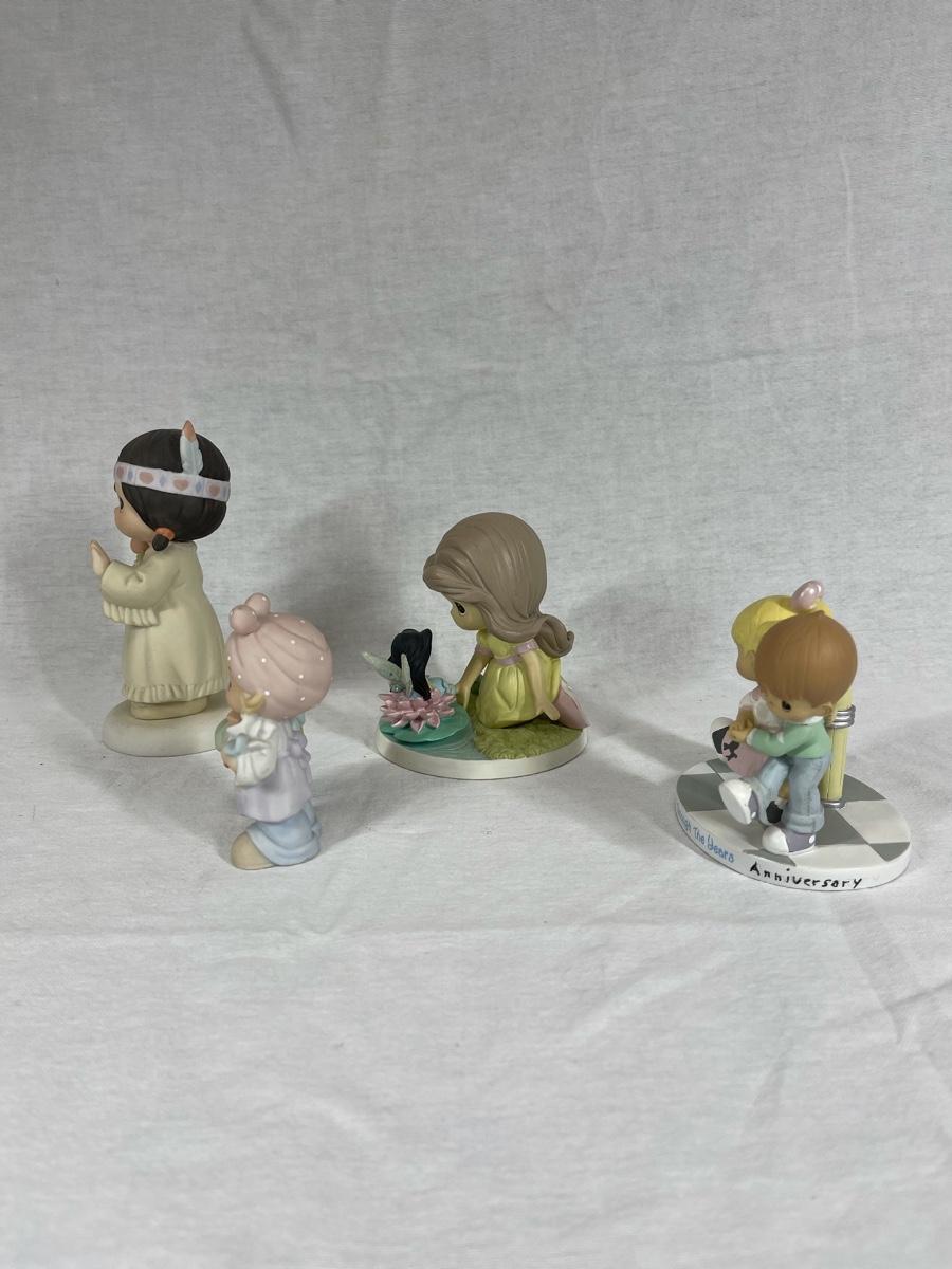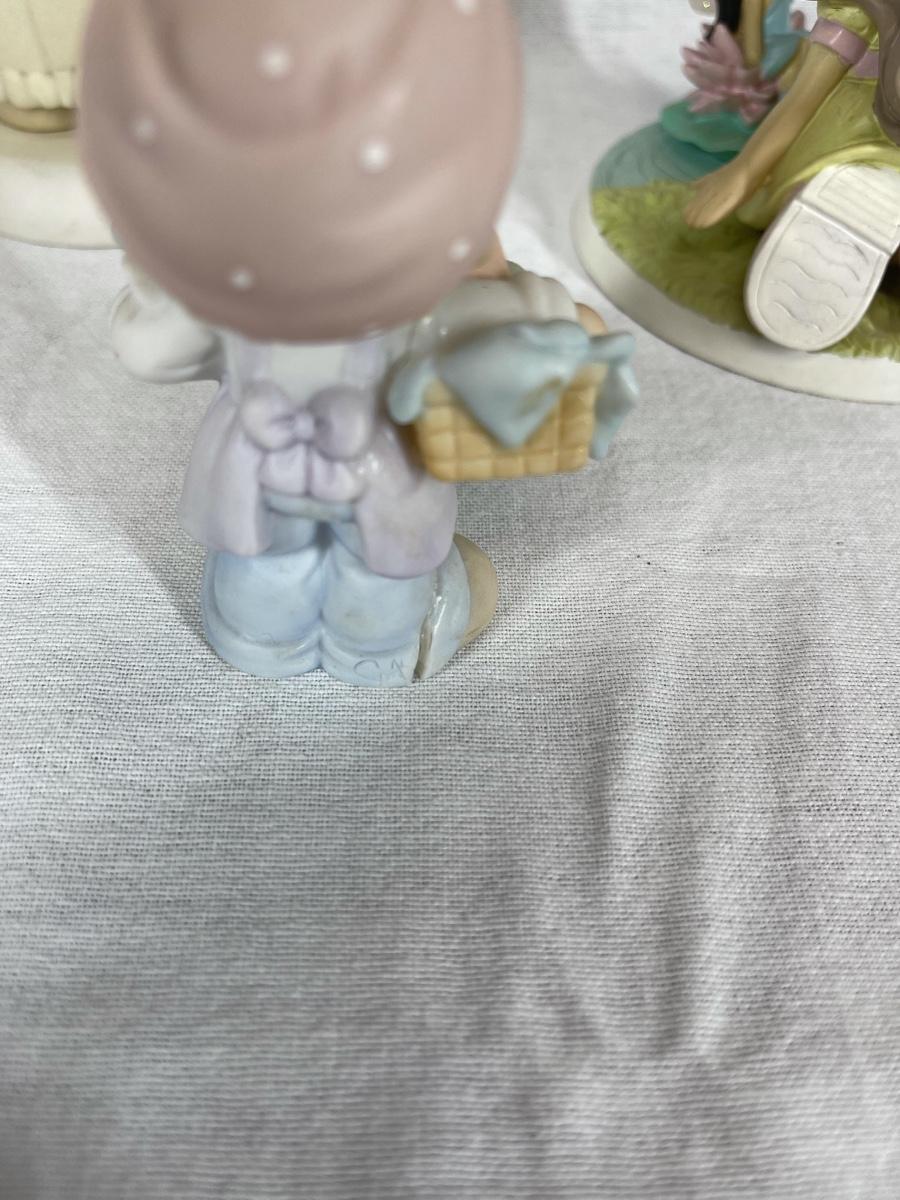 Lot of 4 Precious Moments figurines. Under 6" size. The smaller figurine has been repaired on the foot.