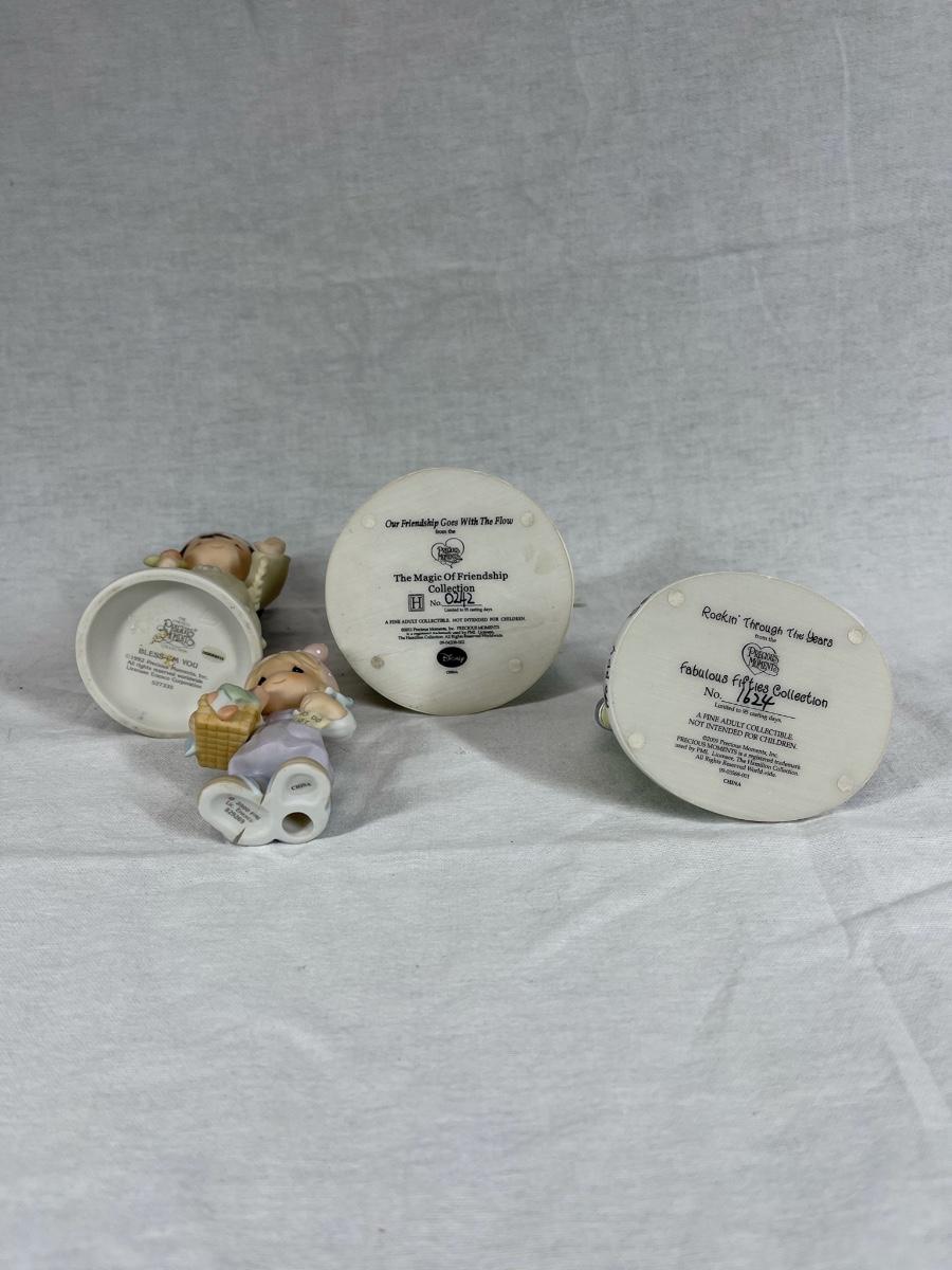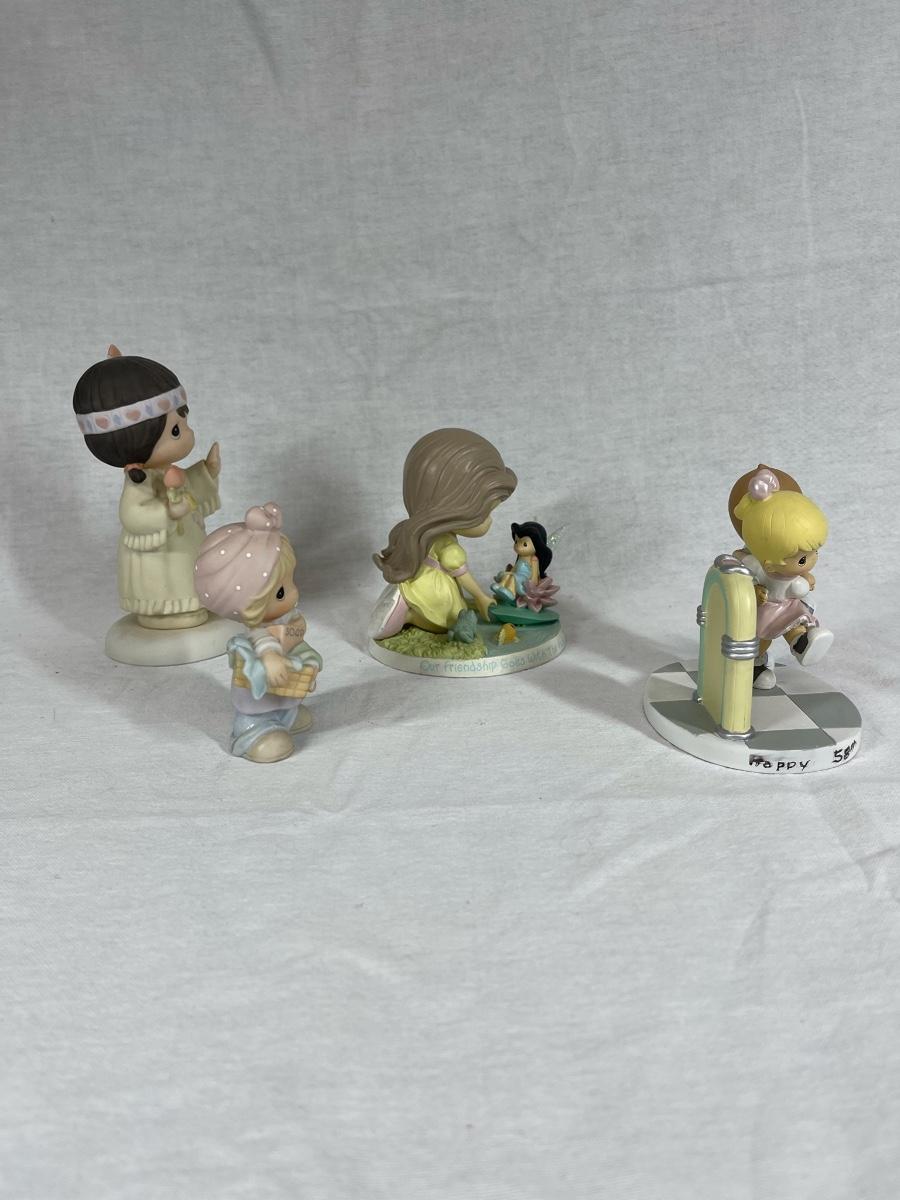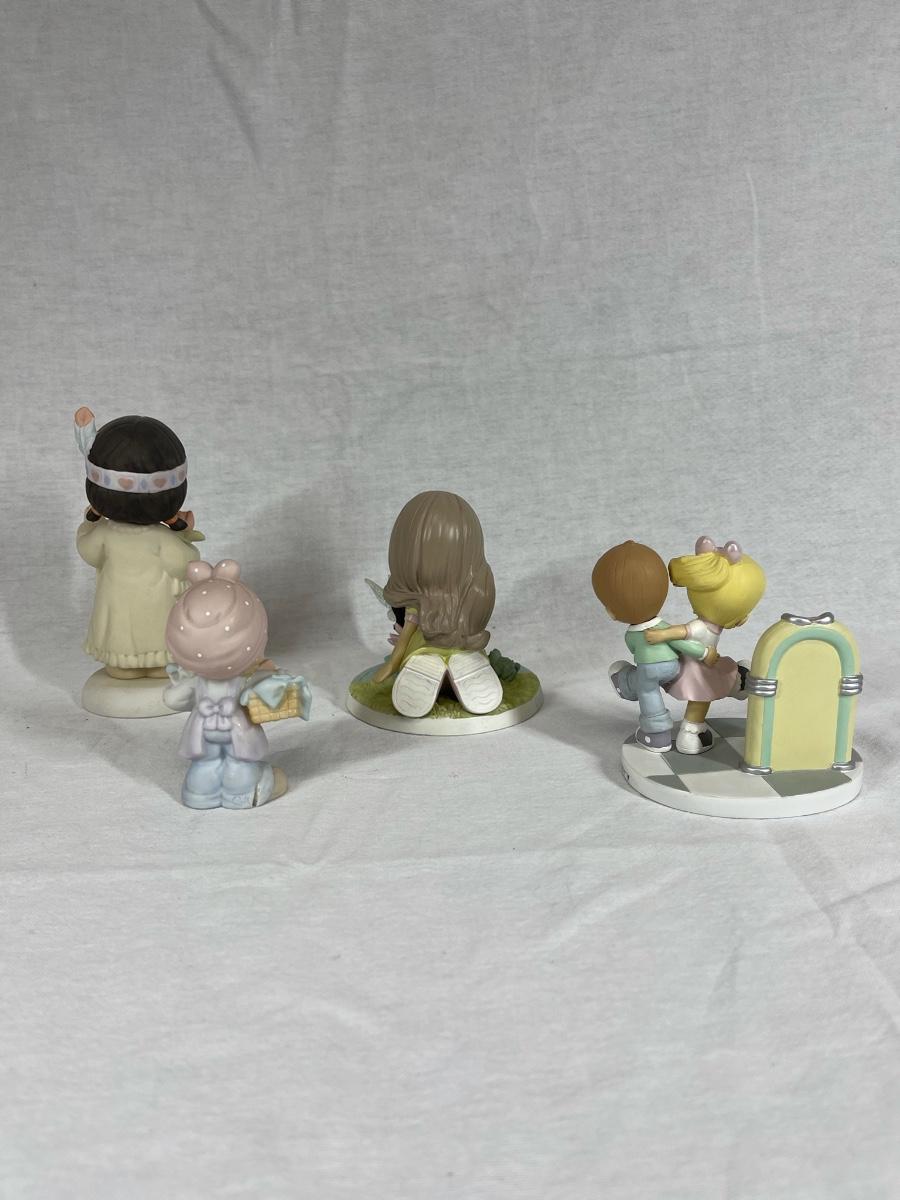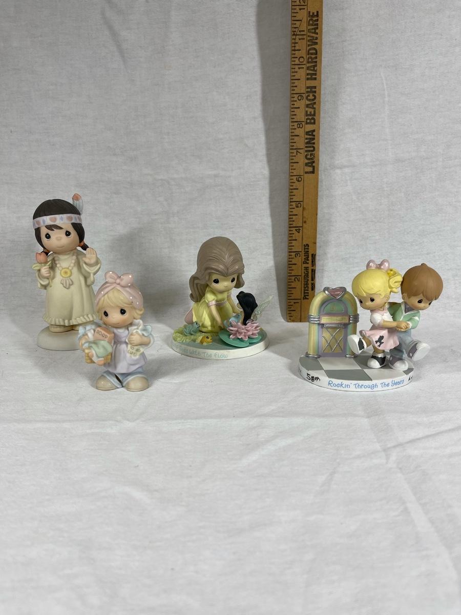 Lot of 4 Precious Moments figurines. Under 6" size. The smaller figurine has been repaired on the foot.