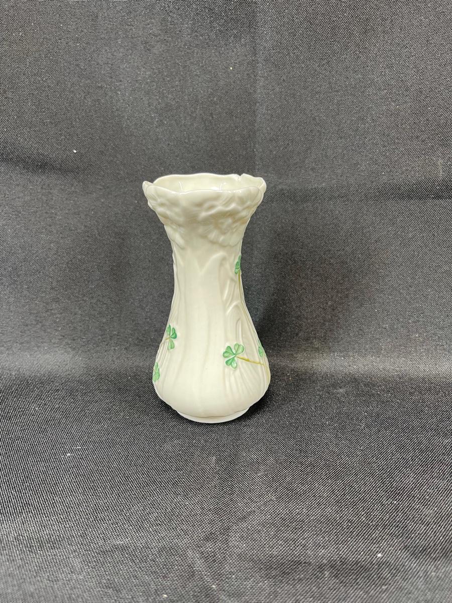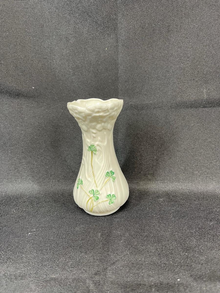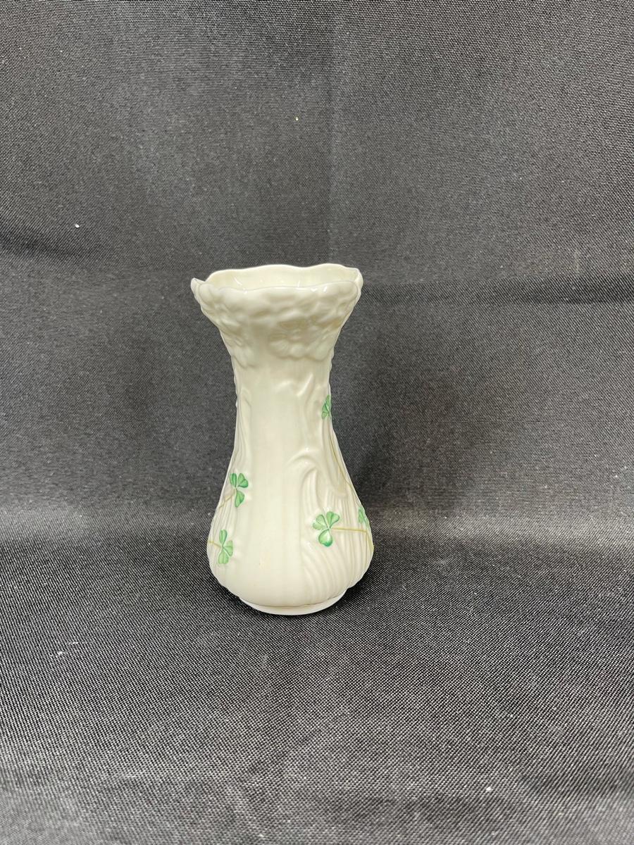 Vintage Belleek porcelain bud vase. Off white with clover pattern. Good condition, under 5" size. Blue mark on the bottom.