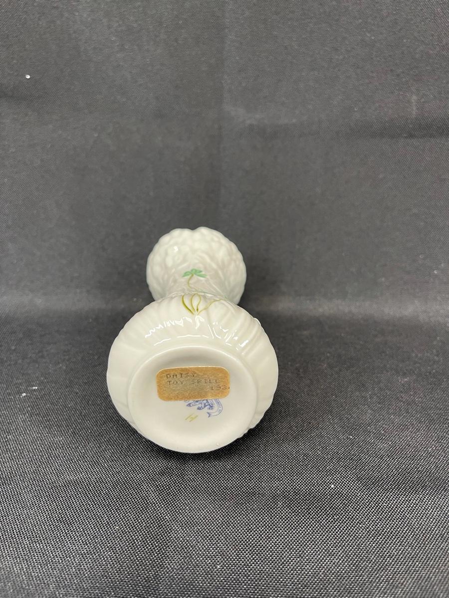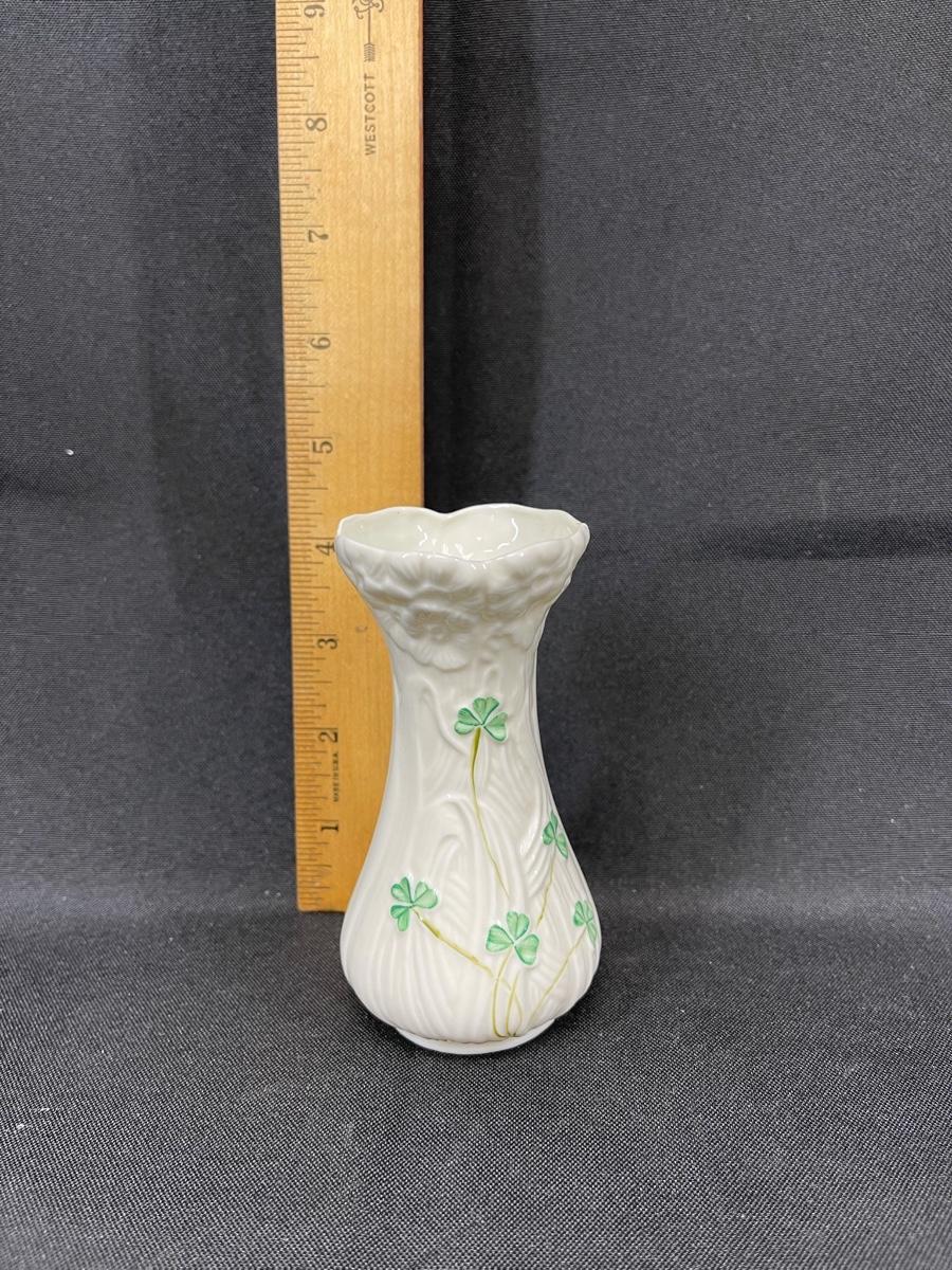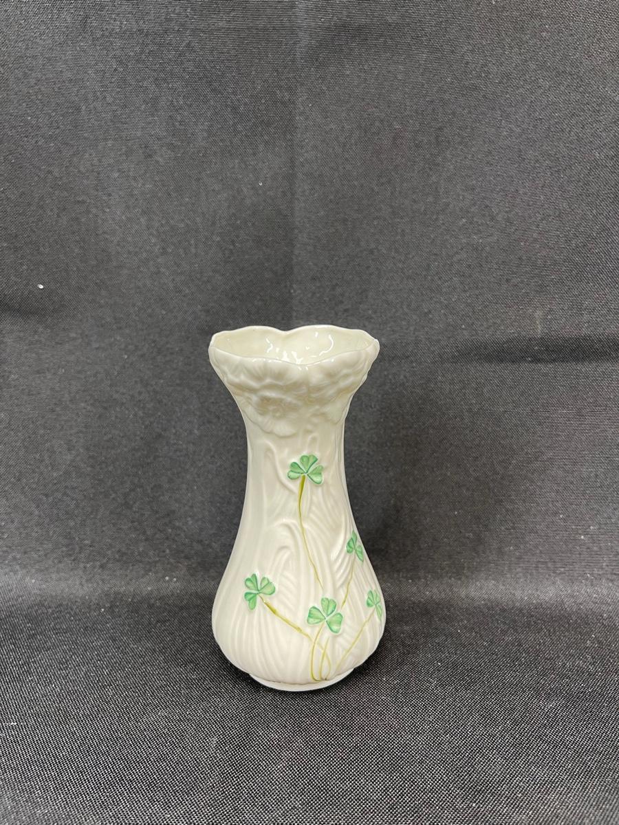 Vintage Belleek porcelain bud vase. Off white with clover pattern. Good condition, under 5" size. Blue mark on the bottom.