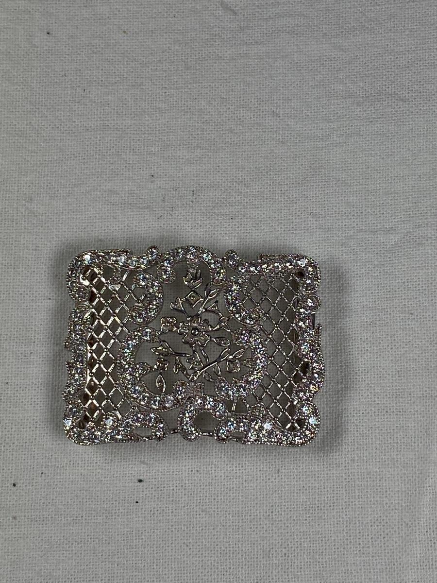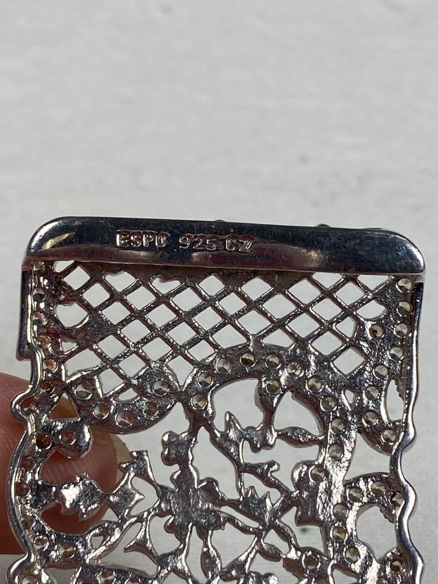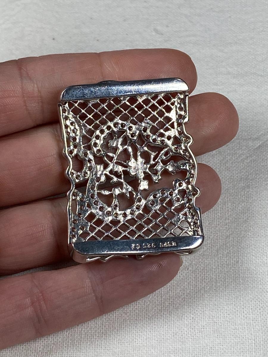 Ornate filigree style sterling silver & CZ belt buckle/scarf slide. No missing stones. Marked on the inside. About 2" size.
