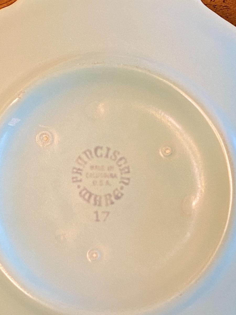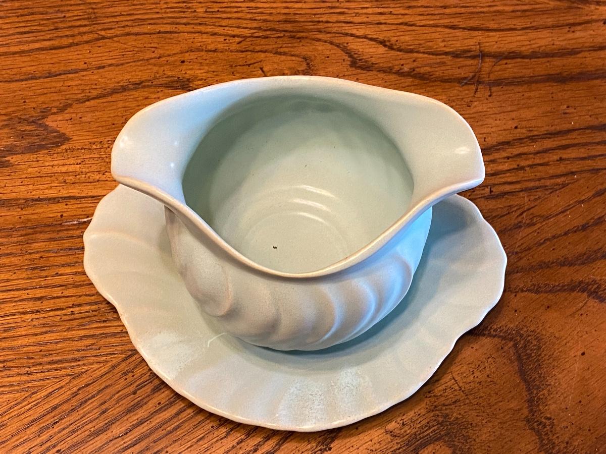 Vintage Franciscan Ware gravy boat. pale teal turquoise blue in Coronado Swirl pattern. Bowl and drip plate are one piece. In good condition, no chips, a little dusty.