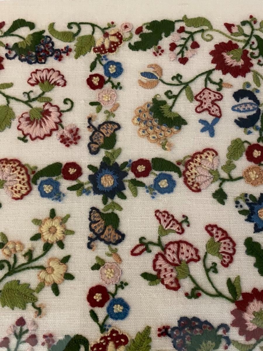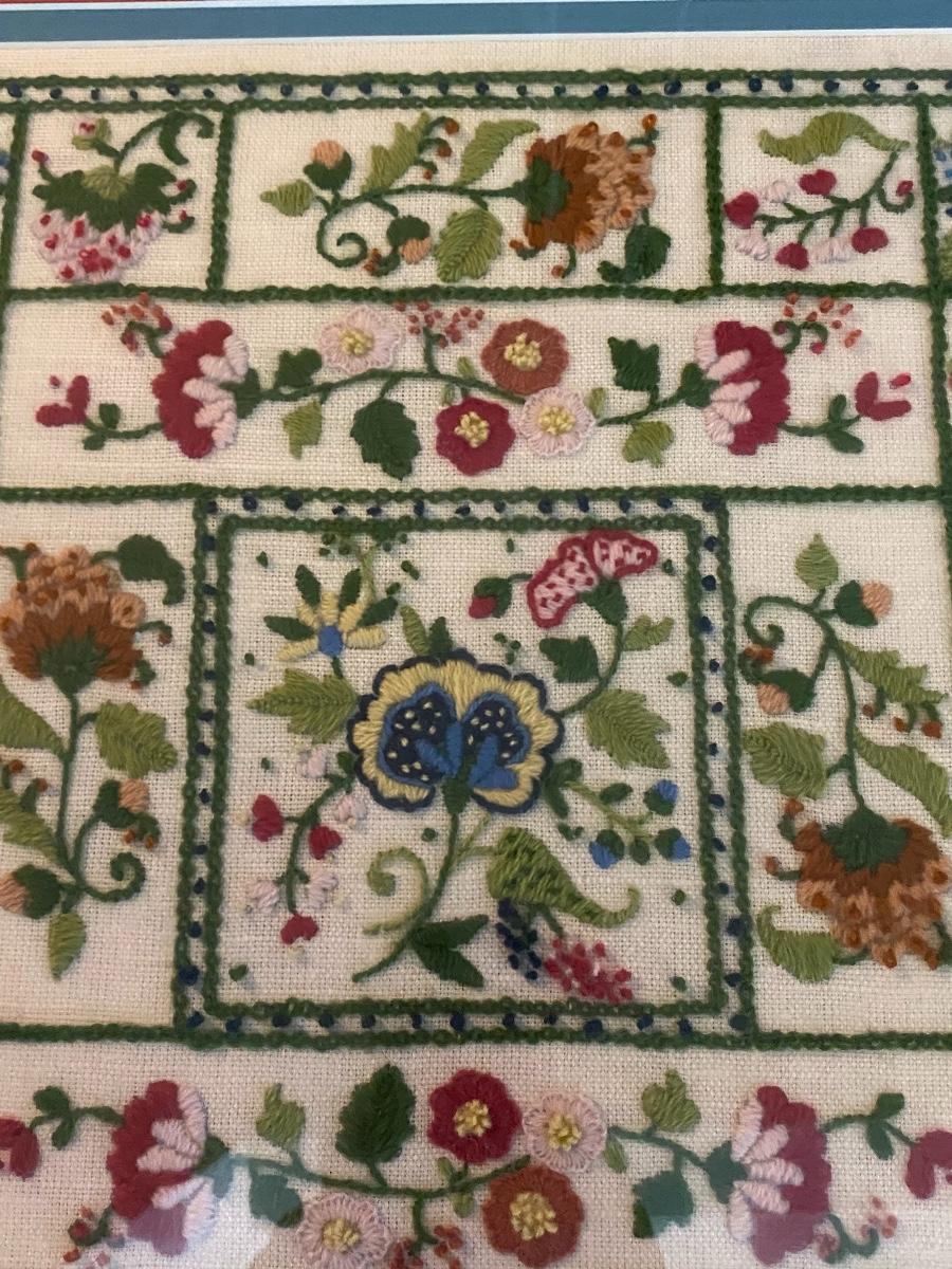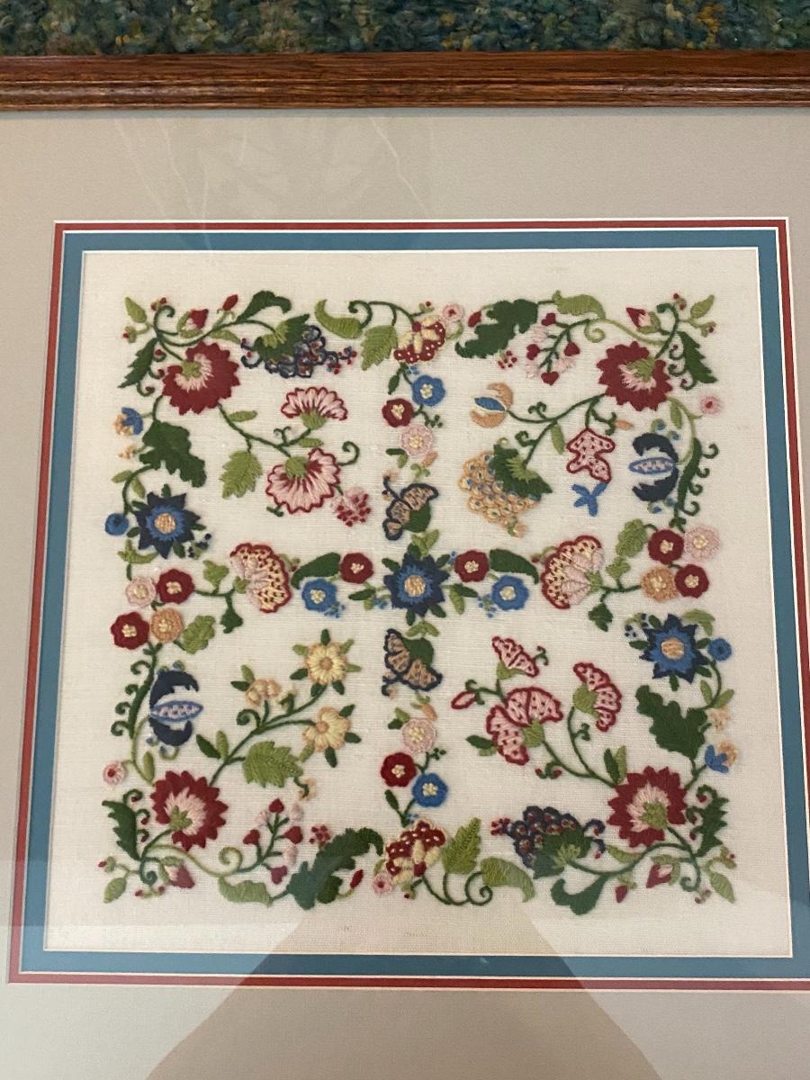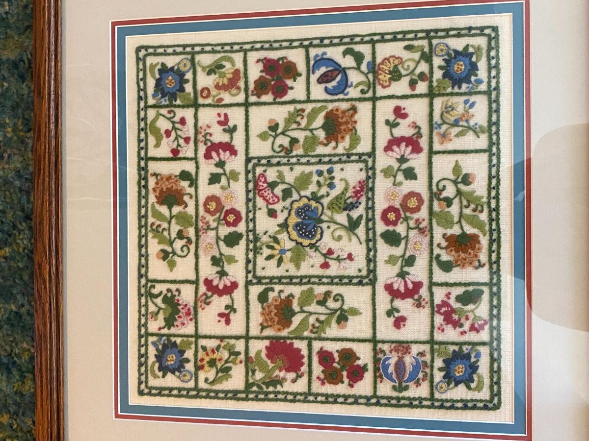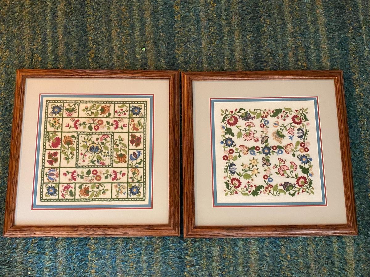 Pair of vintage framed needlepoint art. Nicely done floral patterns. Framed in 22" square frames.