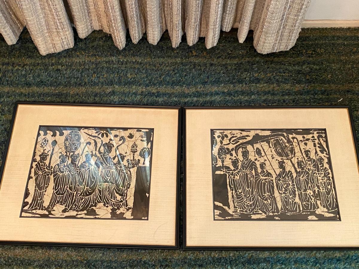 Pair of Asian wood block stamped art pieces. No signature. Some discolor from age. Measure roughly 25"x21".