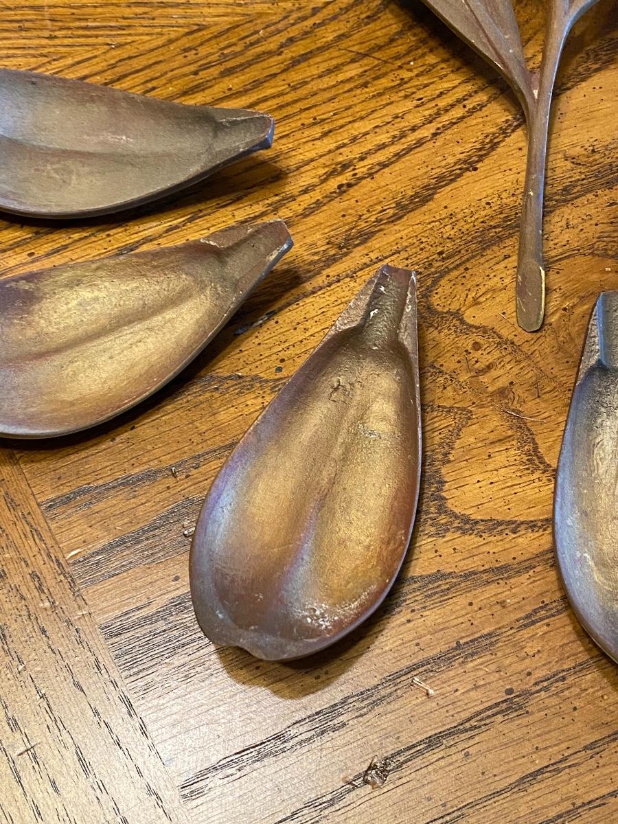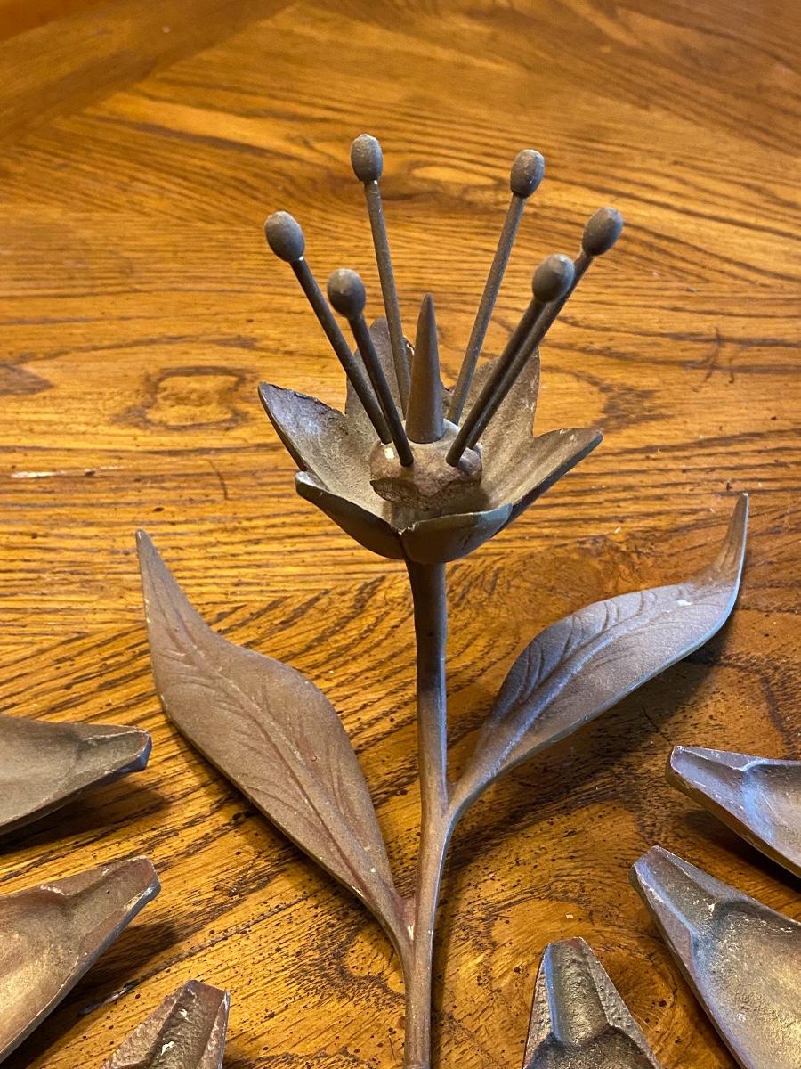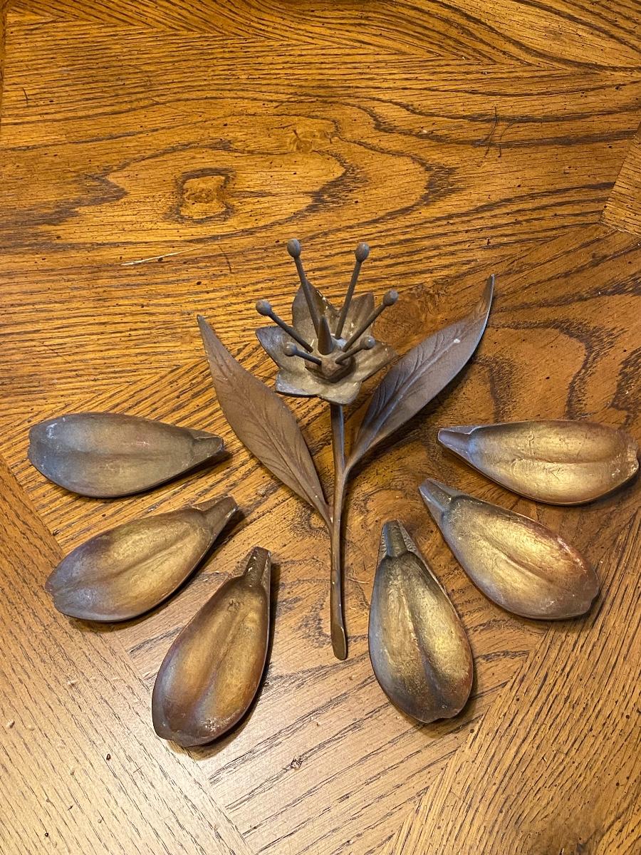 Vintage mid century brass table art ash tray. Shaped like a flower, the petals are removable. When looking this up I realized the petals can also be turned the other direction, so the flower looks open, didn't even consider that when photographing. Also saw that the posts in center work to hold matchbooks. In good condition. About 8" length.