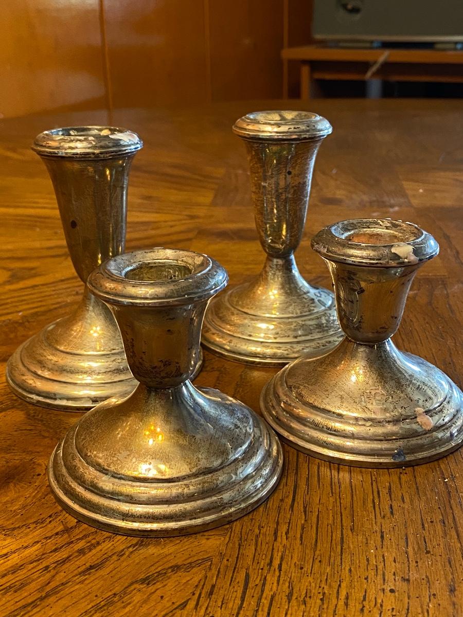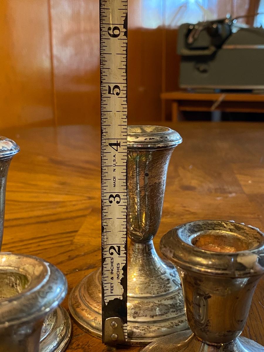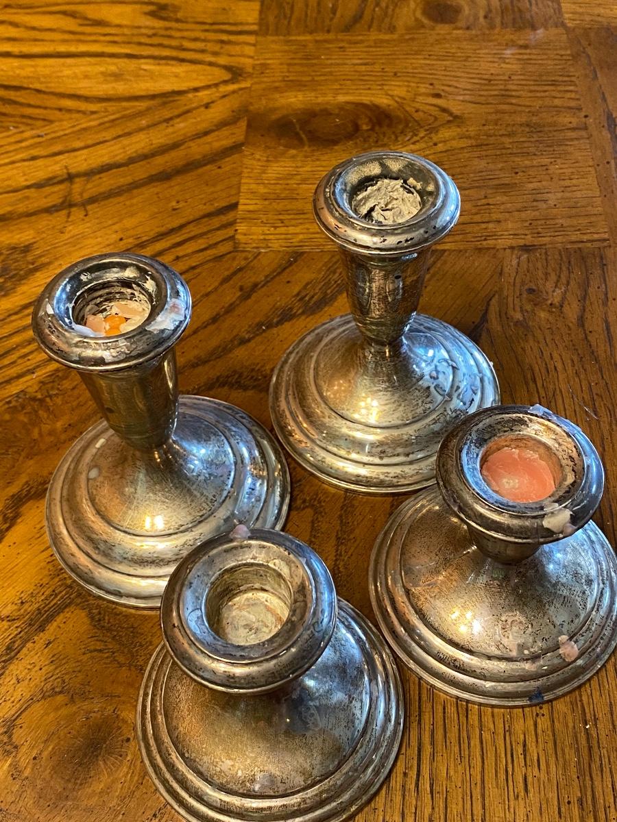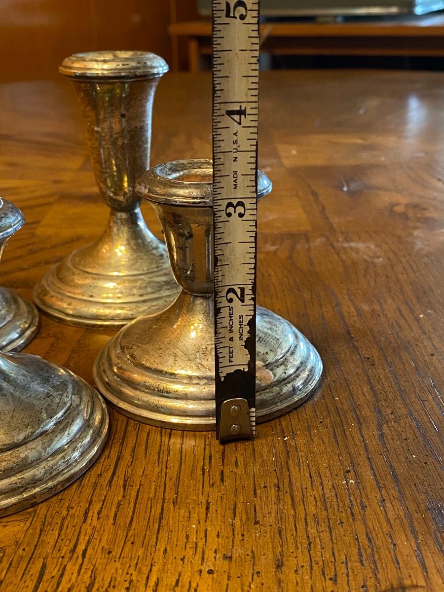 Two sets of sterling silver candle holders. Hold taper candles. Weighted bottom hollow sterling. A little tarnished and used, in good condition otherwise. 3.25" and 4.25" size.