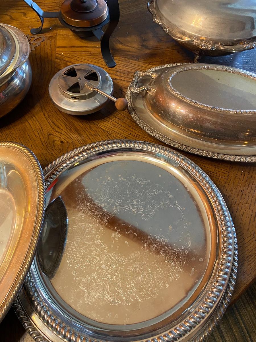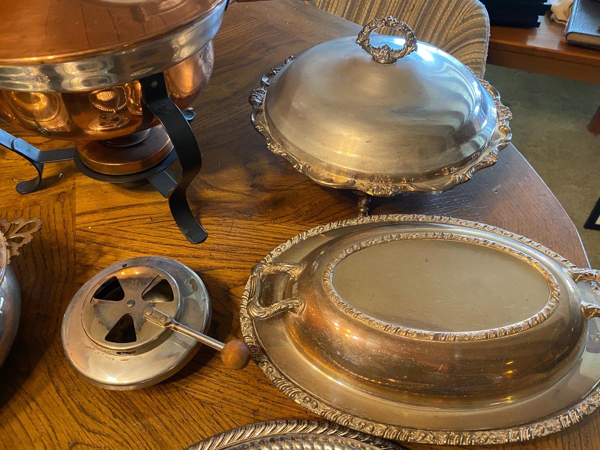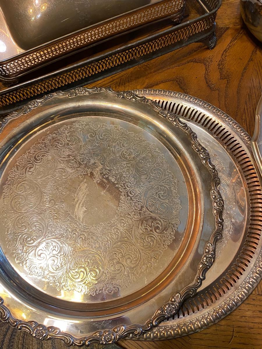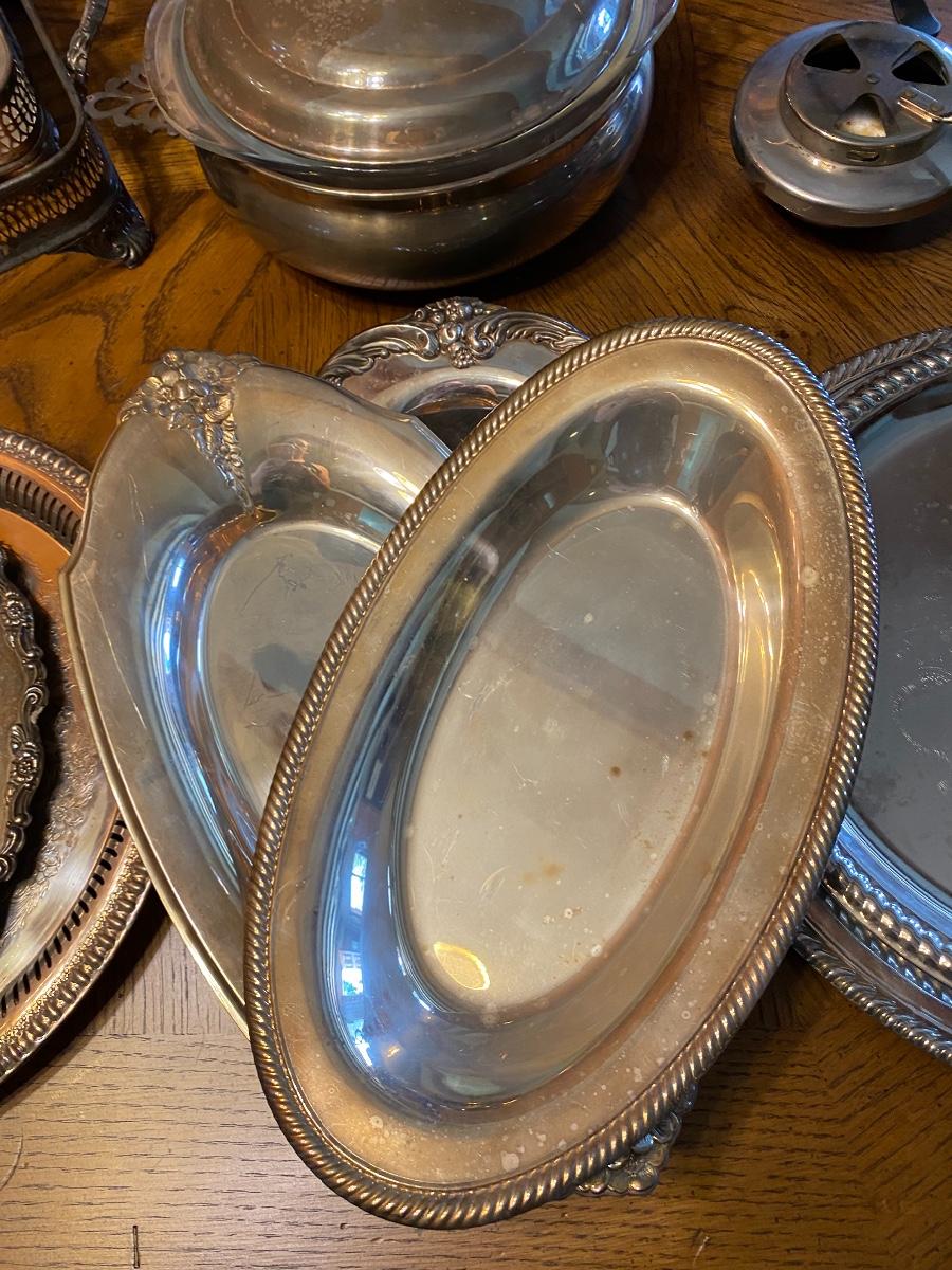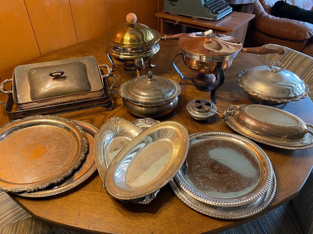Mixed lot of various silverplate serving pieces and platters. 12+ pieces. One piece is copper finish another goldtone. Everything in the photos is included.