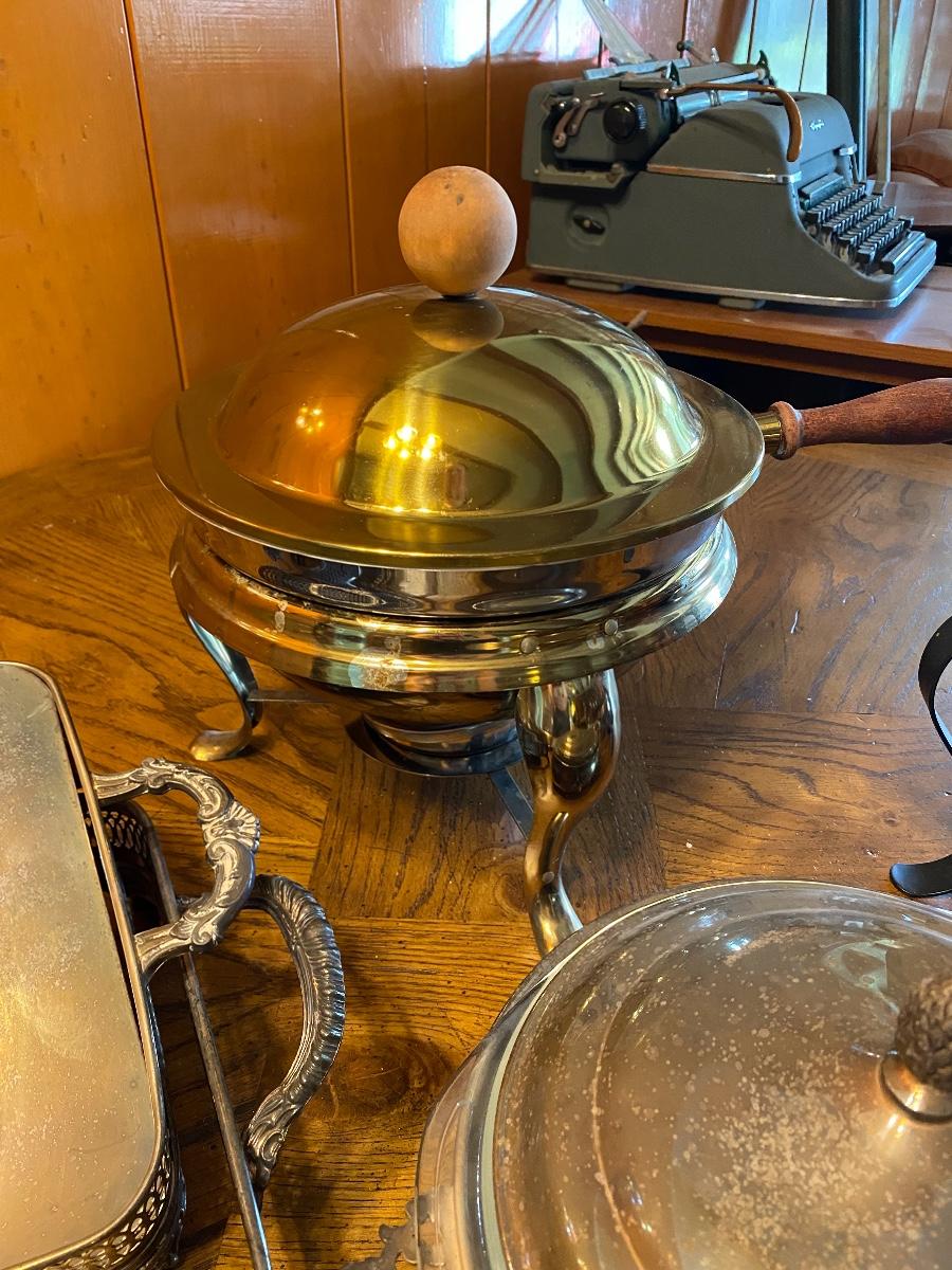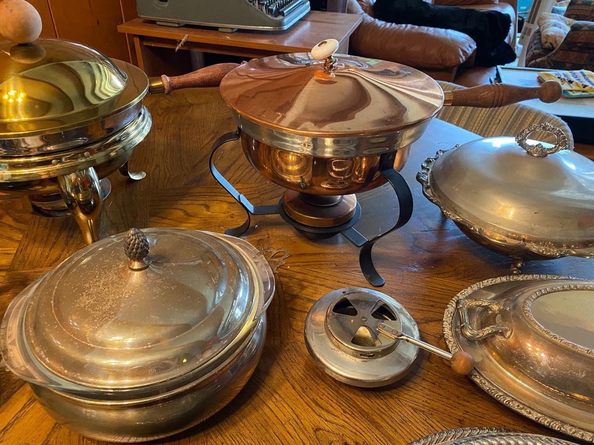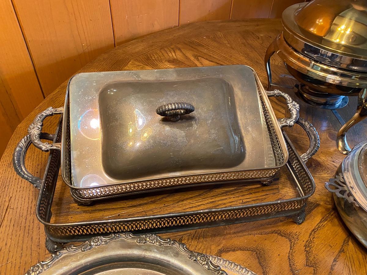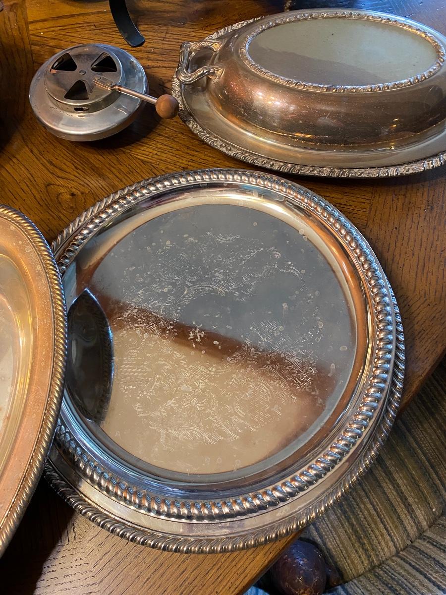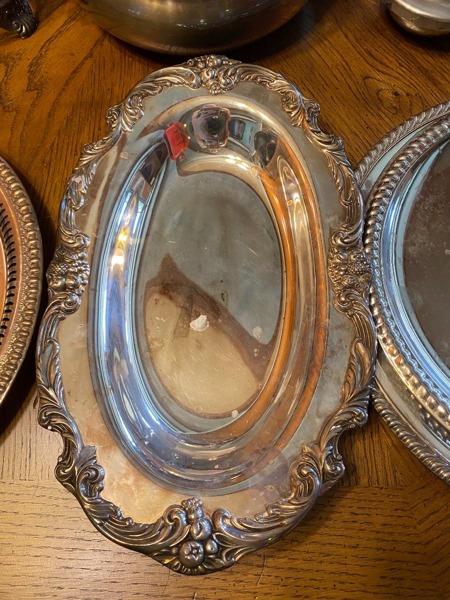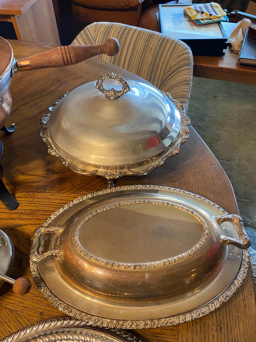 Mixed lot of various silverplate serving pieces and platters. 12+ pieces. One piece is copper finish another goldtone. Everything in the photos is included.
