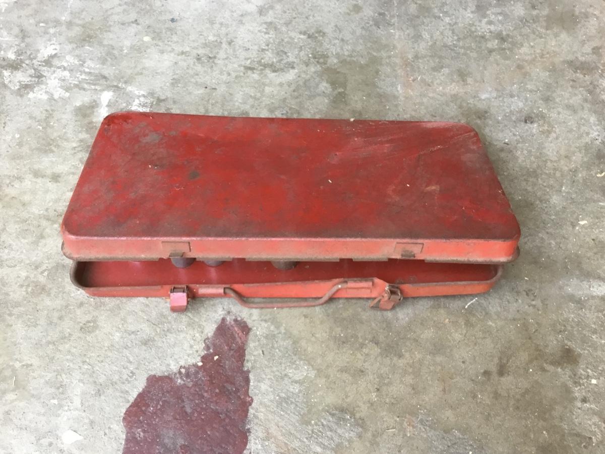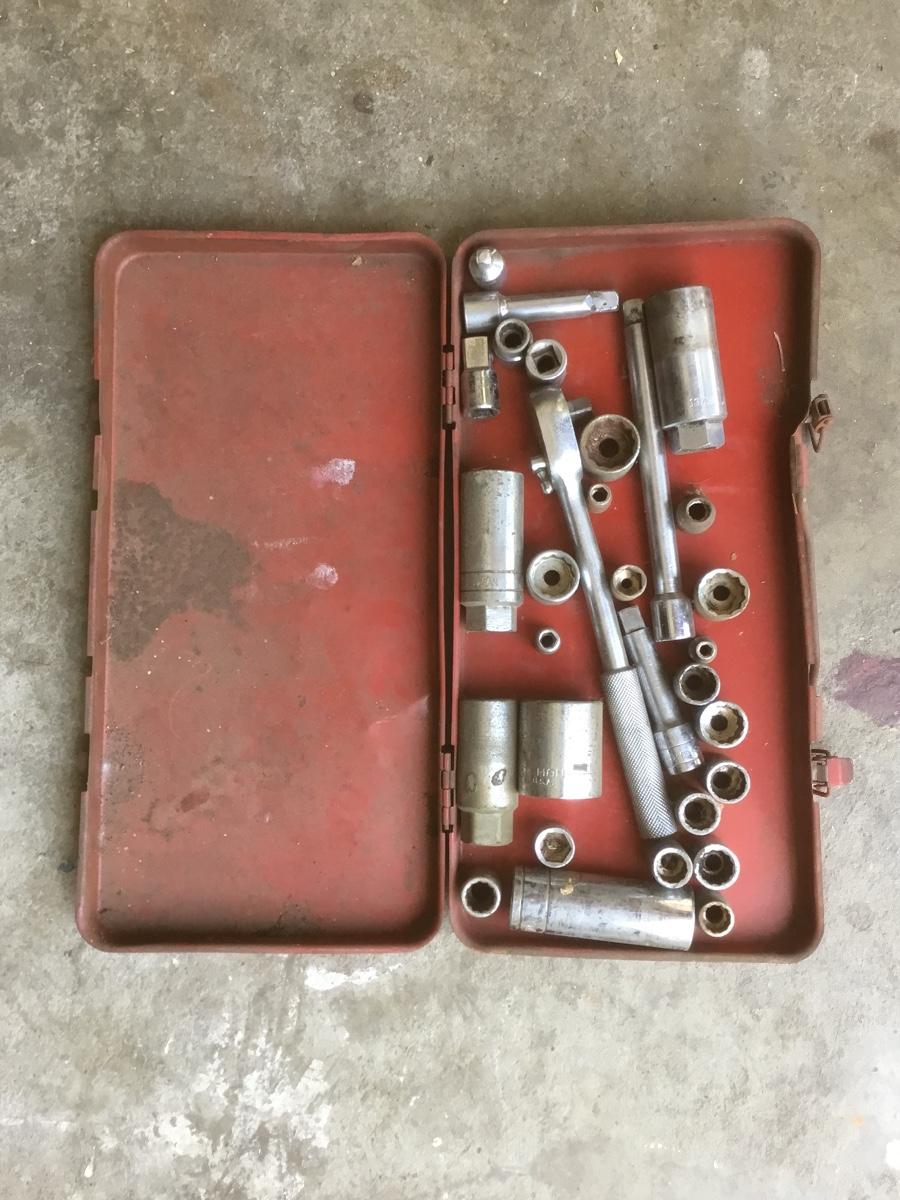 Socket set in metal case. Mixed set of sockets, extensions, and ratchet. Case is a bit tweaked.