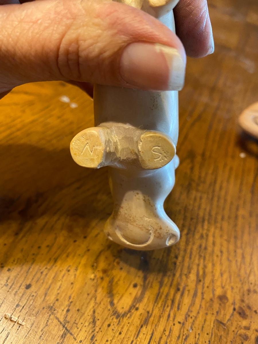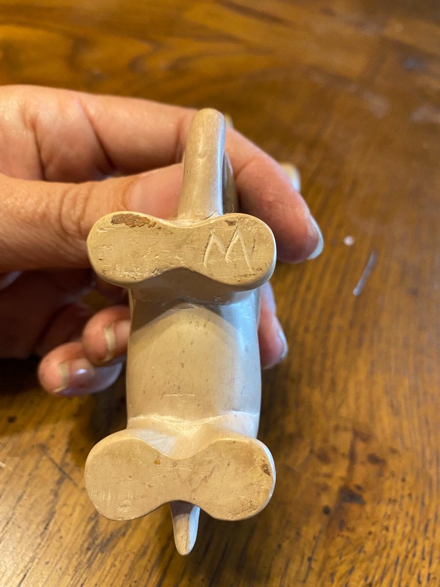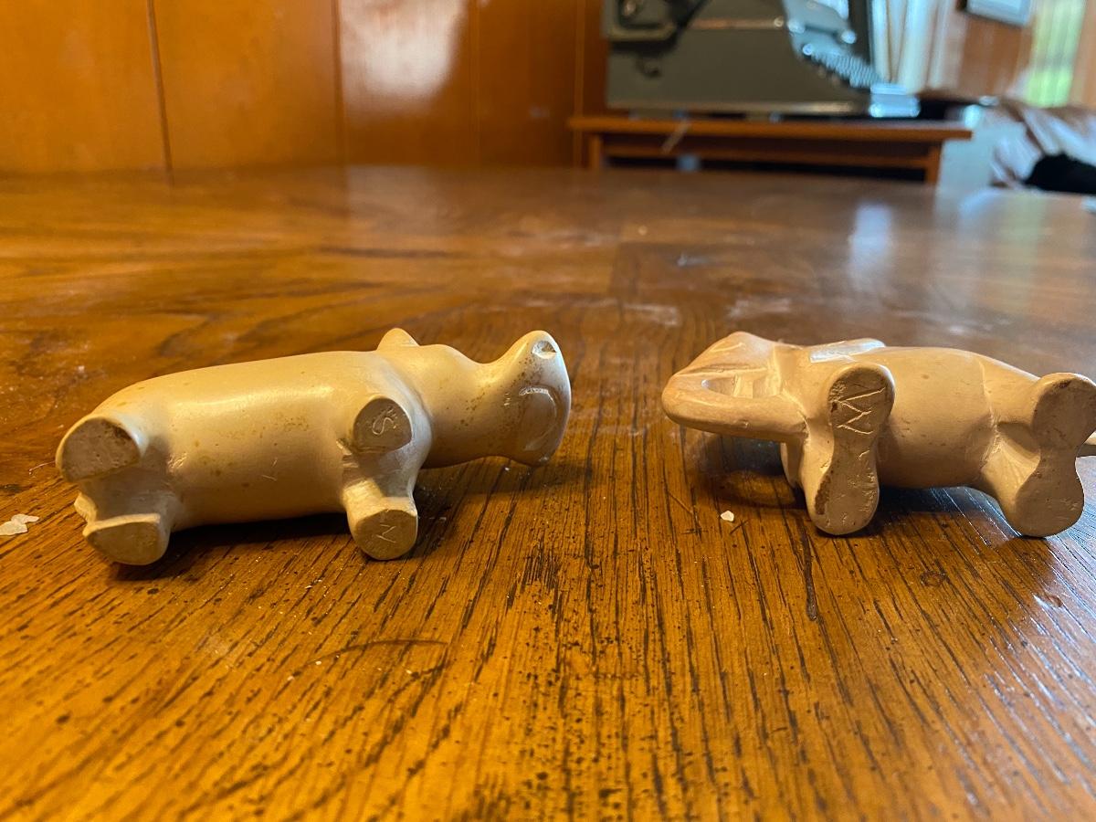 Pair of carved stone animal figurines. A hippo and elephant. Light colored stone. About 4" size. Signed with initials on the feet