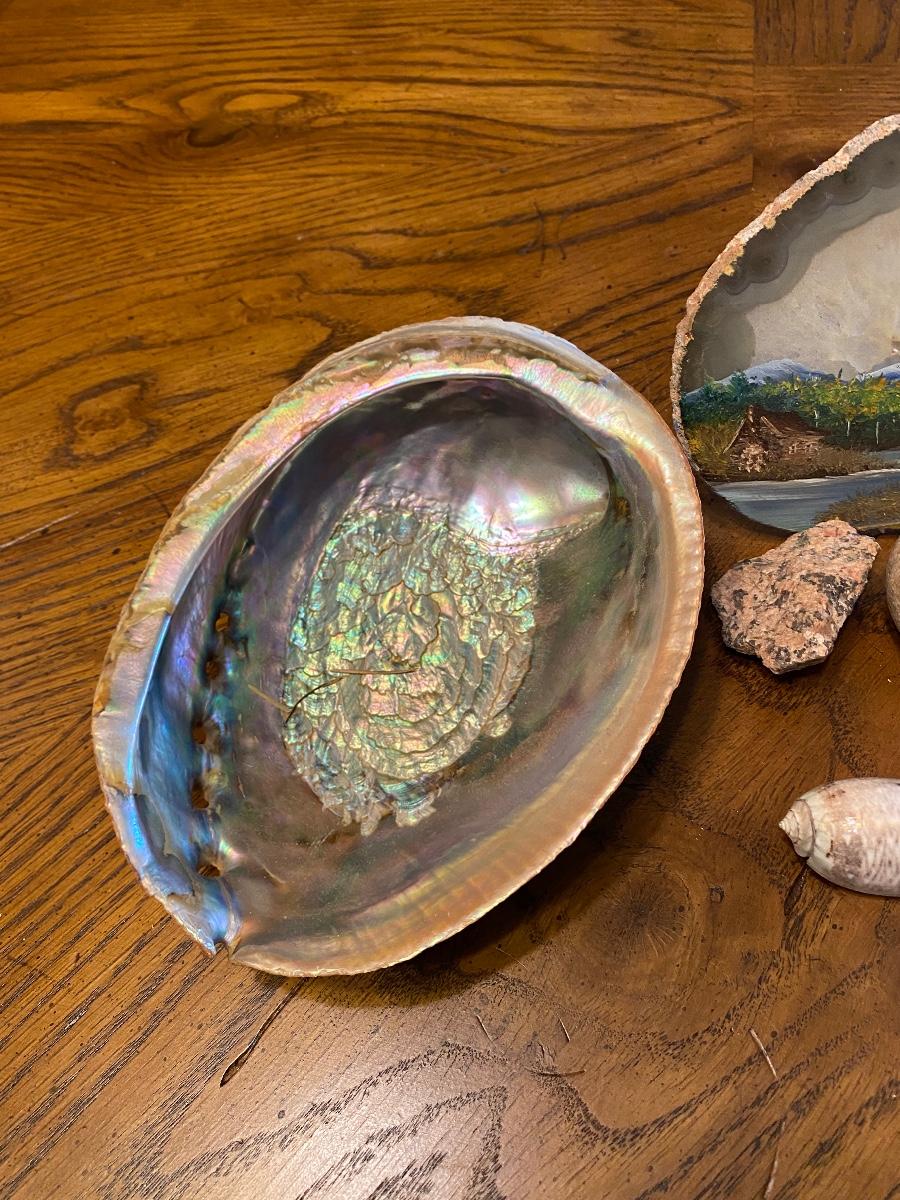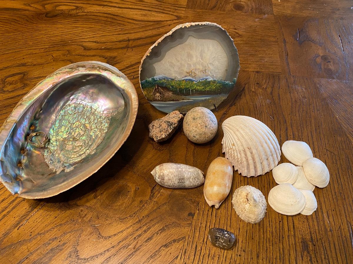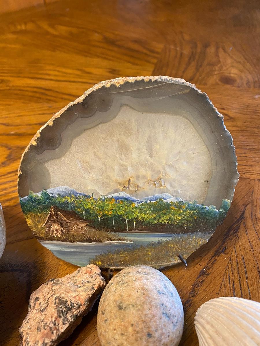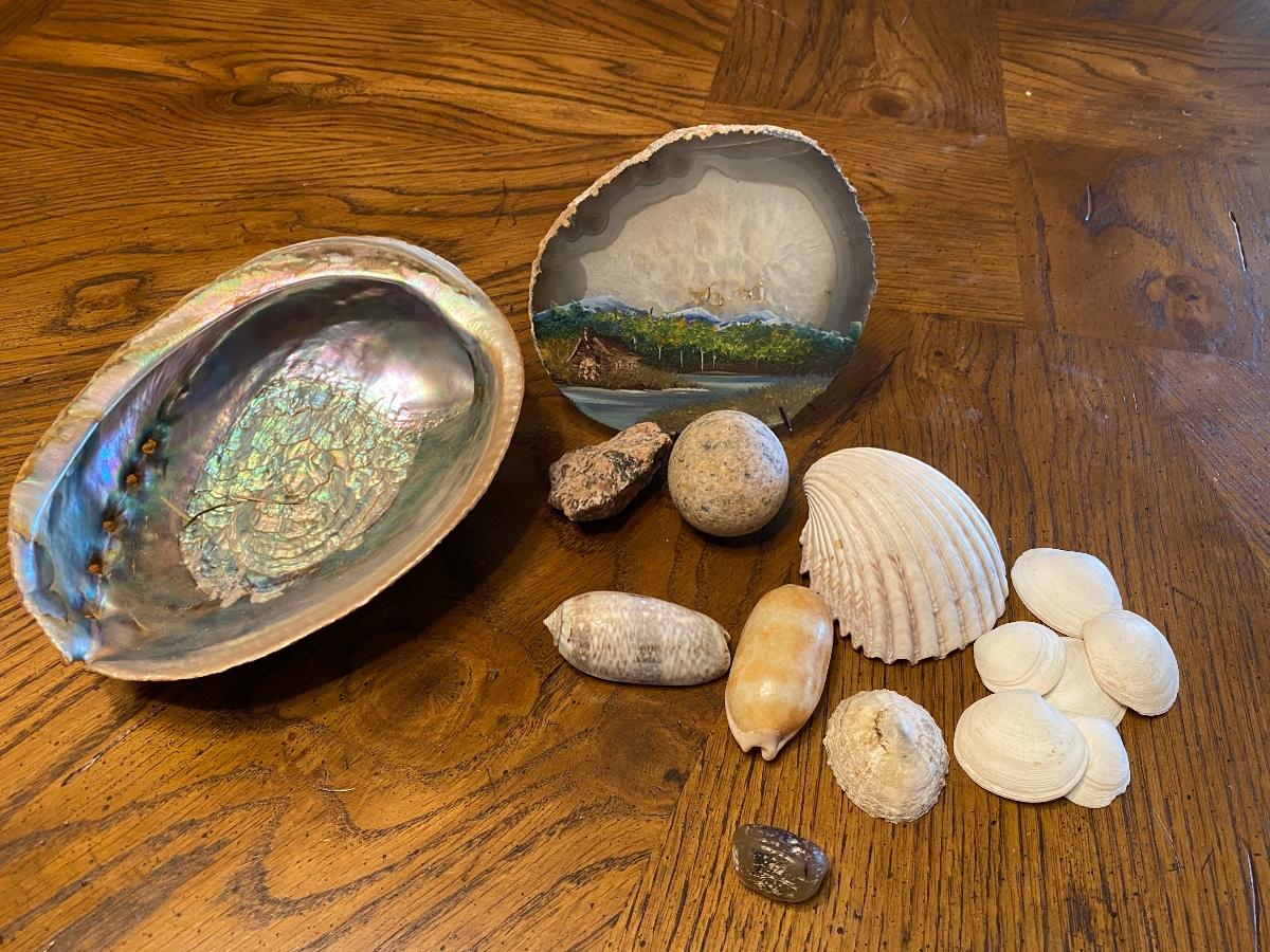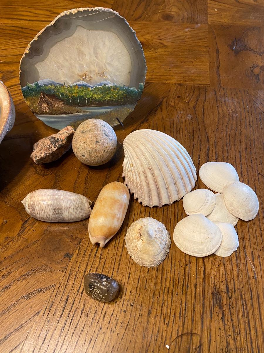Mixed seashell lot and a scenery painted geode slice.