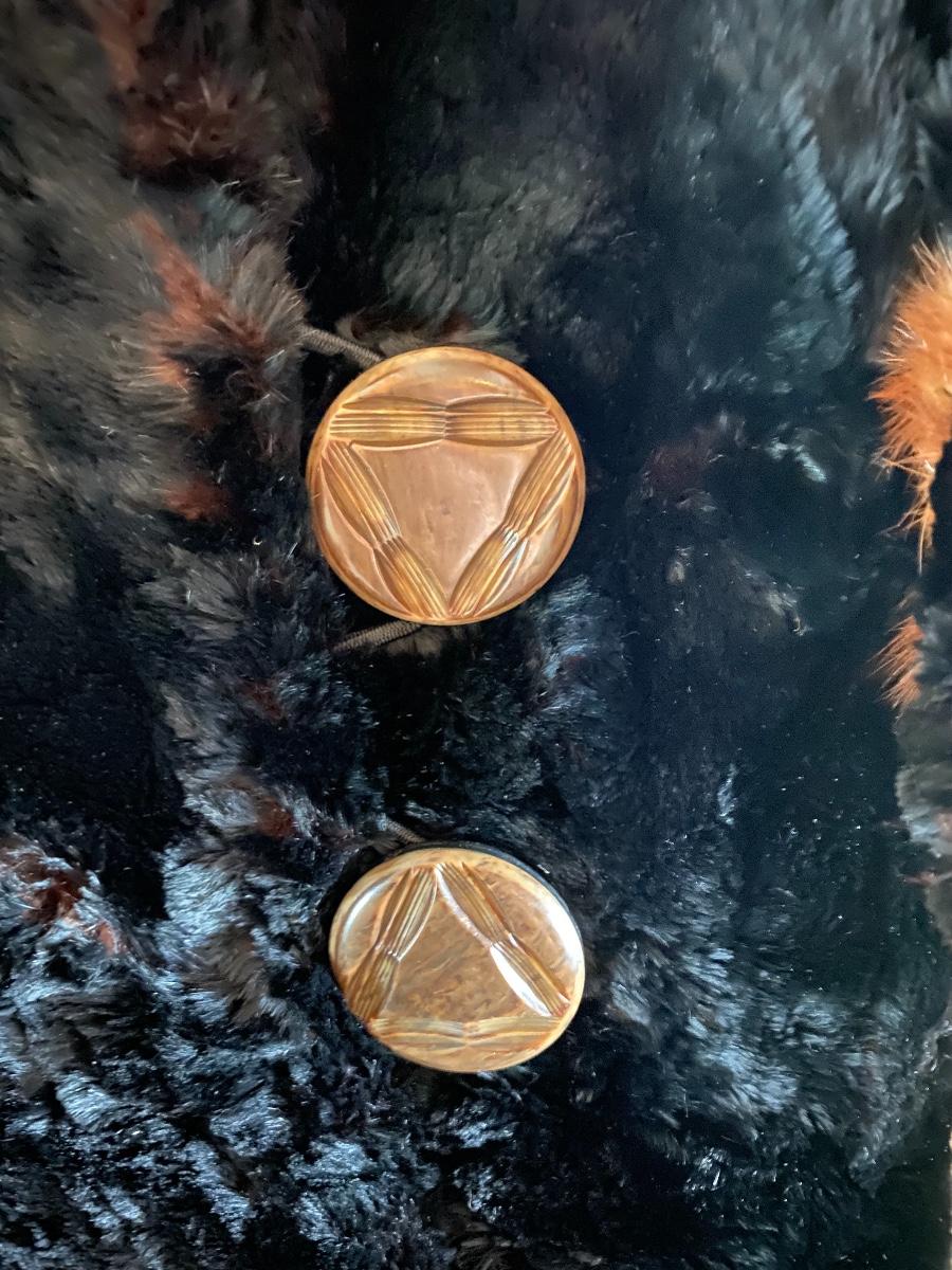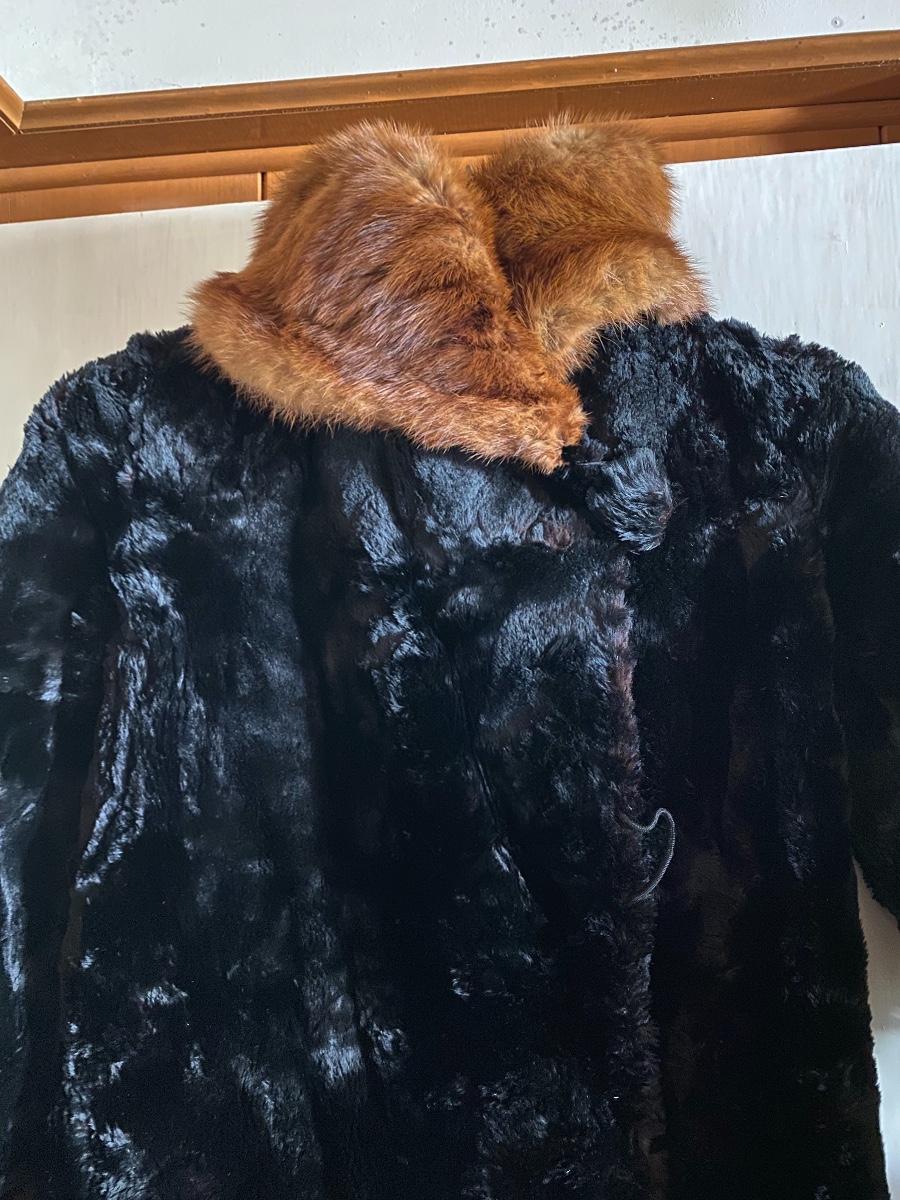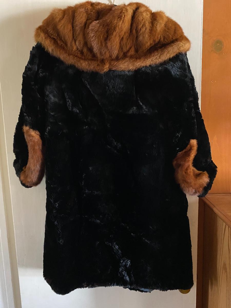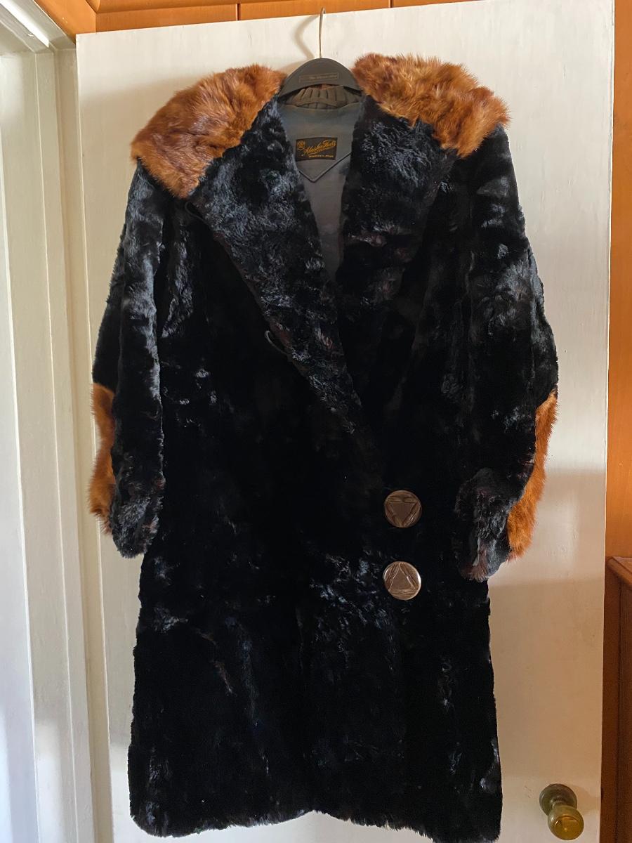 Vintage Mid Thigh Fur Coat from Alaska Fur Co. Black and tan fur, soft. Two large visible buttons or fully button to the neck with two additional fur covered buttons. No outer pockets, one inside. No size but would say a small medium, narrow shoulders couldn't get it on. In good vintage condition.