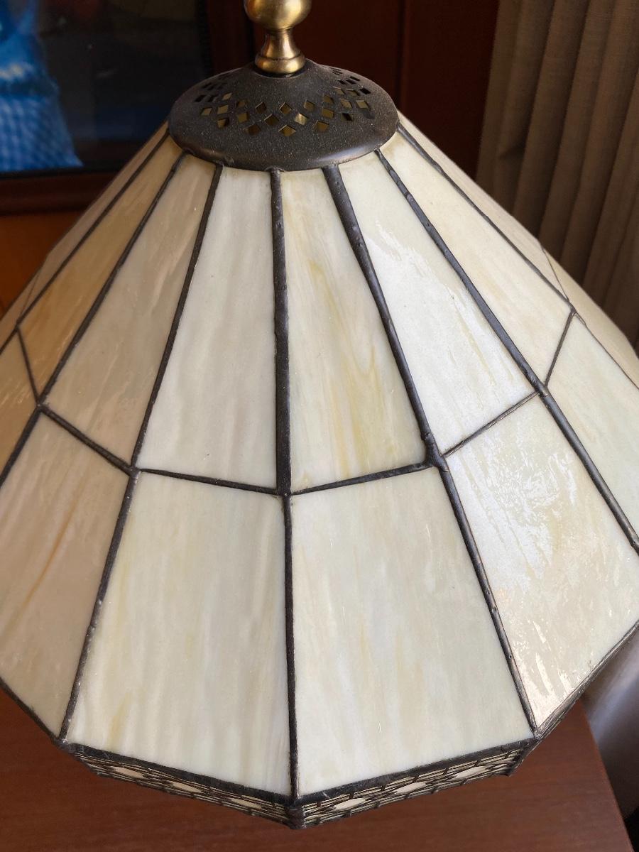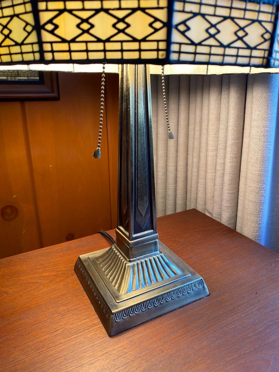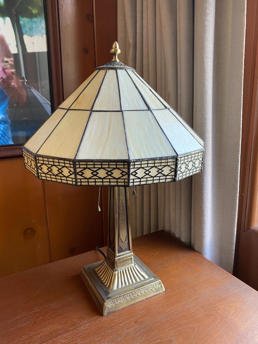 Tiffany style lamp. Slag glass shade, art deco look. Works. Has pull chain at bulb and a switch on cord. About 20" size.