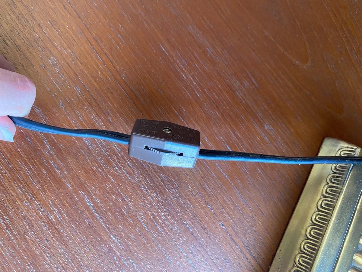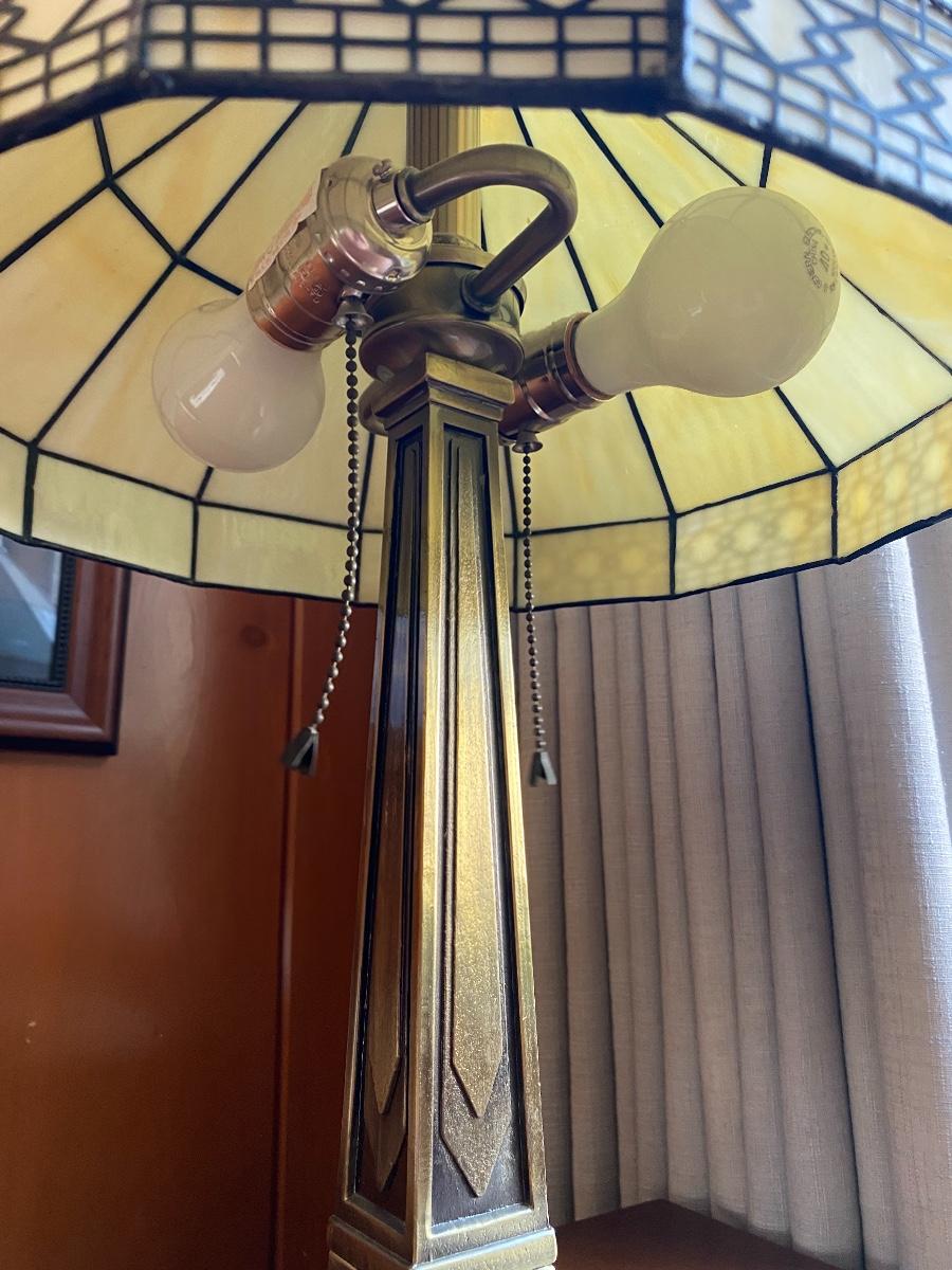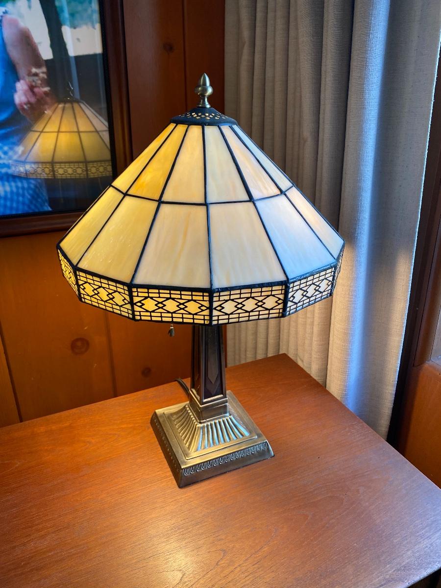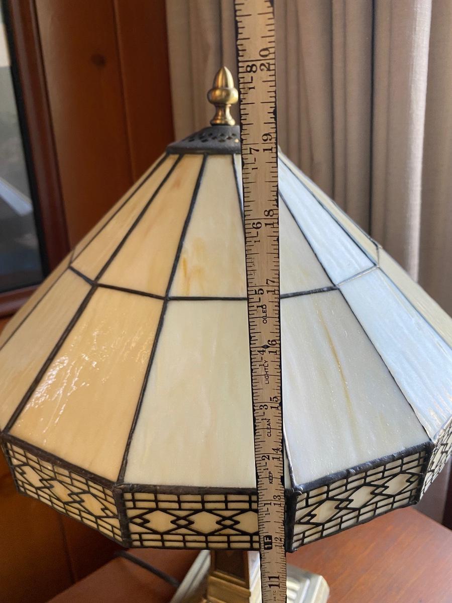 Tiffany style lamp. Slag glass shade, art deco look. Works. Has pull chain at bulb and a switch on cord. About 20" size.