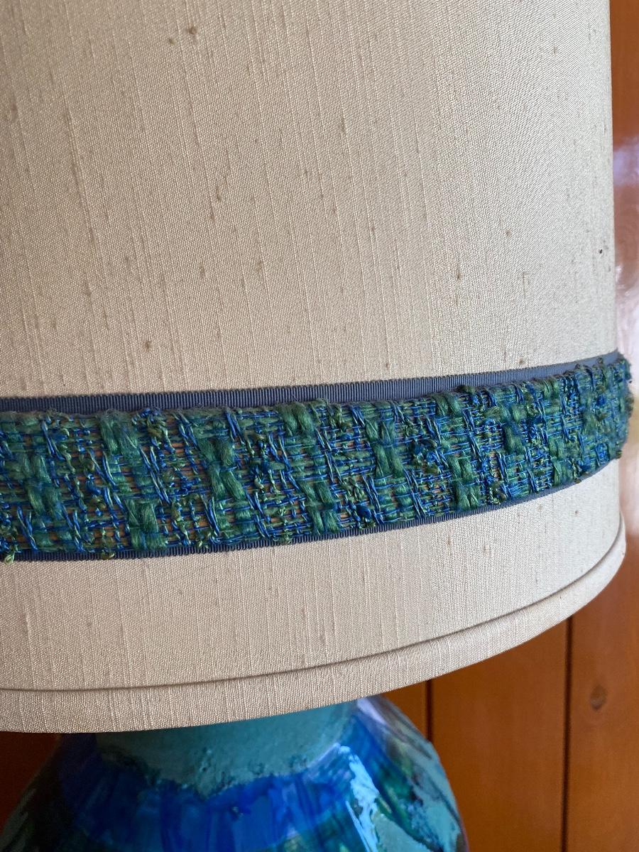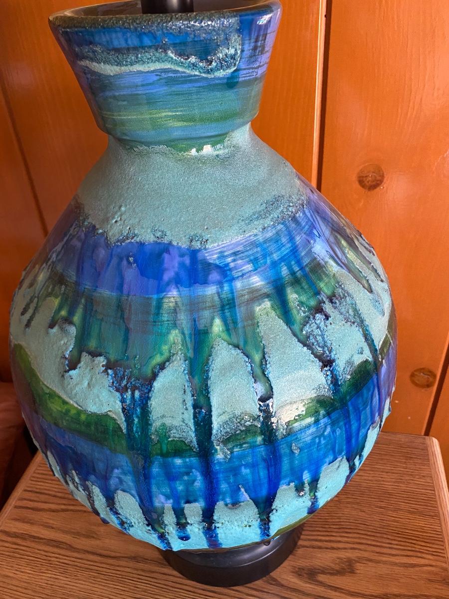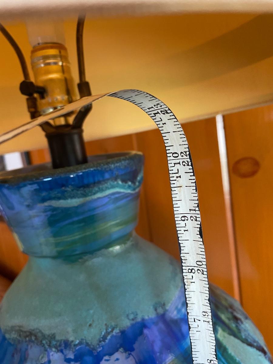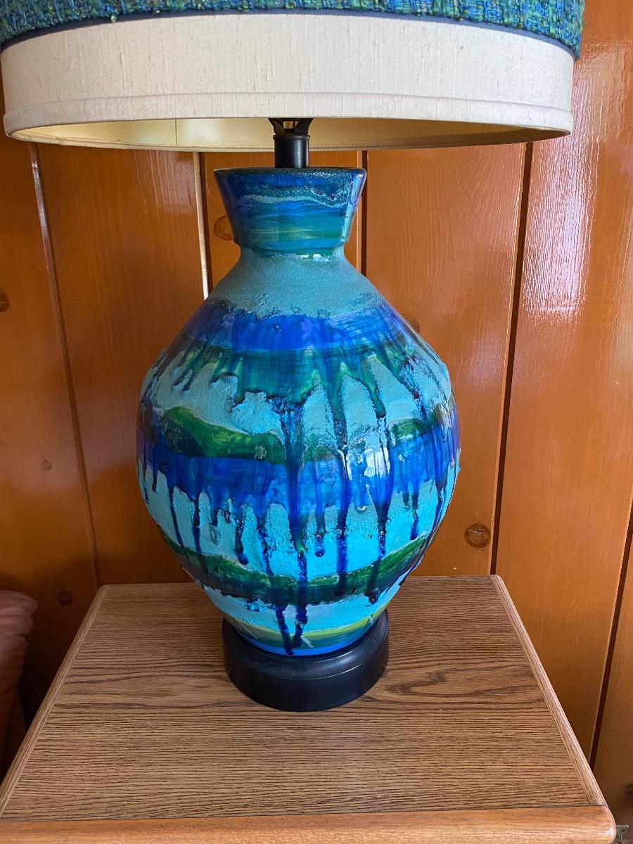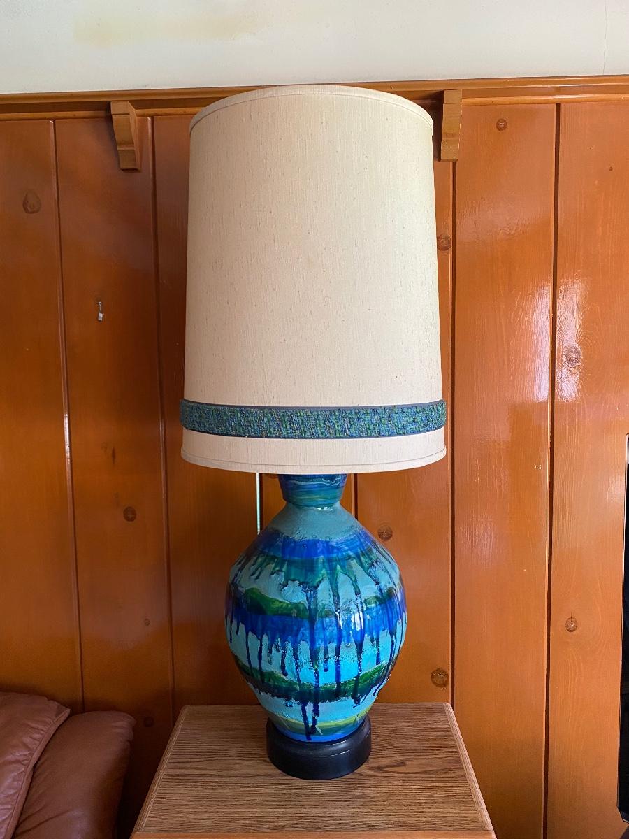 Cool vintage large table lamp. Blue drip glaze pottery base, matching trim lamp shade. Huge, about 45" total height. In good condition