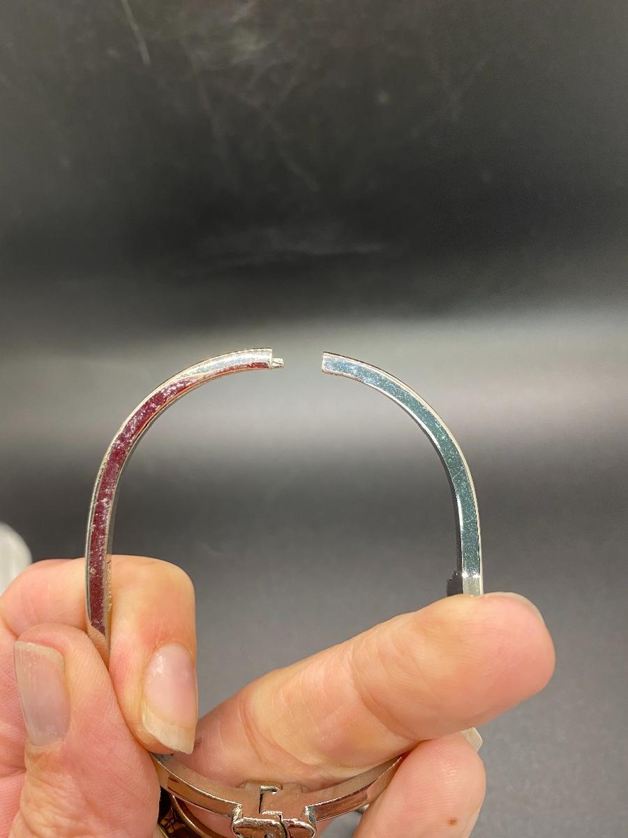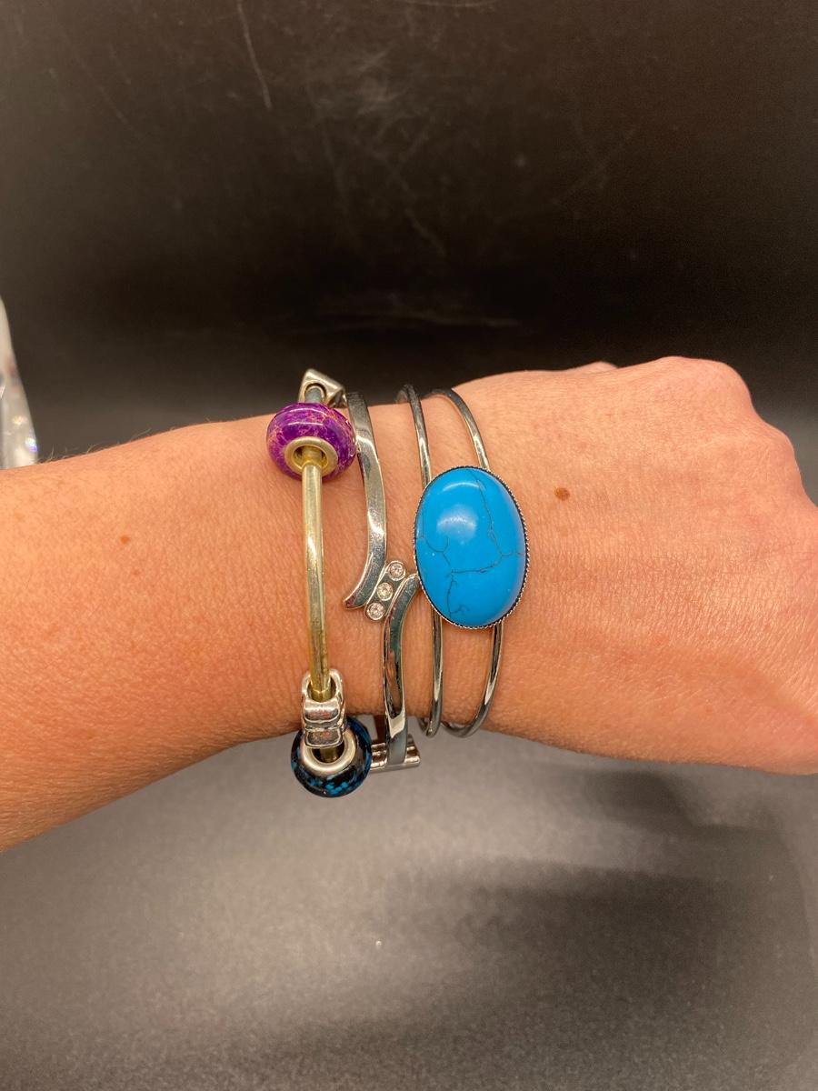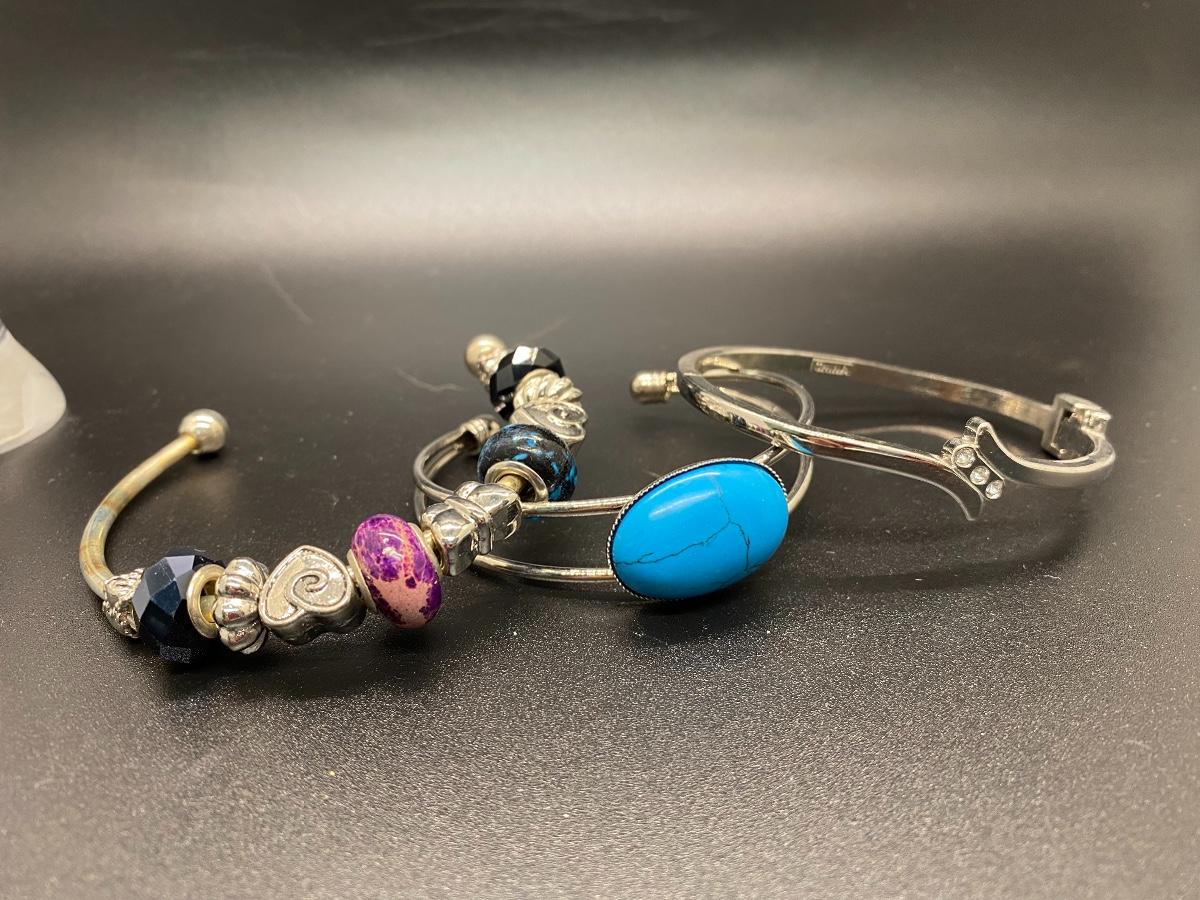 Set of three silver tone cuff and bangle style bracelets. All in good previously owned condition. The bangle is hinged. Faux turquoise cabochon cuff and the beaded cuff can have beads taken off or added.