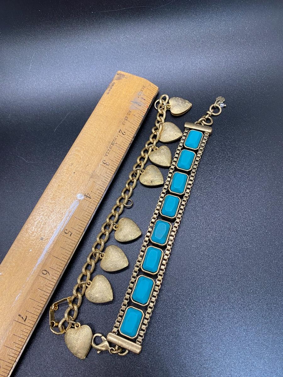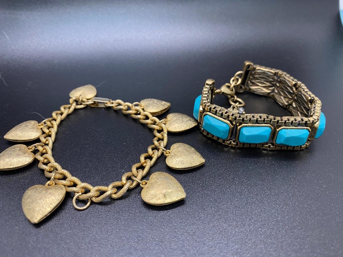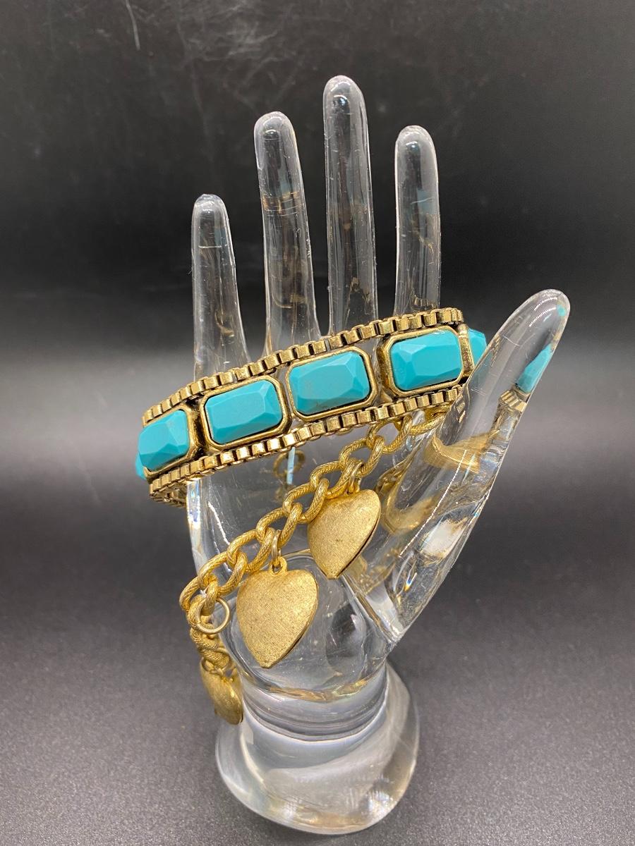 Pair of vintage goldstone bracelets. 1960 1970 look. Textured heart charm bracelet and faux turquoise heavy link bracelet. Heart bracelet is missing one heart but not noticeable when wearing. About 7" length.