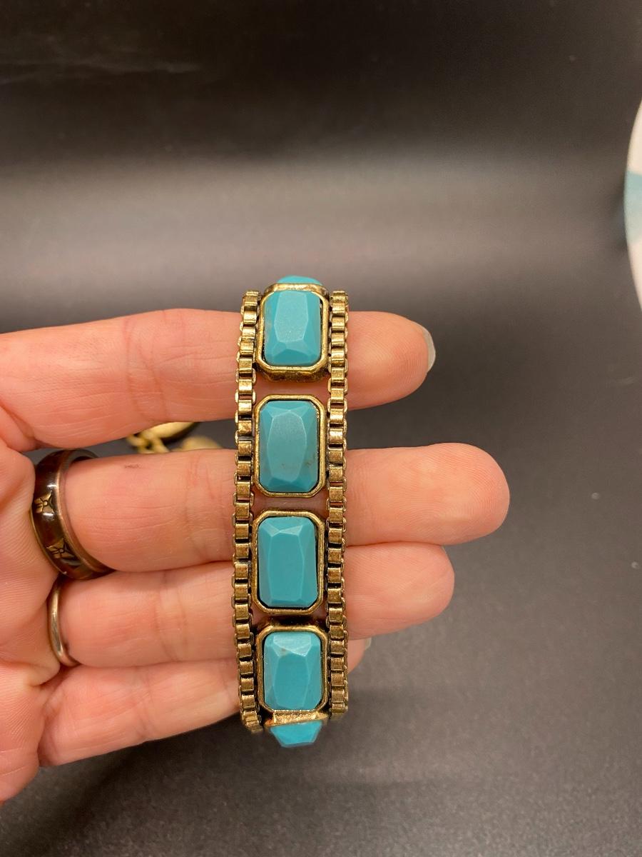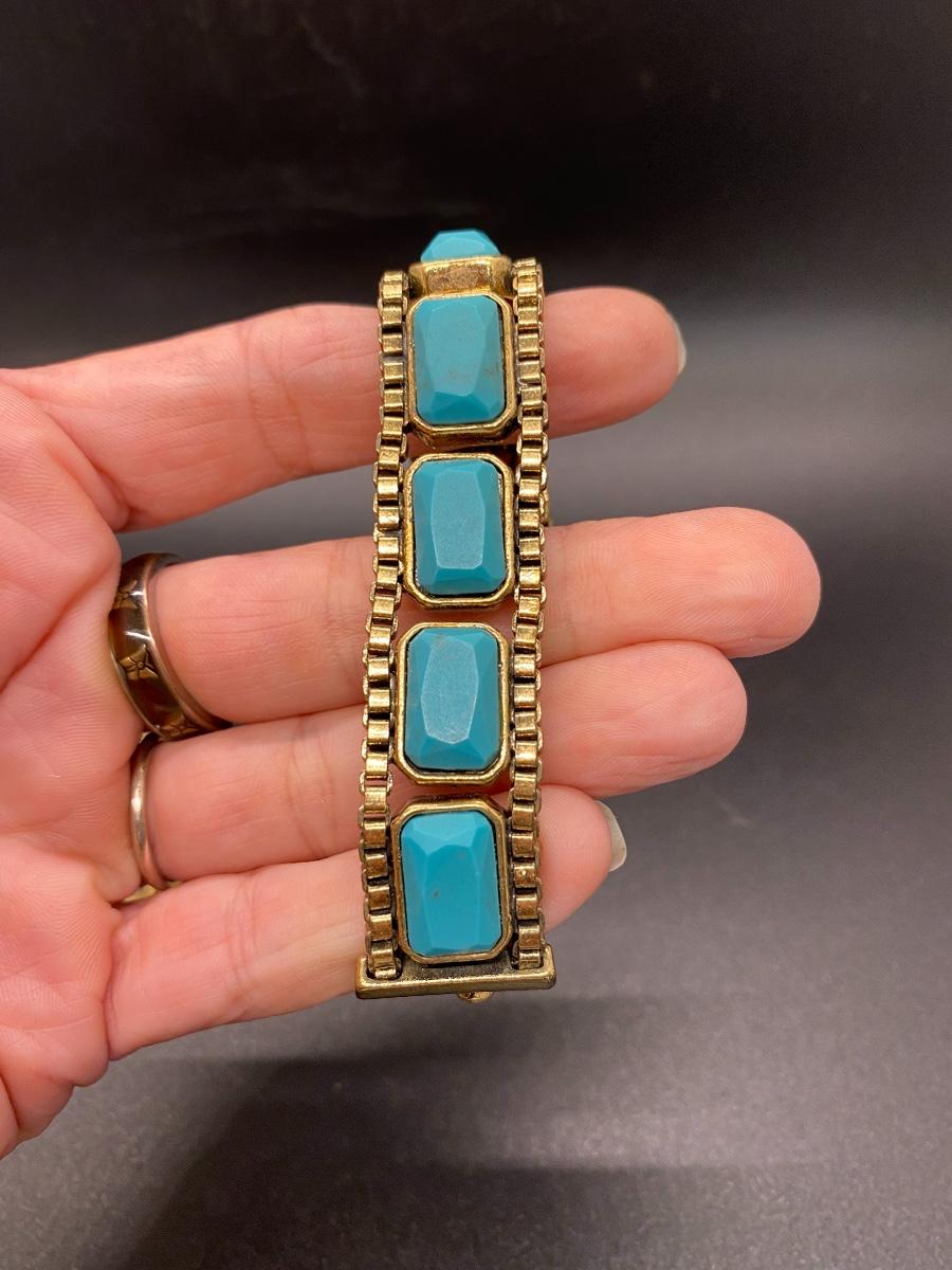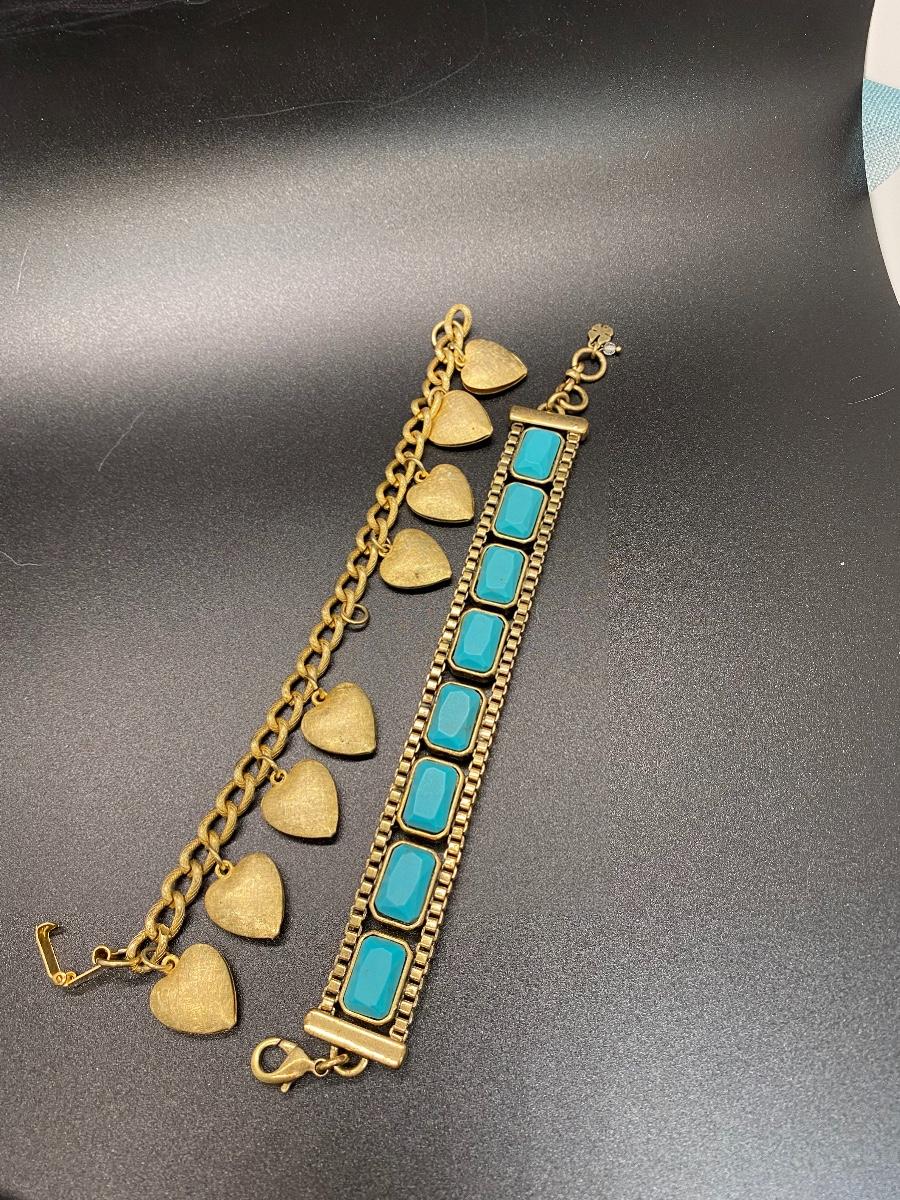 Pair of vintage goldstone bracelets. 1960 1970 look. Textured heart charm bracelet and faux turquoise heavy link bracelet. Heart bracelet is missing one heart but not noticeable when wearing. About 7" length.