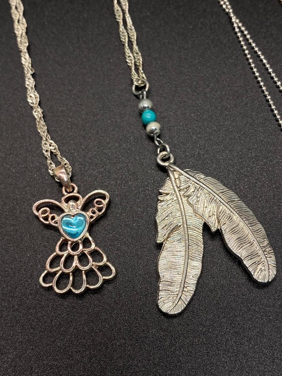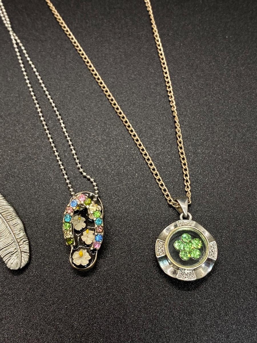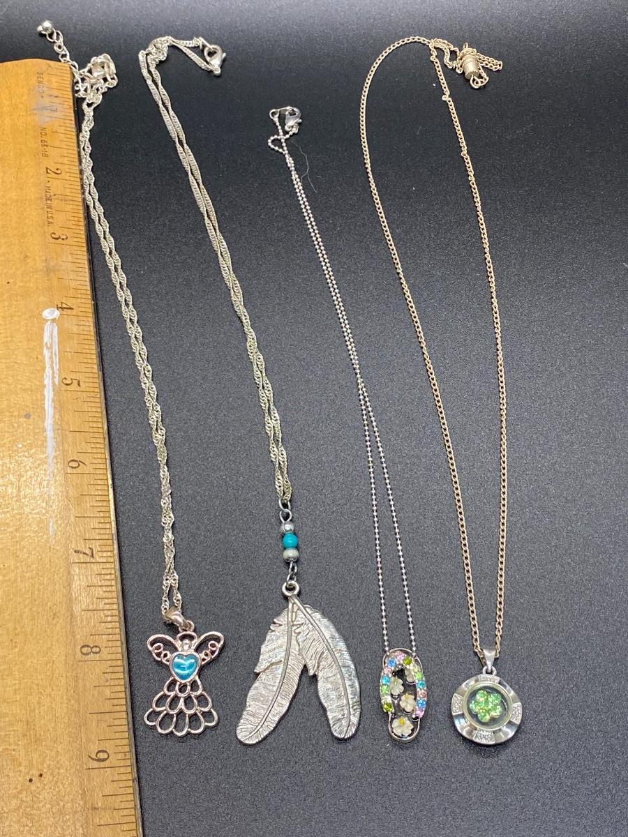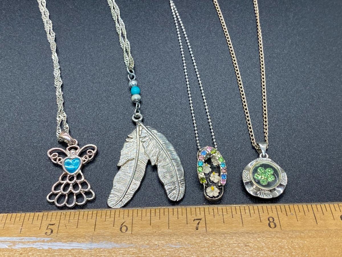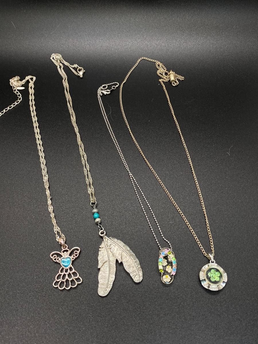 Set of 4 fashion necklaces. Each with a different pendant. Silvertone metal.