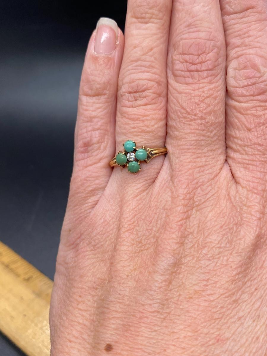Dainty vintage green jade cabochon flower ring. 14k yellow gold setting, possible diamond center in the flower. Initials are engraved on the inside. 2.8g tw. Fits a size 6.