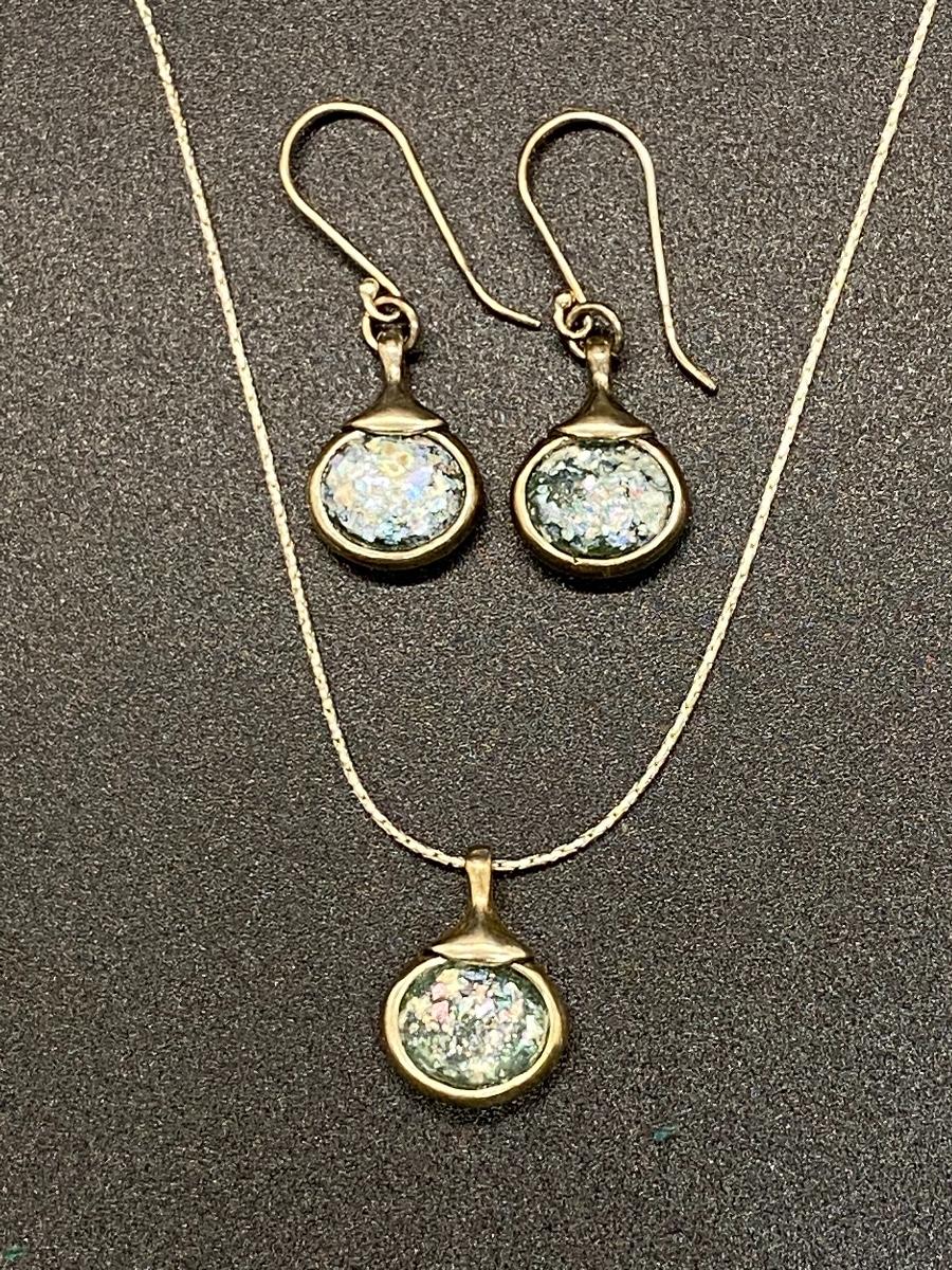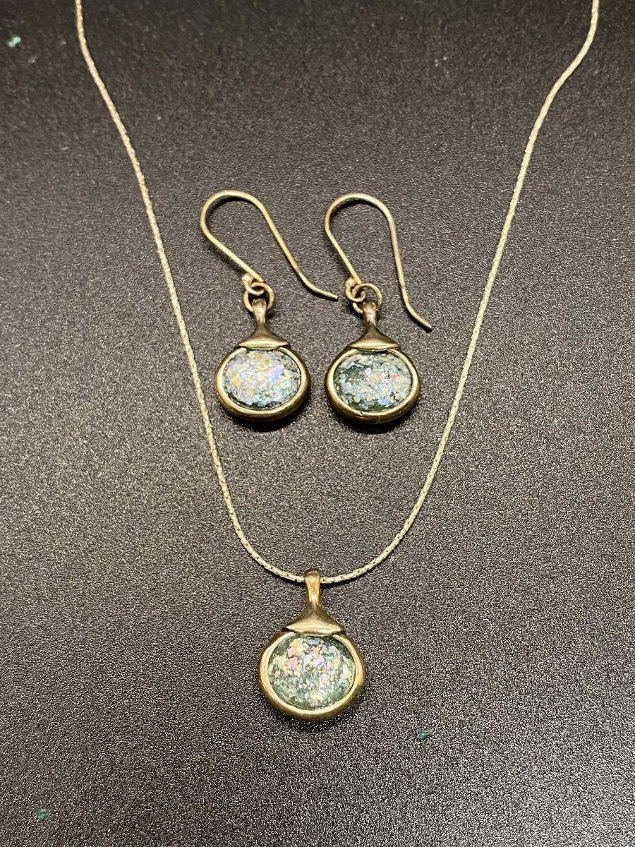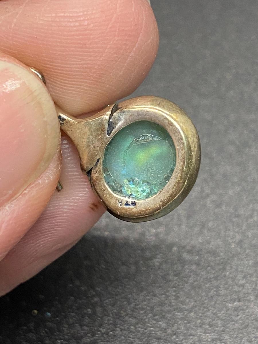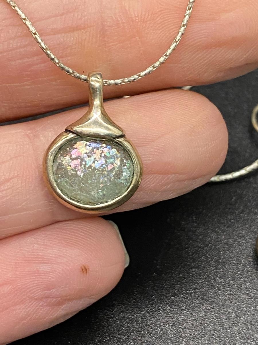 Sterling silver jewelry set. Matching pendant and earrings. Centerpiece is an iridescent glass or stone. Good condition.