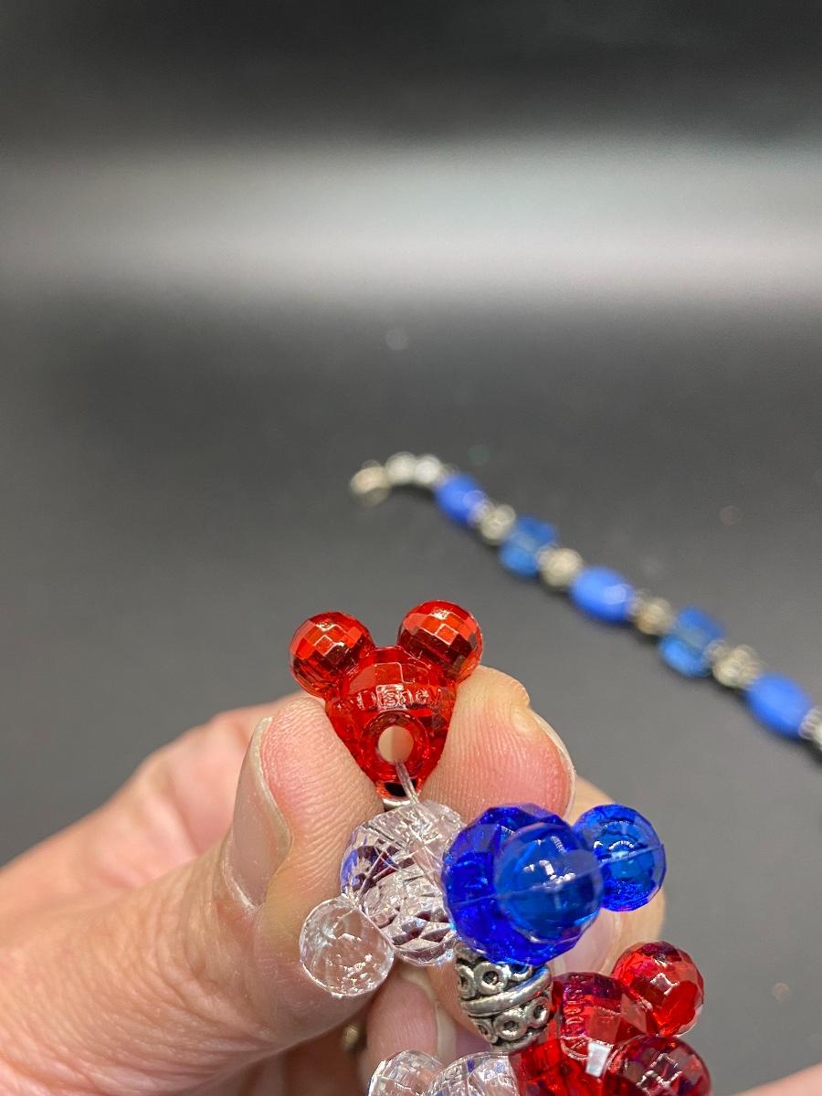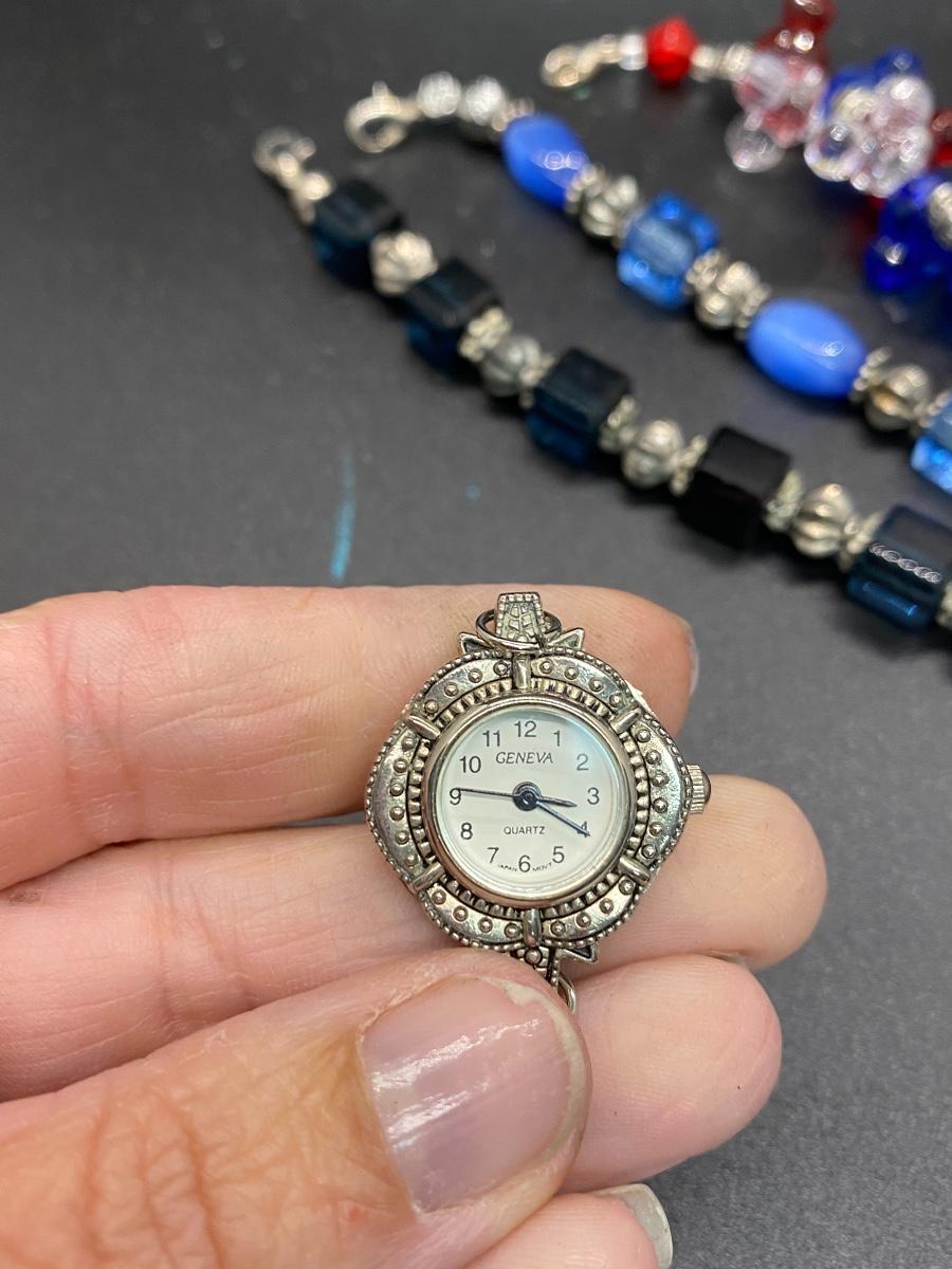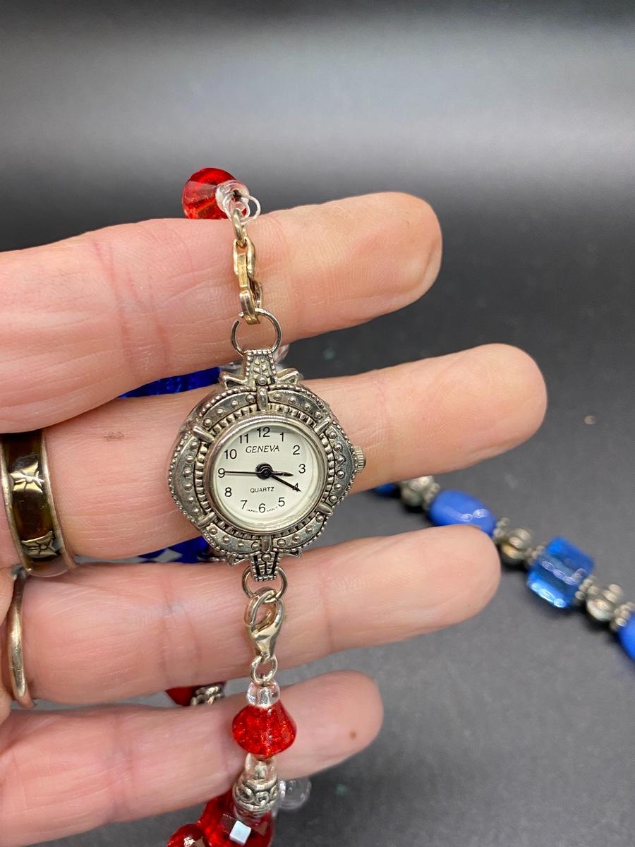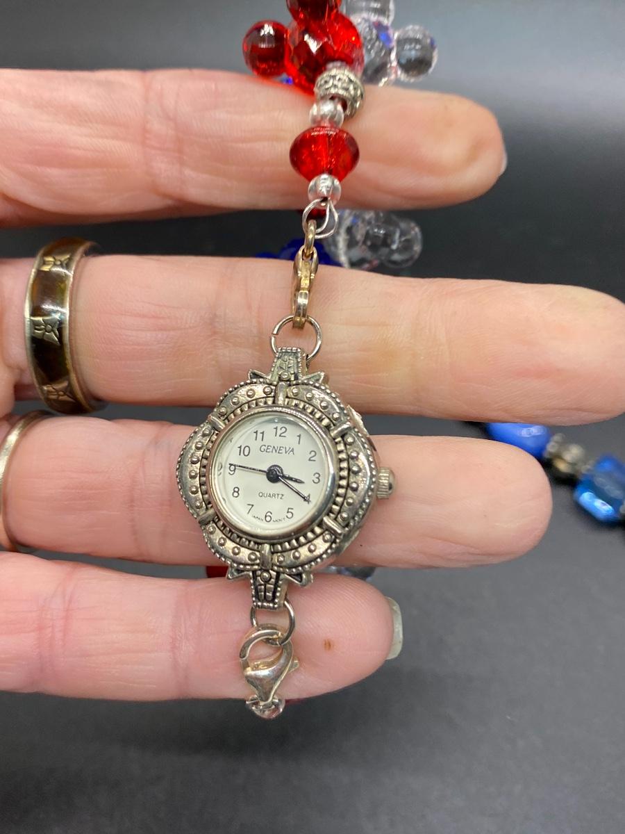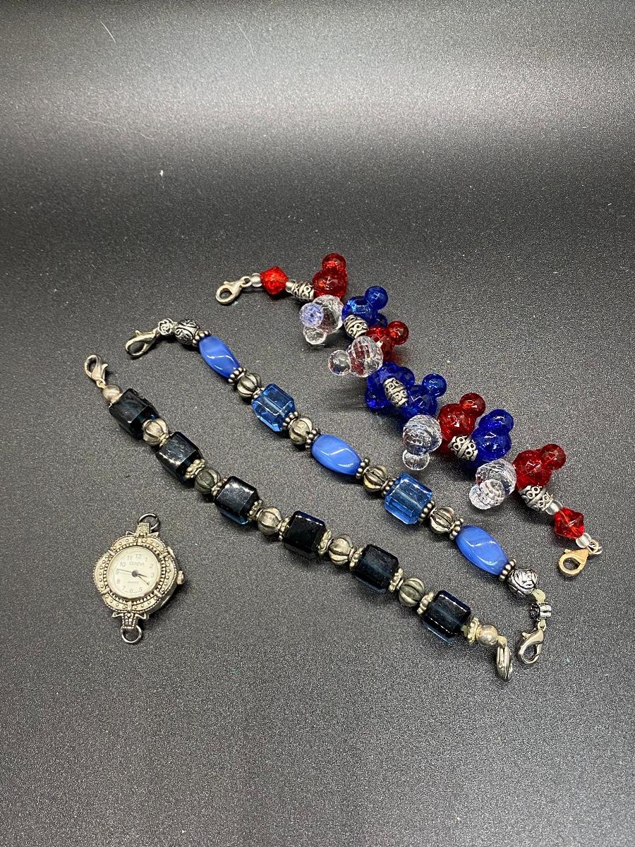 Ladies wristwatch with removeable beaded straps. Looks like a handmade craft. The red, clear and blue beads are Mickey heads.