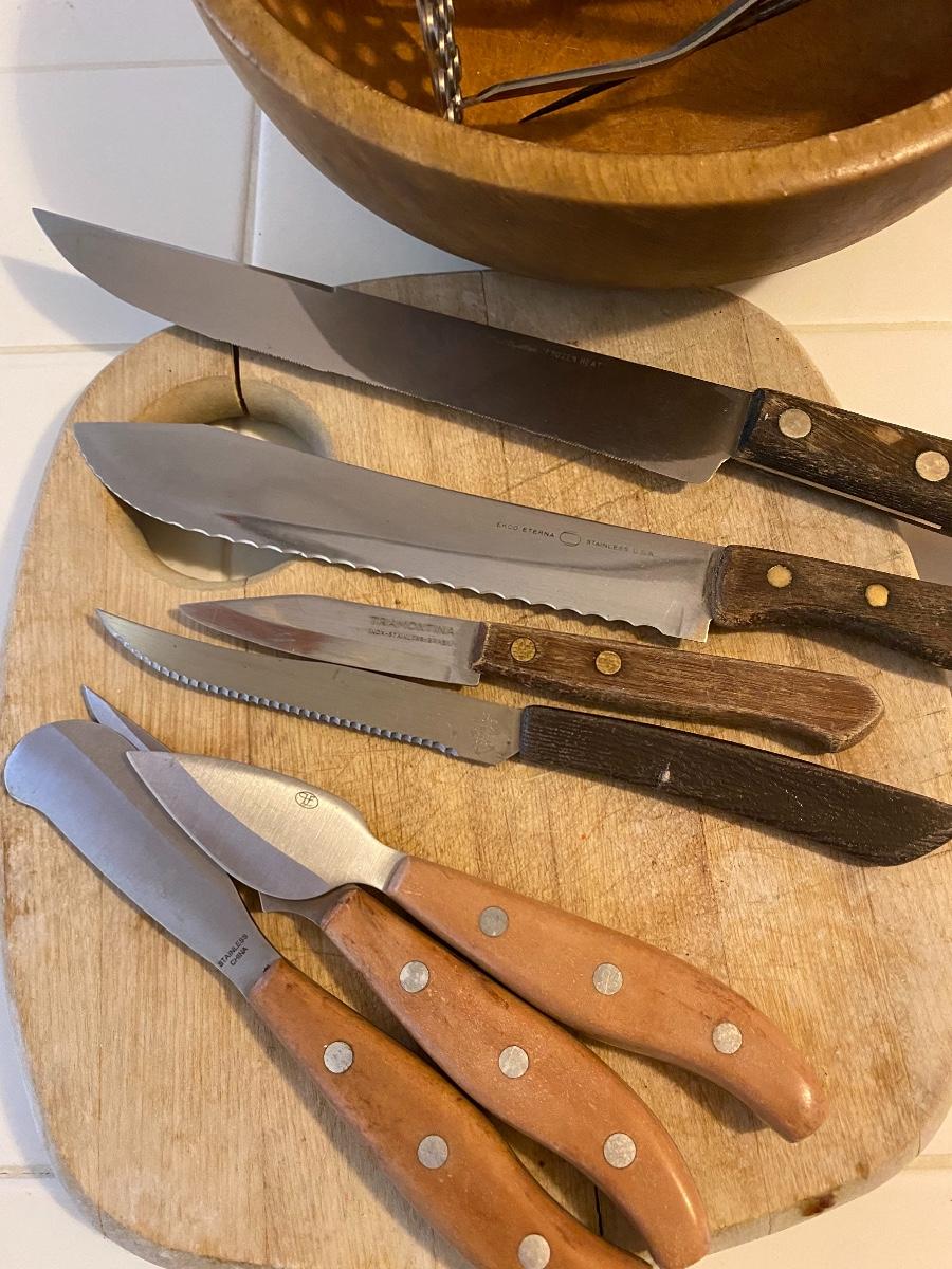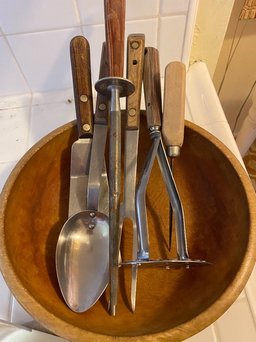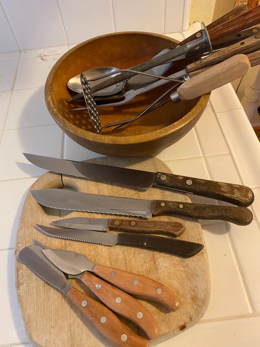 Vintage Wood Handle Utensil Lot, comes with cutting board and bowl.