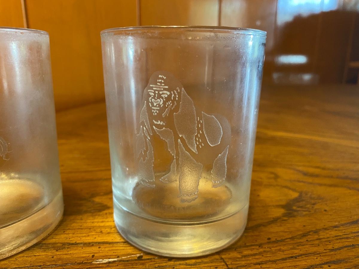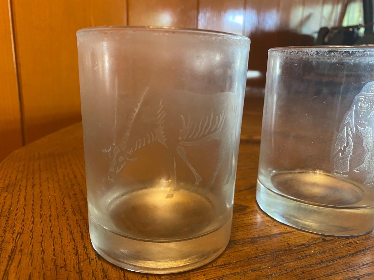 Vintage Wild Animal Etched Rocks Drink Glasses. A lot of water deposit, did not spend a long time trying to clean, not sure how much it will come clean. No chips.