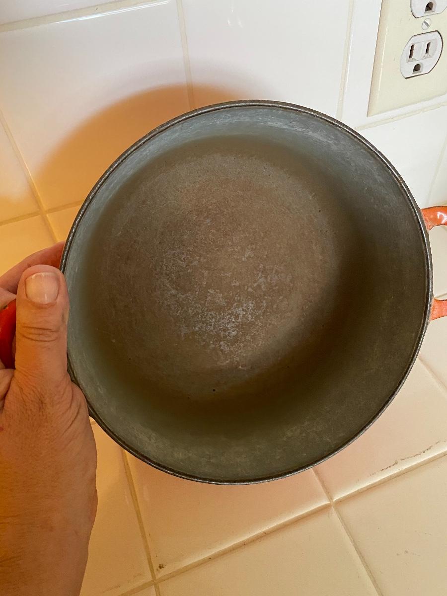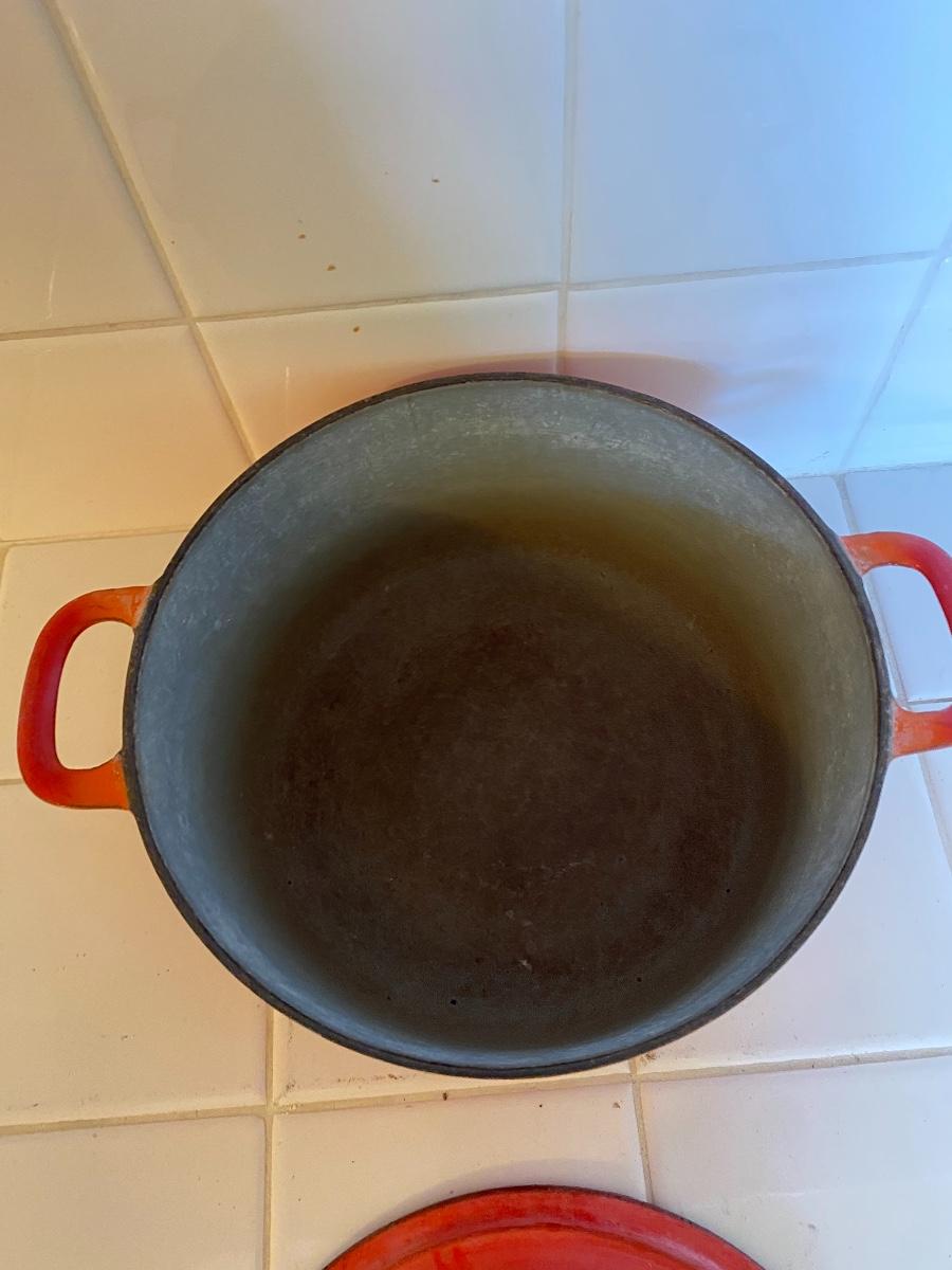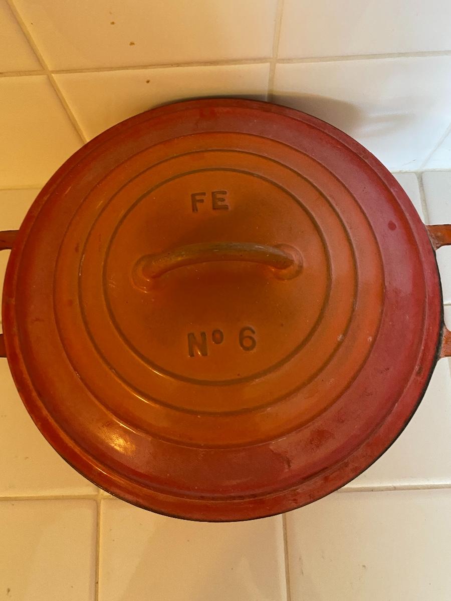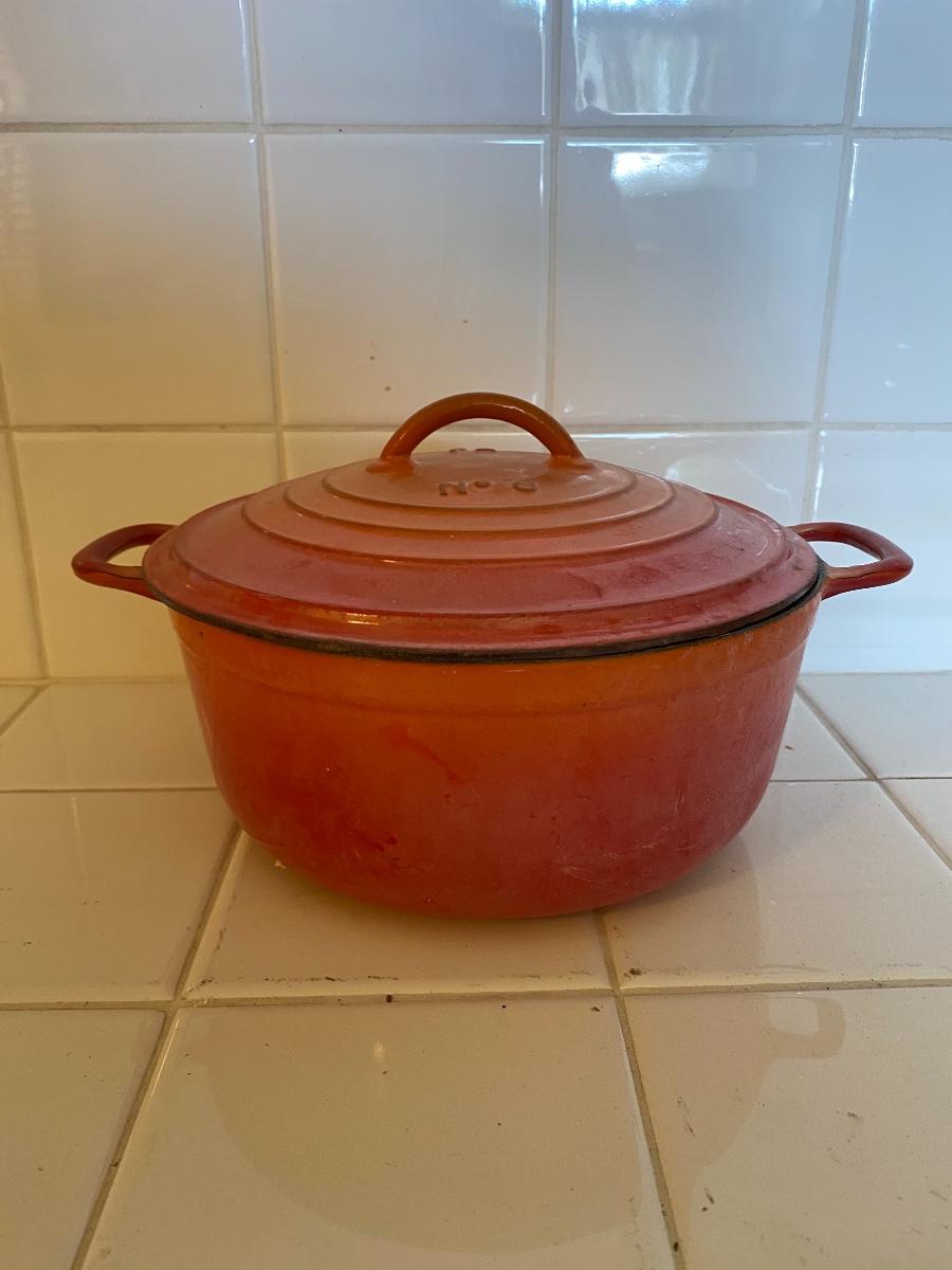 Flame Orange Red Enamel Descoware Small Dutch Oven #6. Oxidation on enamel, maight clean up. Used condition.