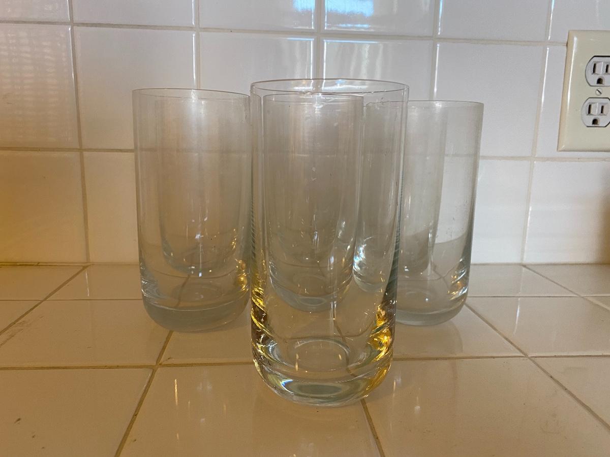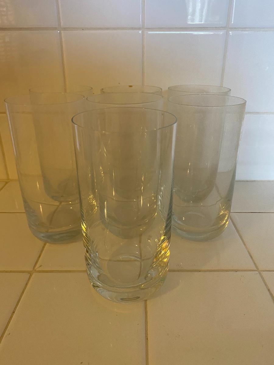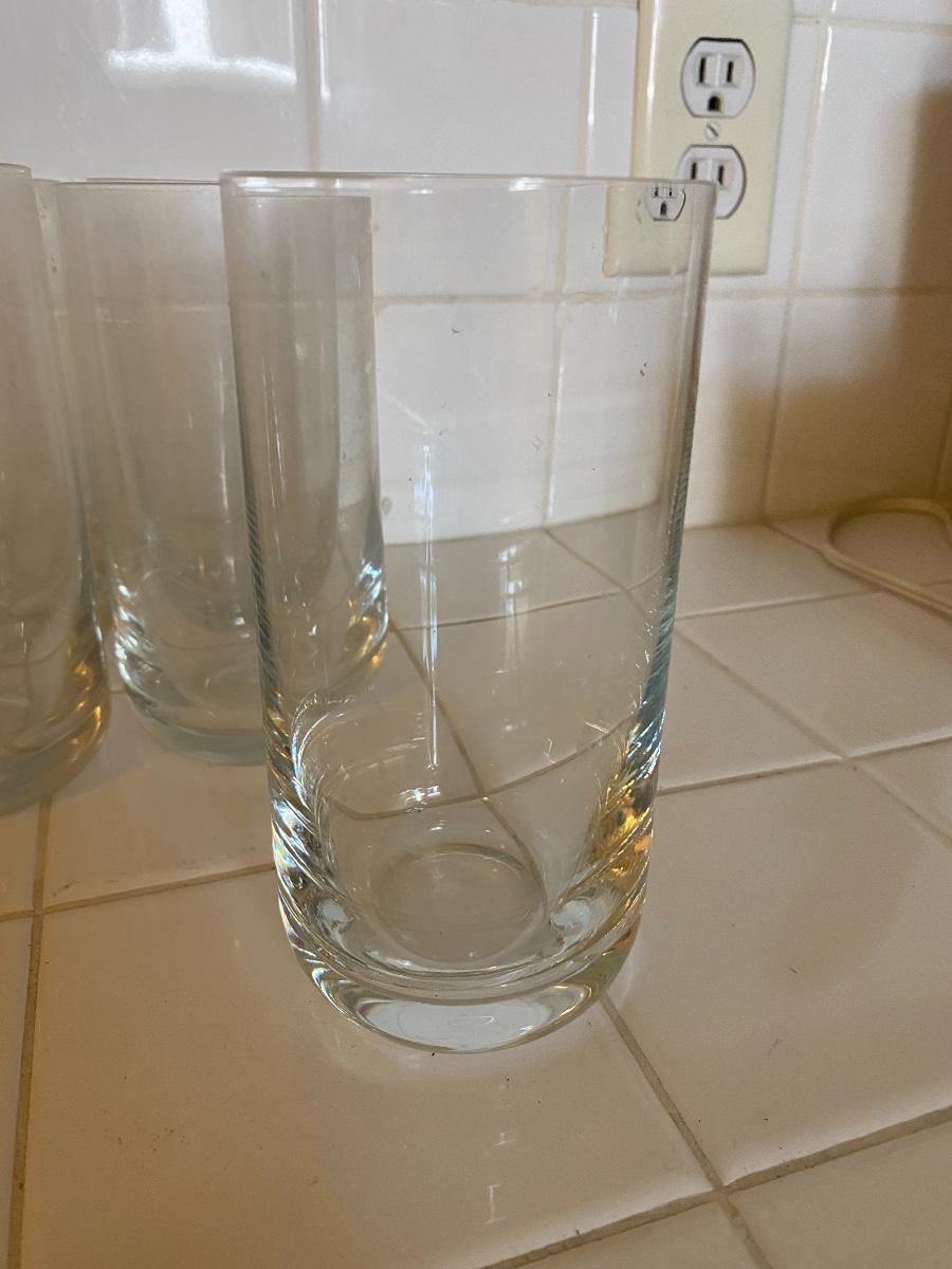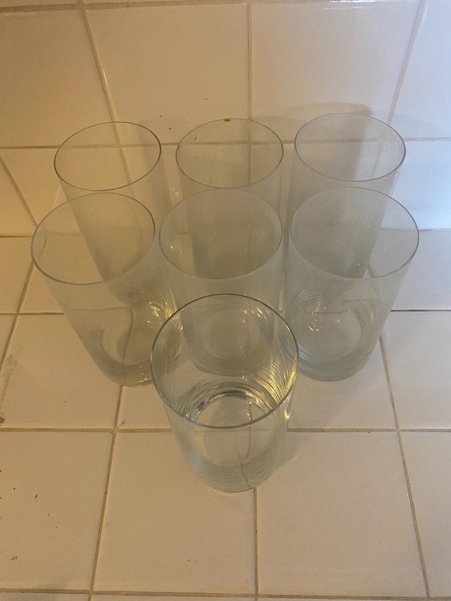 Set of Clear Heavy Bottom Drink Glasses. It is actually a set of 8, one was found in another cupboard. Dusty but good condition.