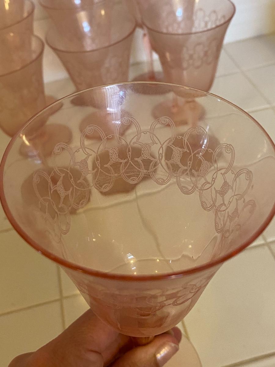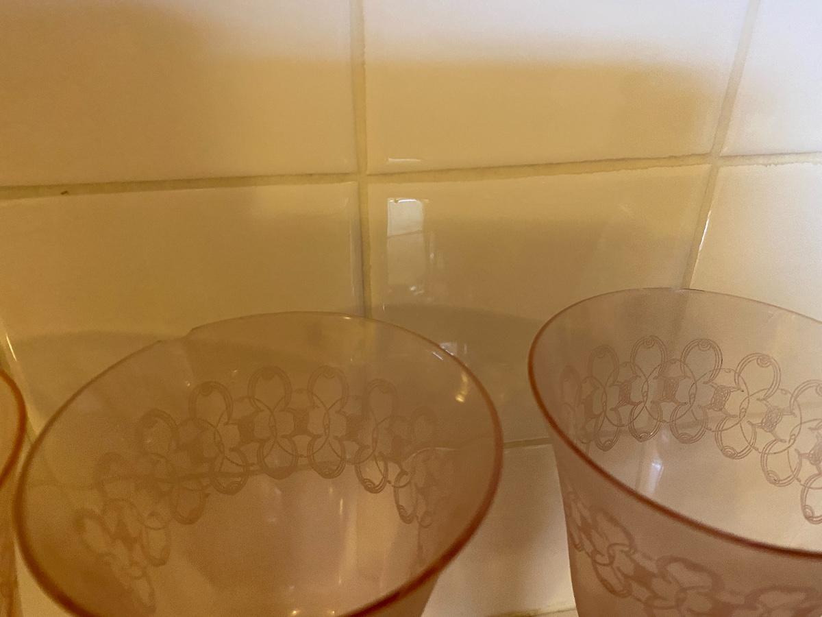 Vintage Pale Pink Etched Wine Water Goblets. Dusty, two do have chipped edge.