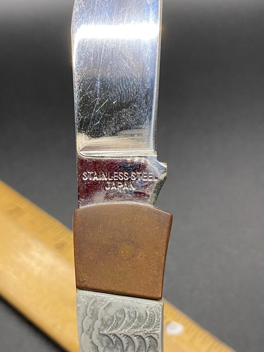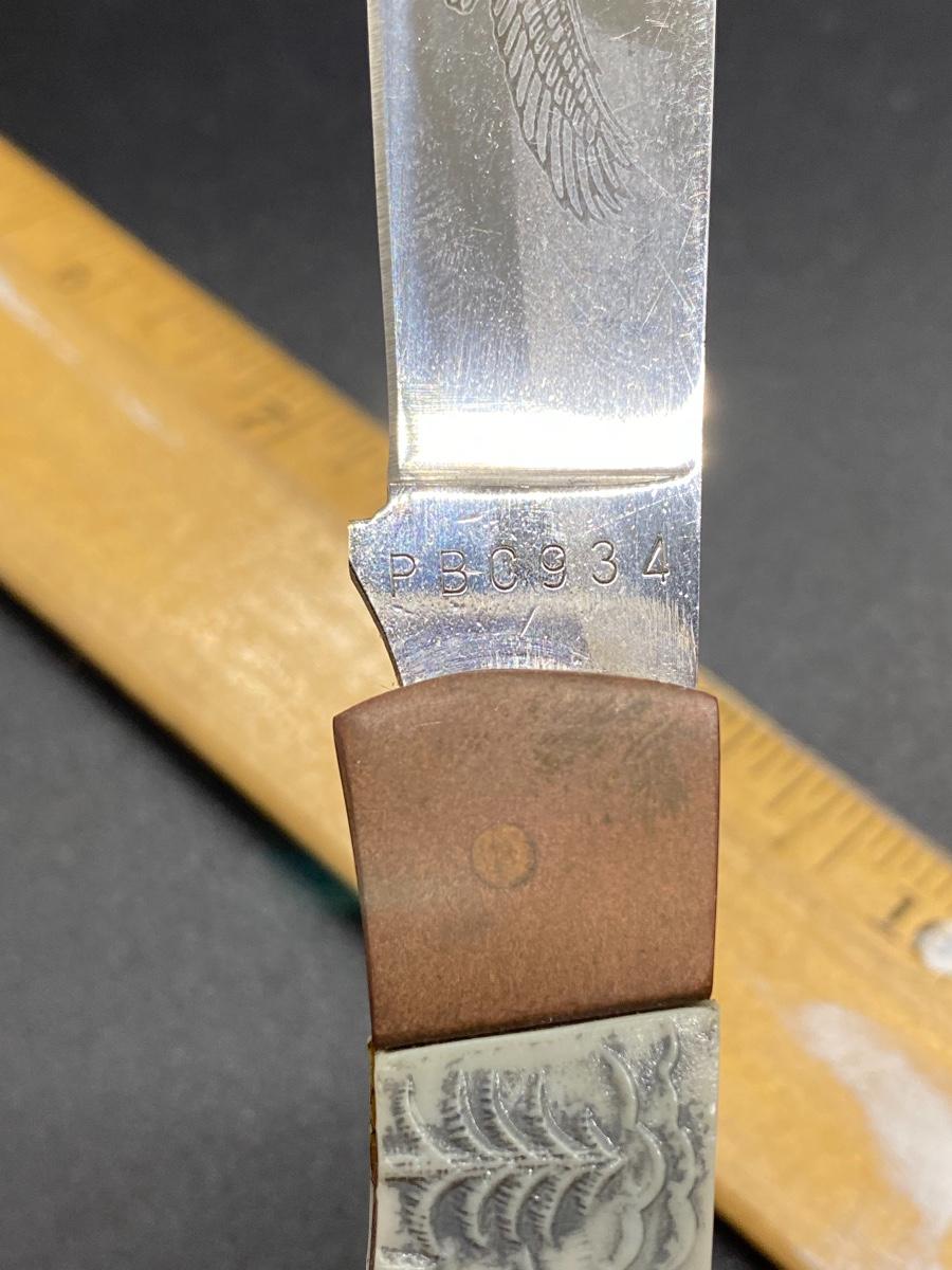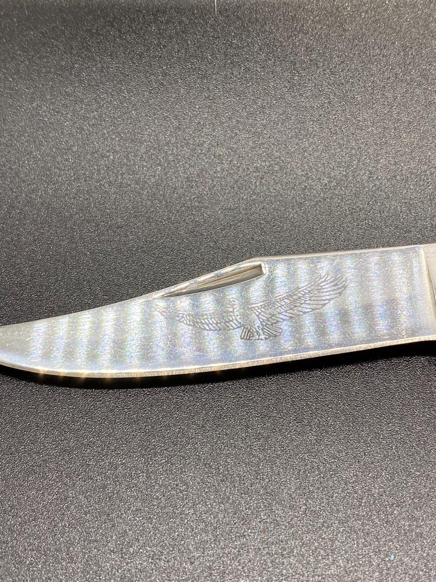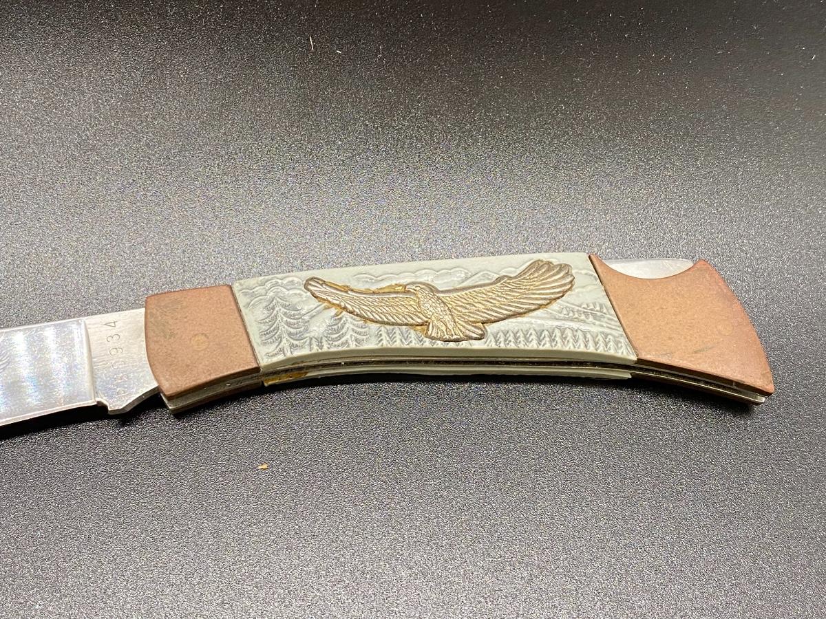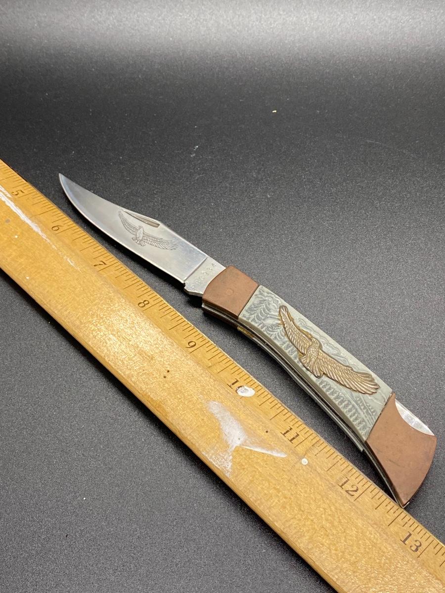 Folding Knife with Eagle on blade and handle. 3" blade, with 4" handle. Push lever lock.