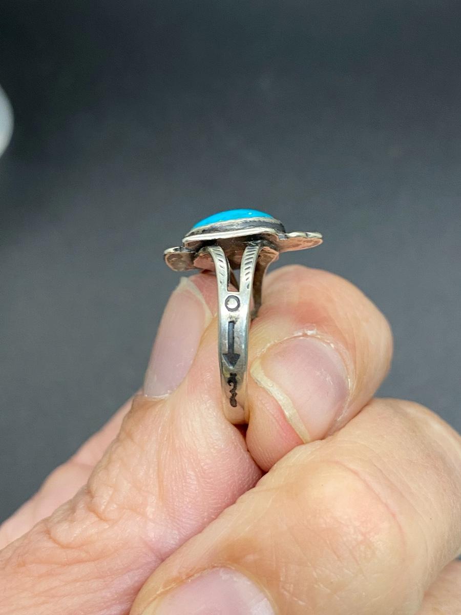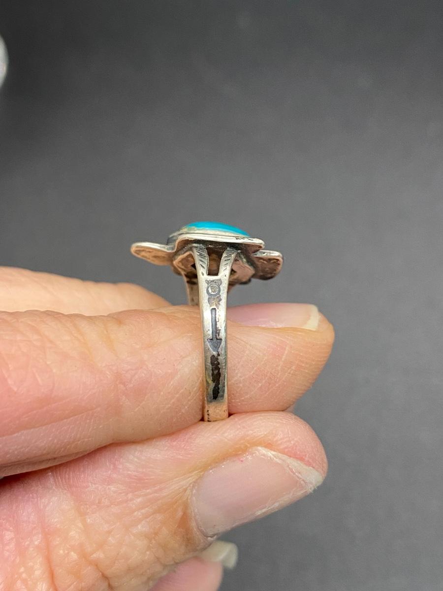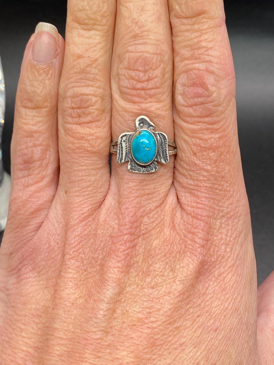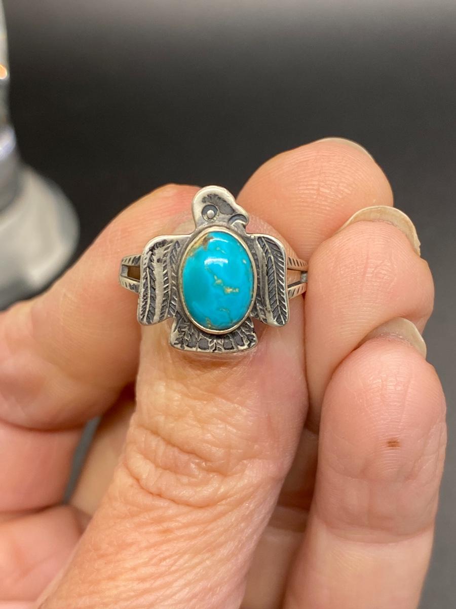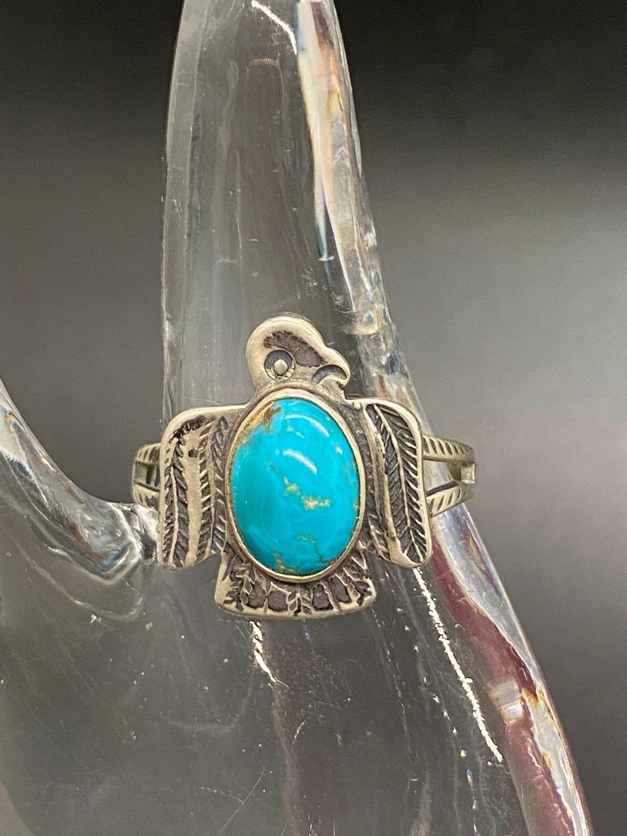 Southwestern Old Pawn Silvertone Turquoise Bird Ring. No markings. Maybe a size 8 or 9