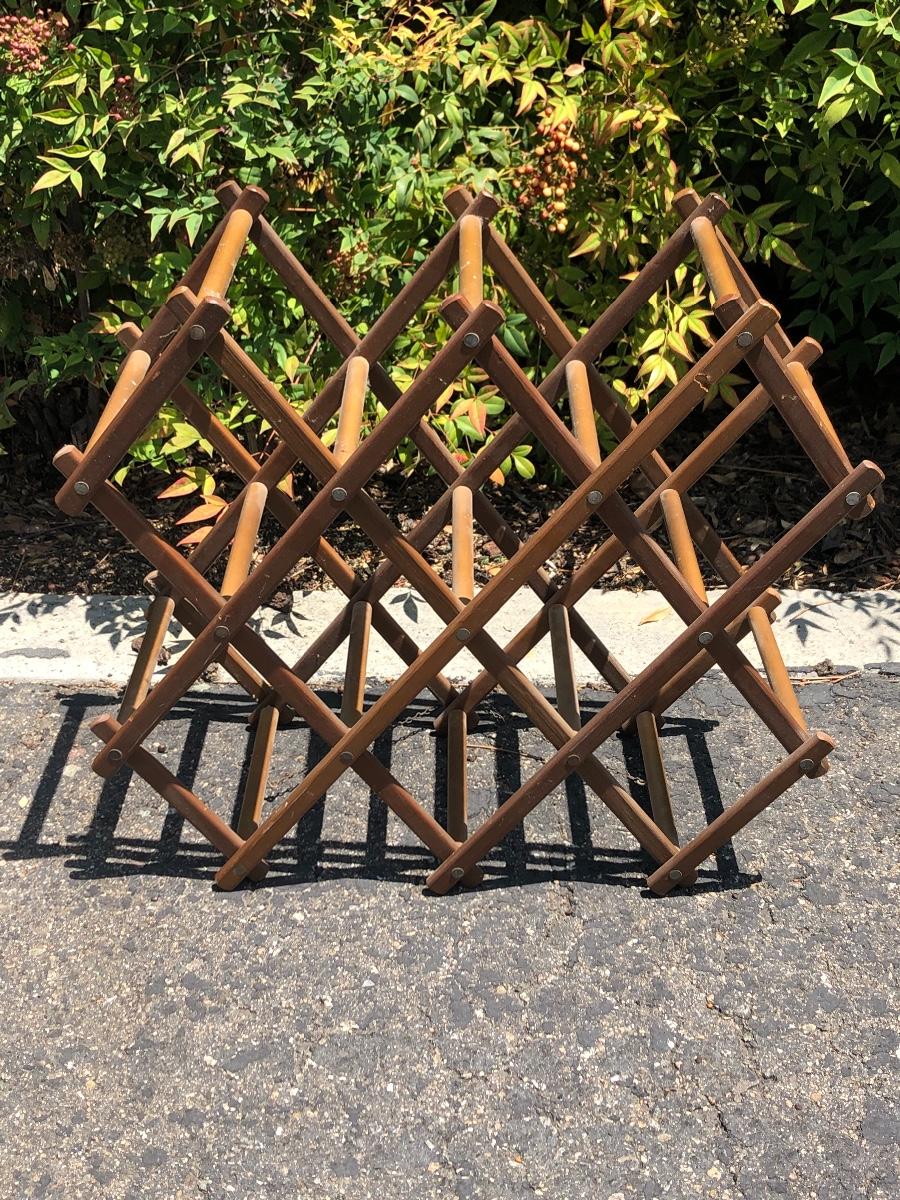 Vintage accordion style wine bottle rack. Holds up to 10 bottles. Good vintage condition. Does have a couple scraps and scuffs from use.