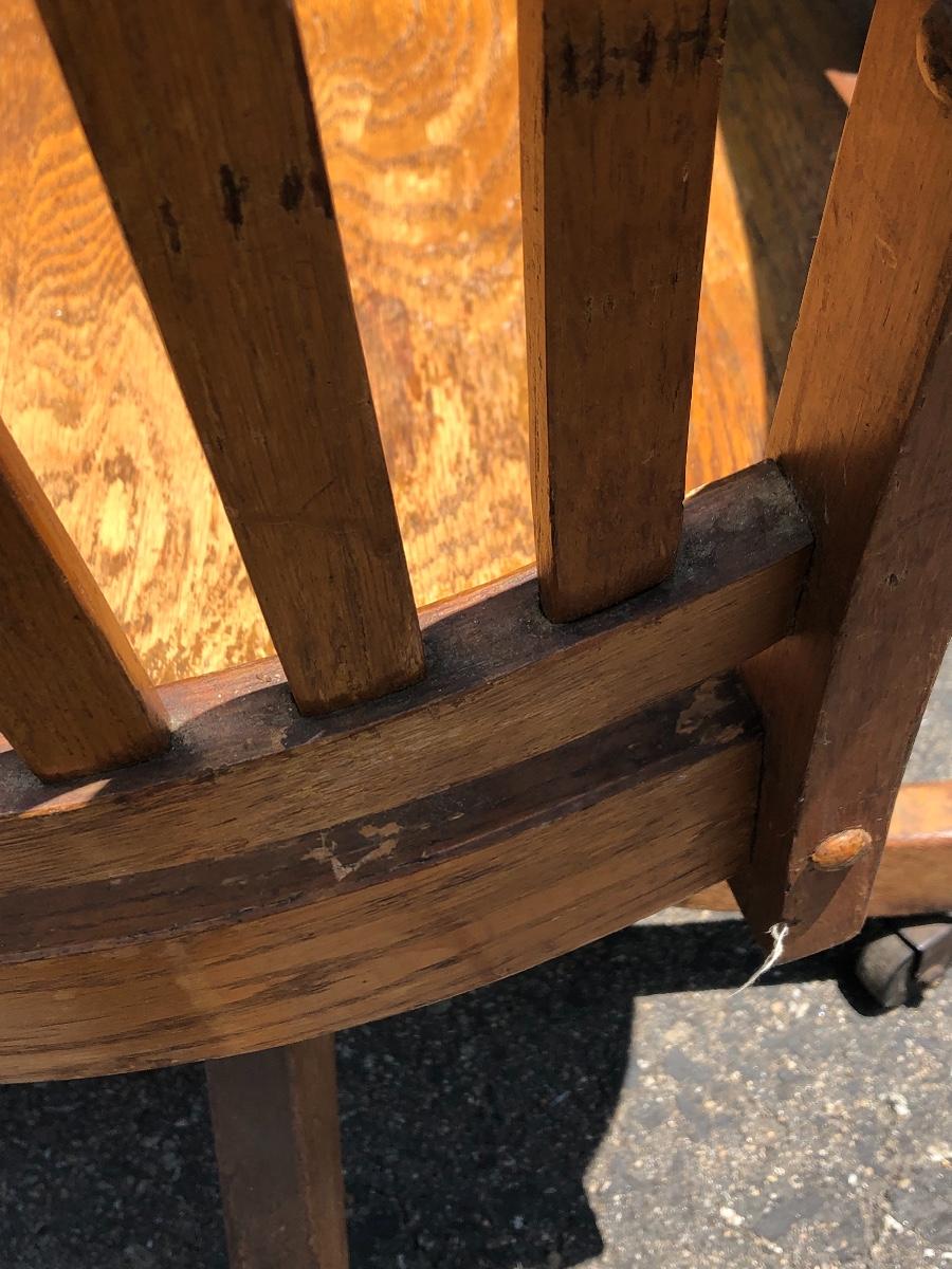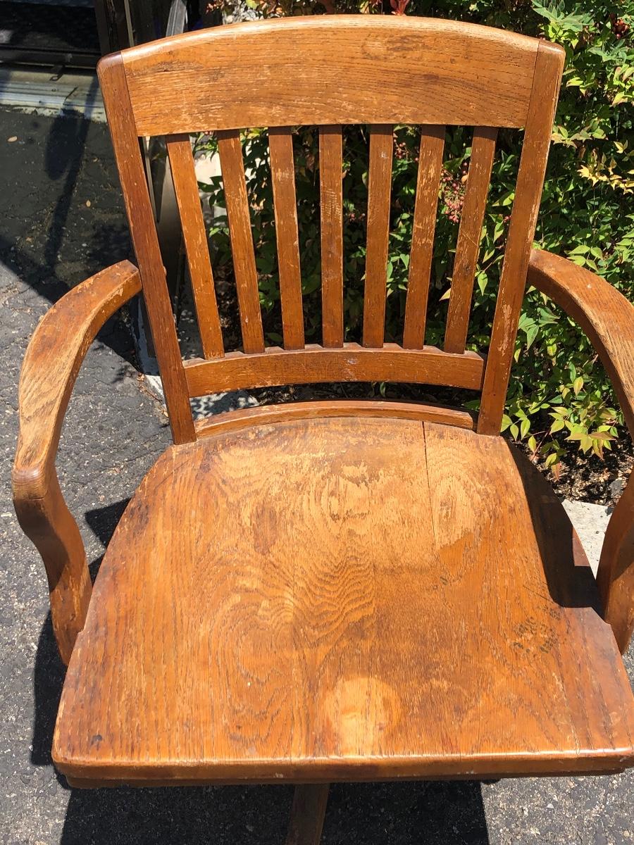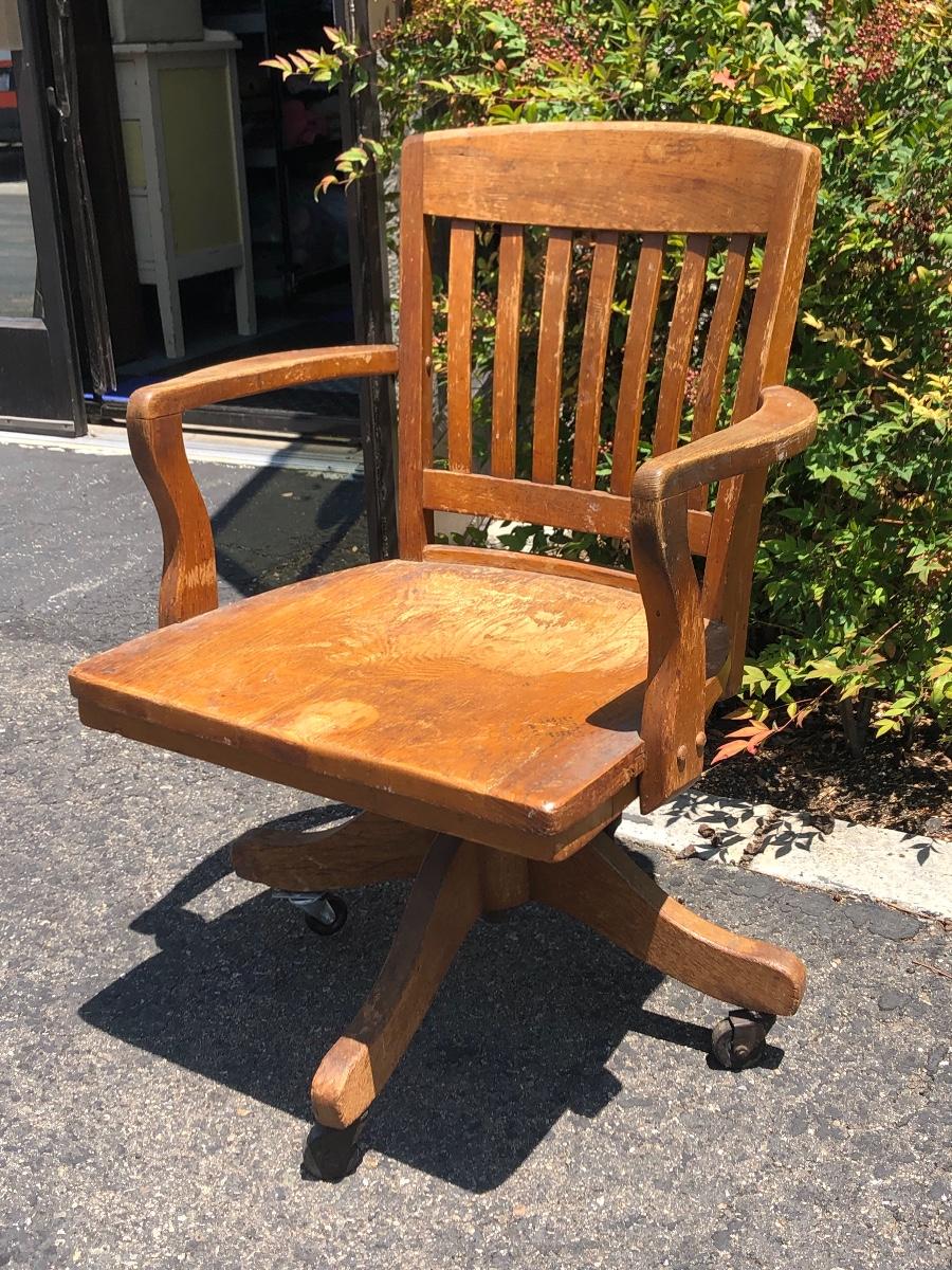 Vintage oak wood banker's desk chair. On wheels, moves nicely. Does have some signs of age and wear, good as is, great for refinish. One wheel is not original. Could not find any maker name on it.