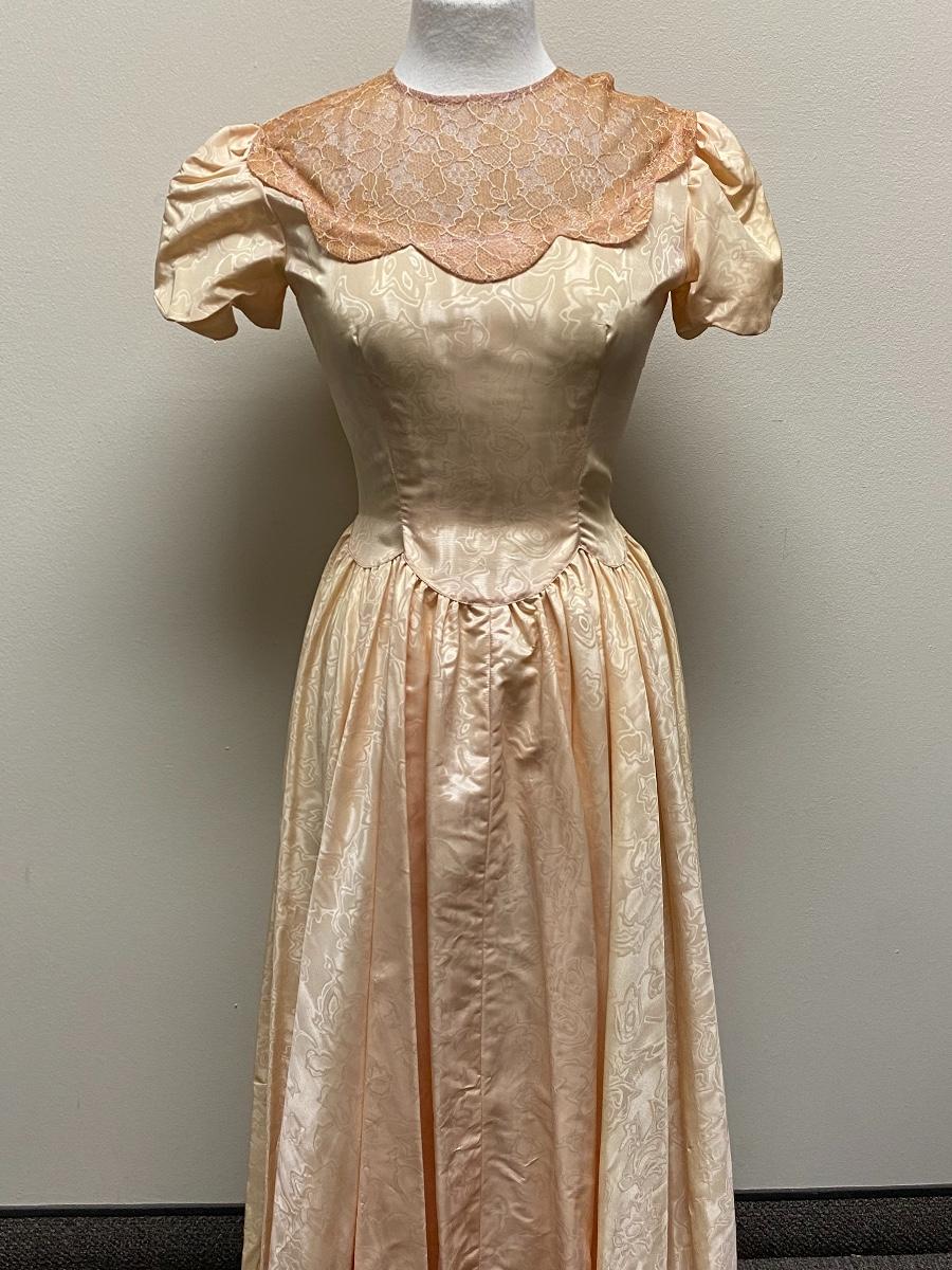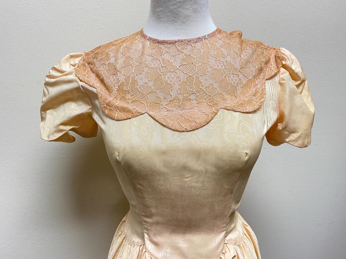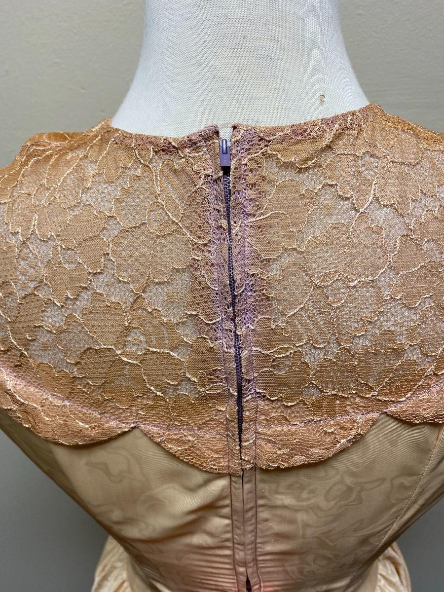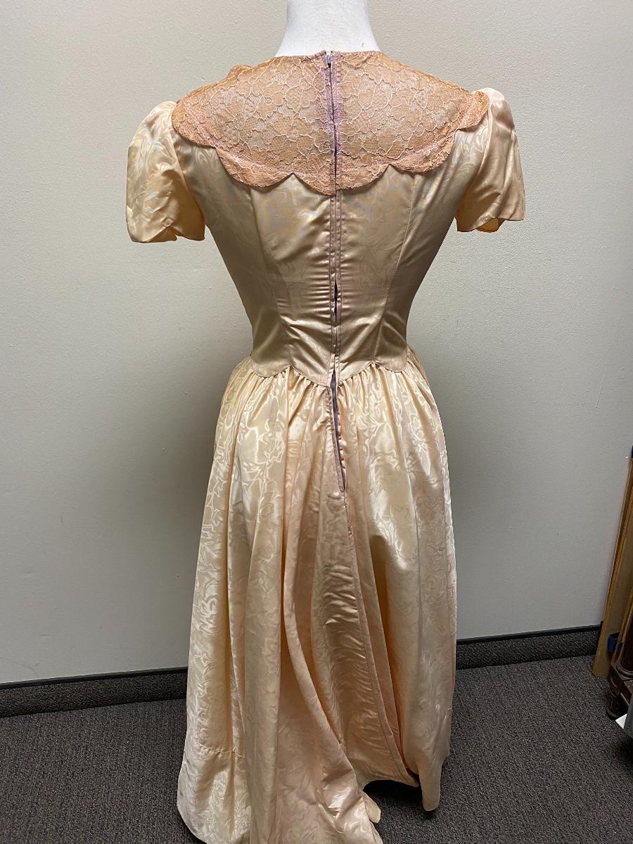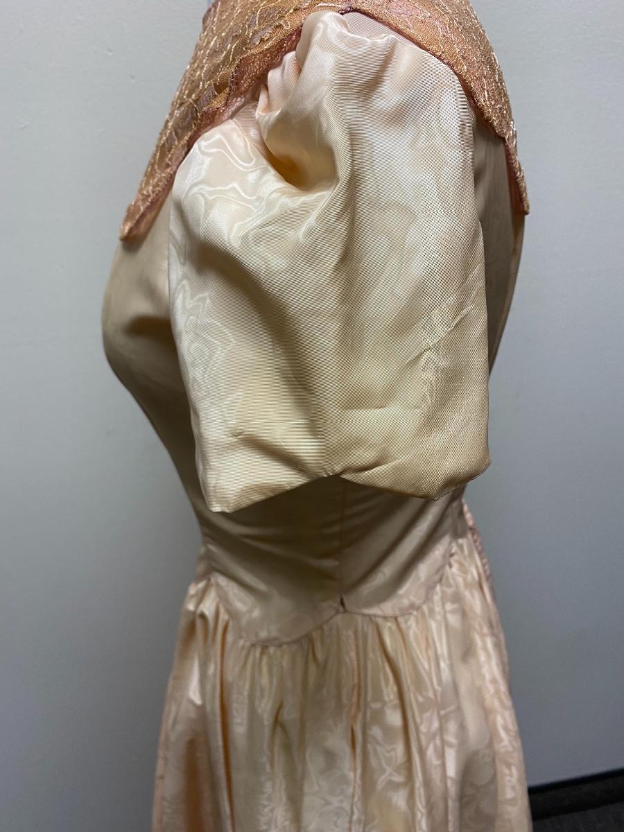Vintage handmade prom formal dress. Scalloped sleeves, lace neckline. The color looks faded from age, hard to tell what original color might be. Looks peachy pink but the stitching and zipper look lavender. No holes. Gonna guess it is a size small by the way it fit the mannequin.