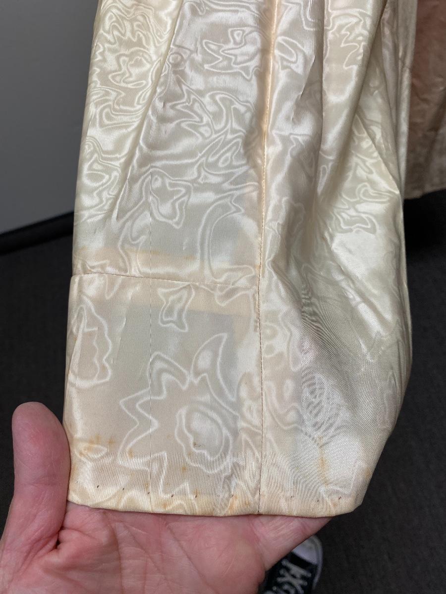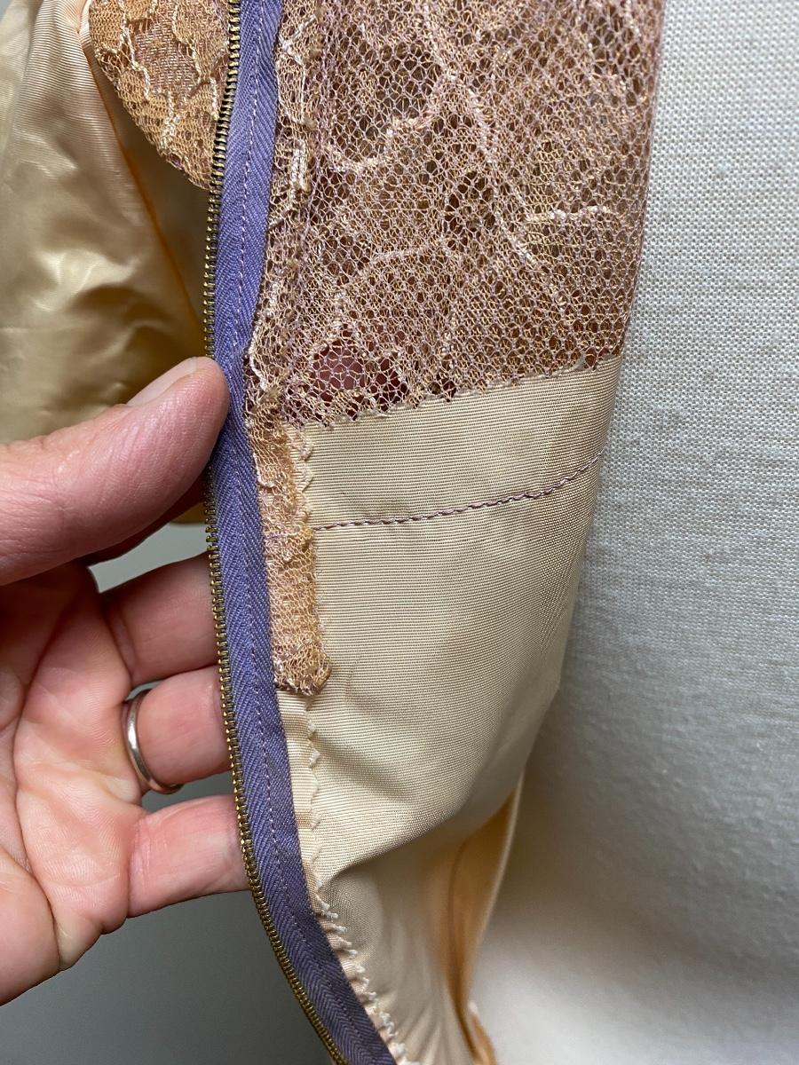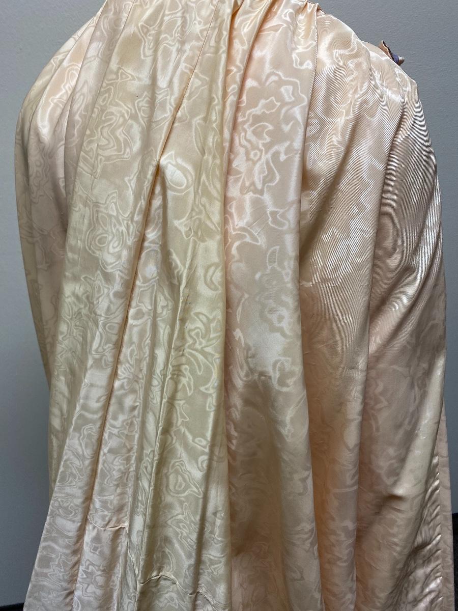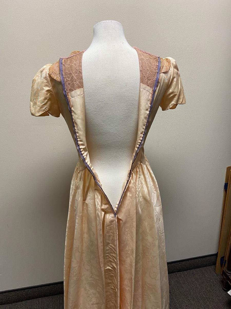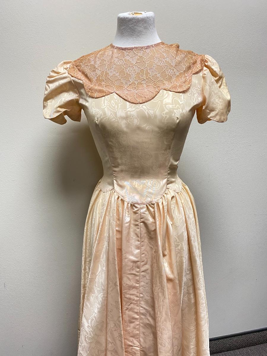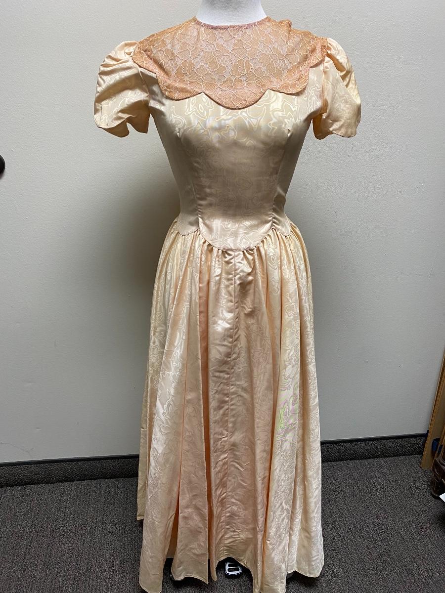 Vintage handmade prom formal dress. Scalloped sleeves, lace neckline. The color looks faded from age, hard to tell what original color might be. Looks peachy pink but the stitching and zipper look lavender. No holes. Gonna guess it is a size small by the way it fit the mannequin.