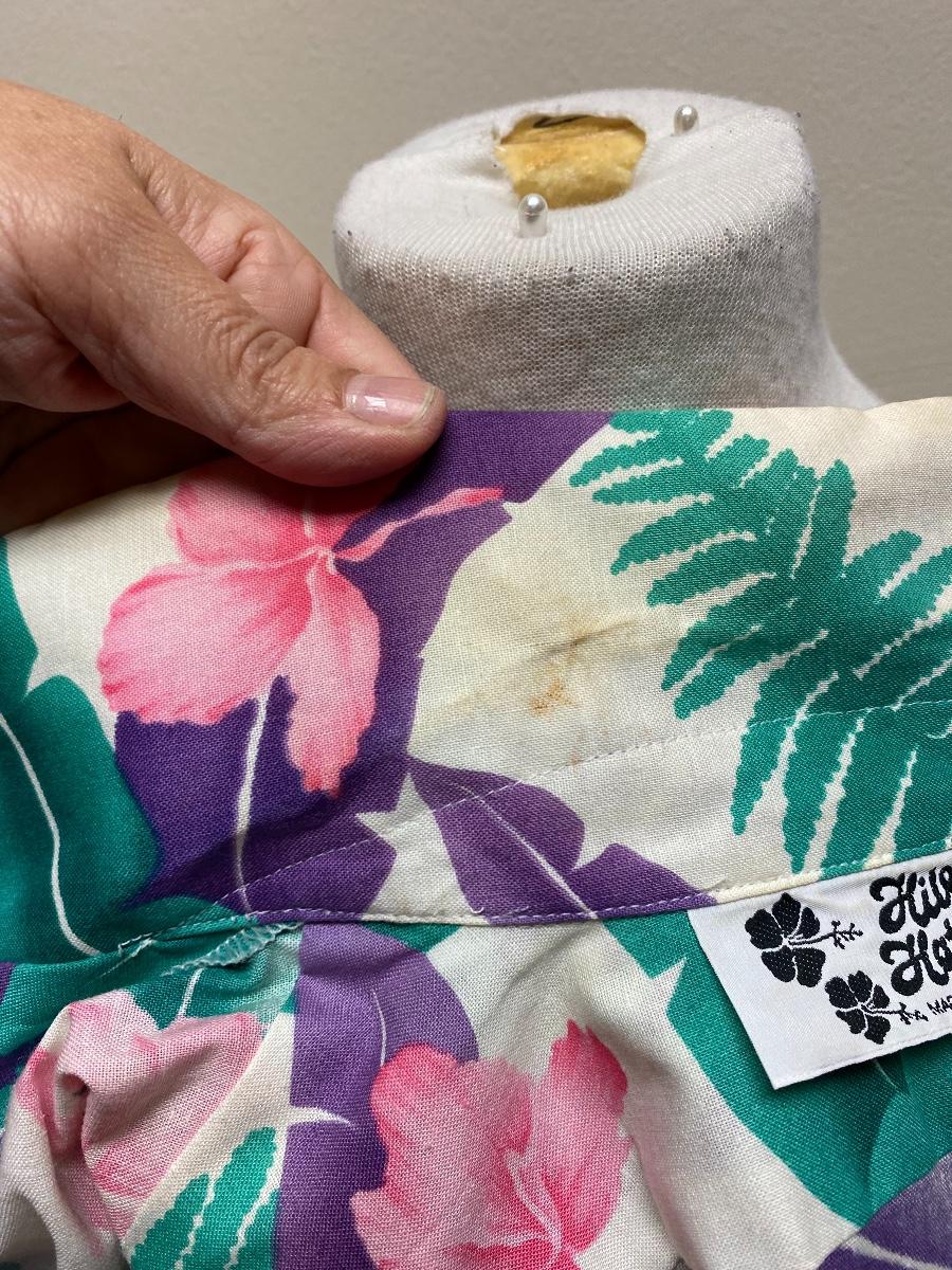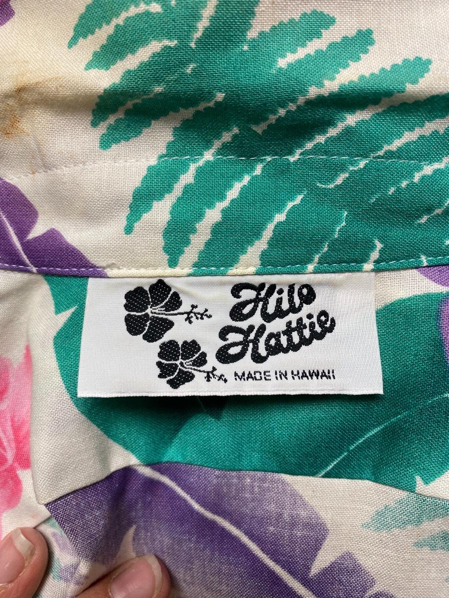 Hilo Hattie ladies button front Hawaiian shirt. Some discolor on back of collar. No size tag possibly a medium.