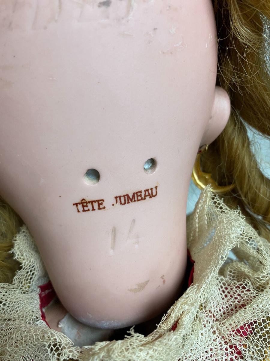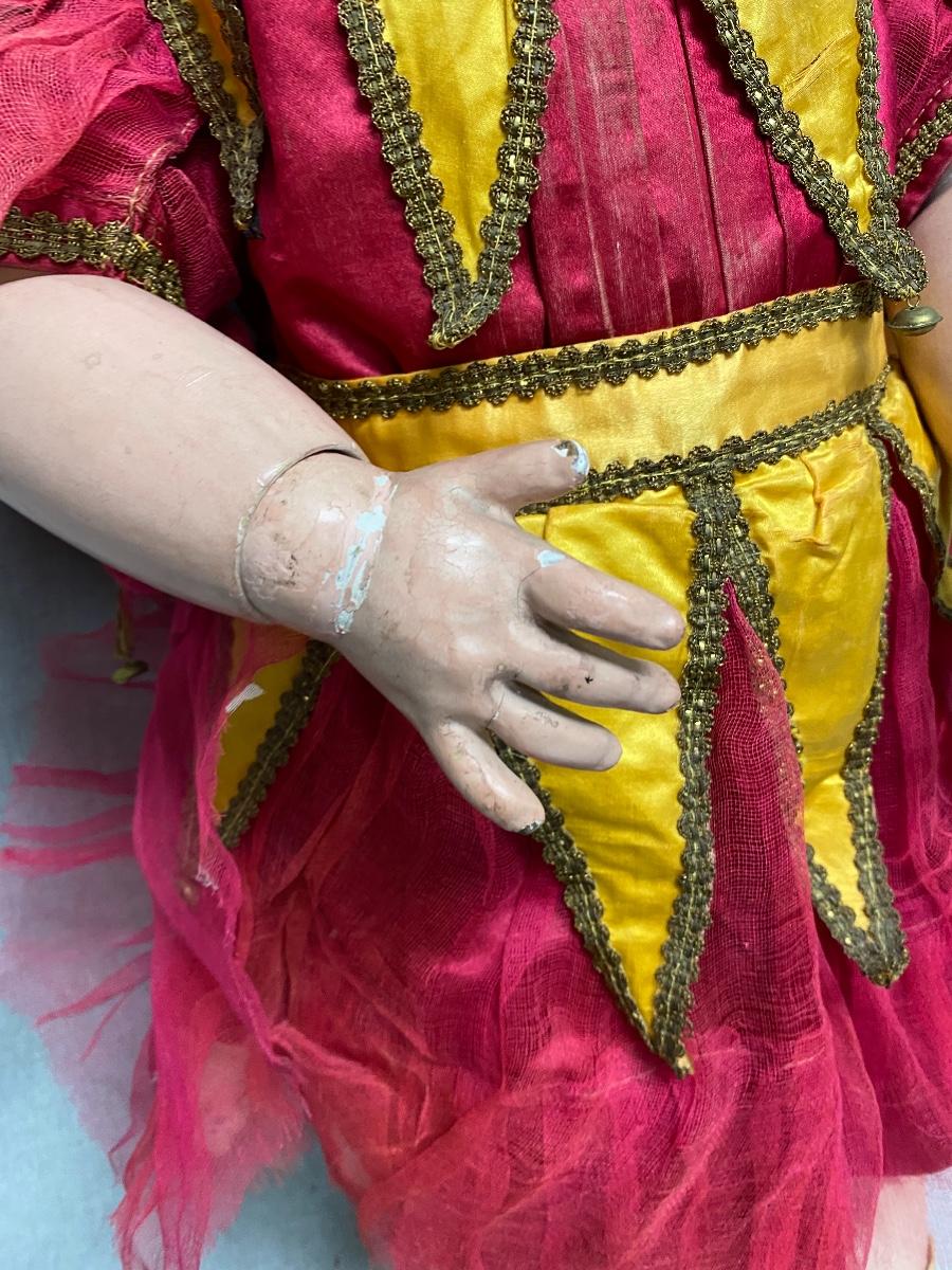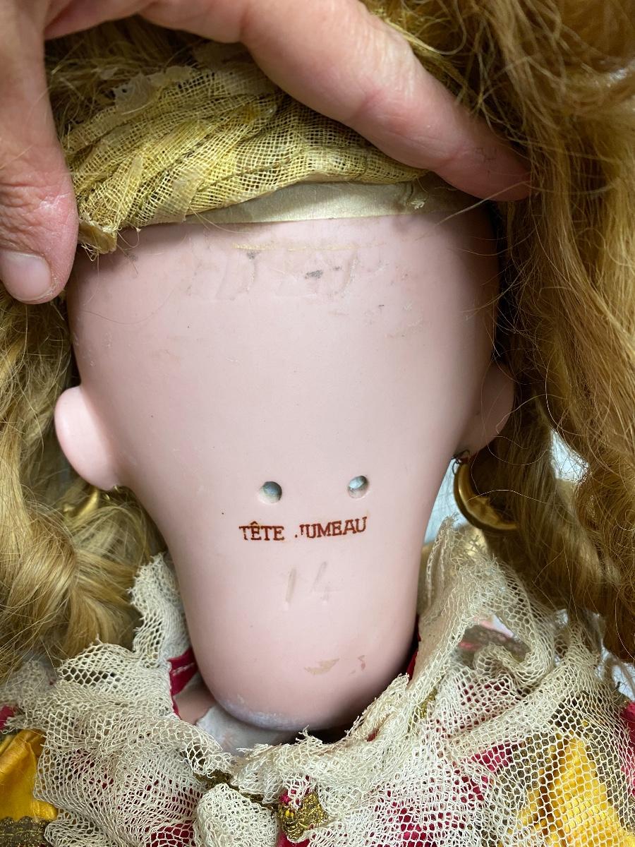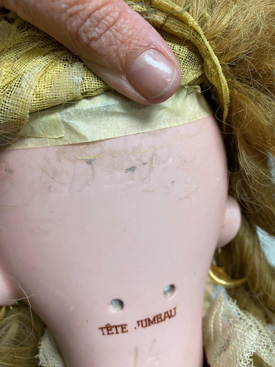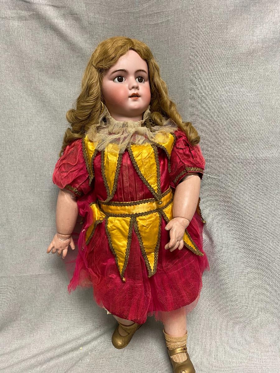 32" bisque and composite Bebe Jumeau doll, SFBJ era. Head is marked DEP 14 with Tete Jumeau stamped in red. Kind of chunky looking. Wearing a red and yellow jester harlequin outfit. Some light wear from age to composite. I actually found this doll on a blog spot from Dolls from the Attic (http://dollsfromtheattic.blogspot.com/2010/10/when-witches-go-riding.html) Previous owner purchased this doll from Carmel Doll Shop. Body has a hole in back.